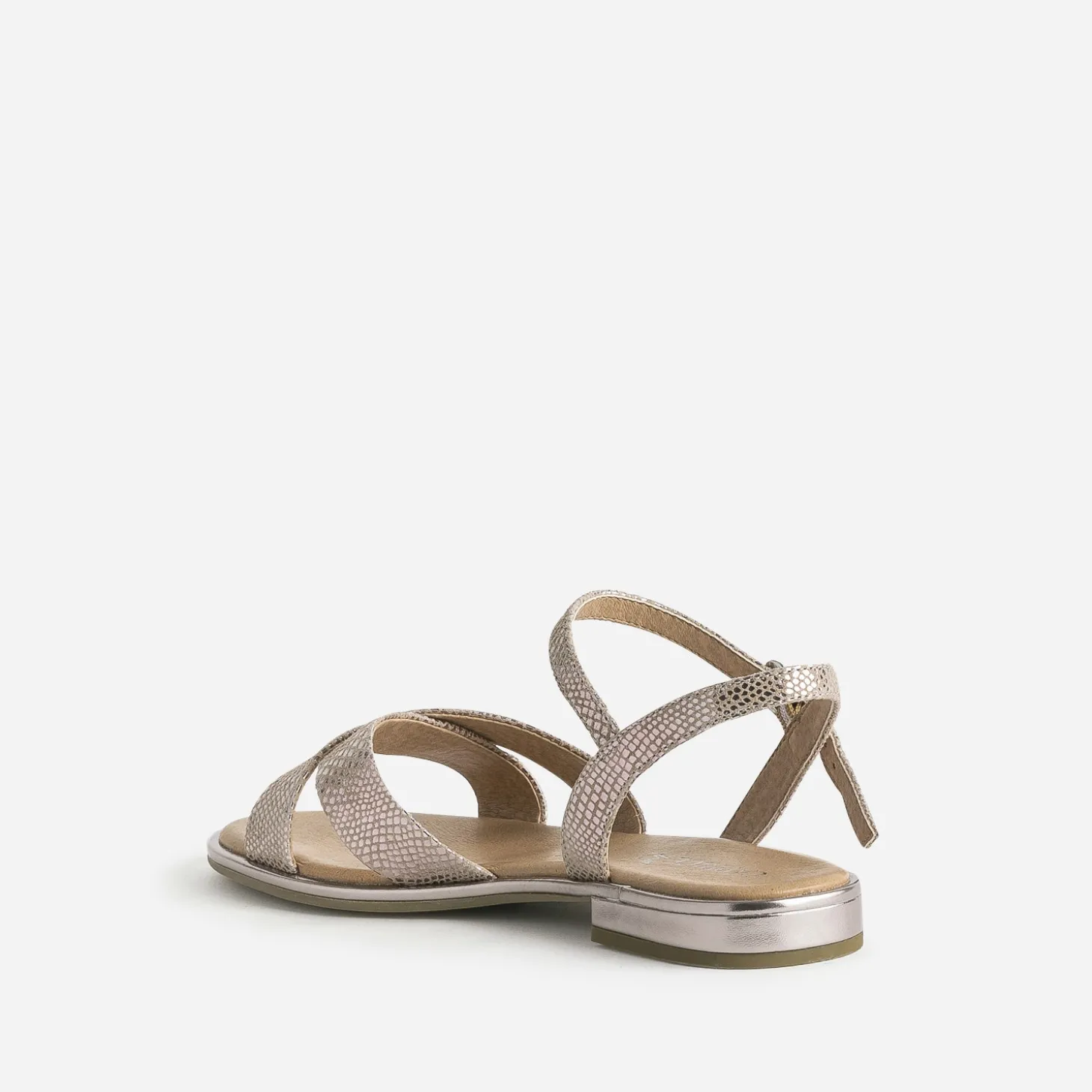 A l’heure où les beaux jours et la chaleur reviennent, faites l’expérience d’une sandale qui sublime et soulage le pied. Une fine bride autour de la cheville, deux larges brides croisées au-dessus du pied, elle présente une doublure cuir et une première moussée. Un modèle décliné en coloris doré avec effet python verni, qui sublime instantanément vos tenues.