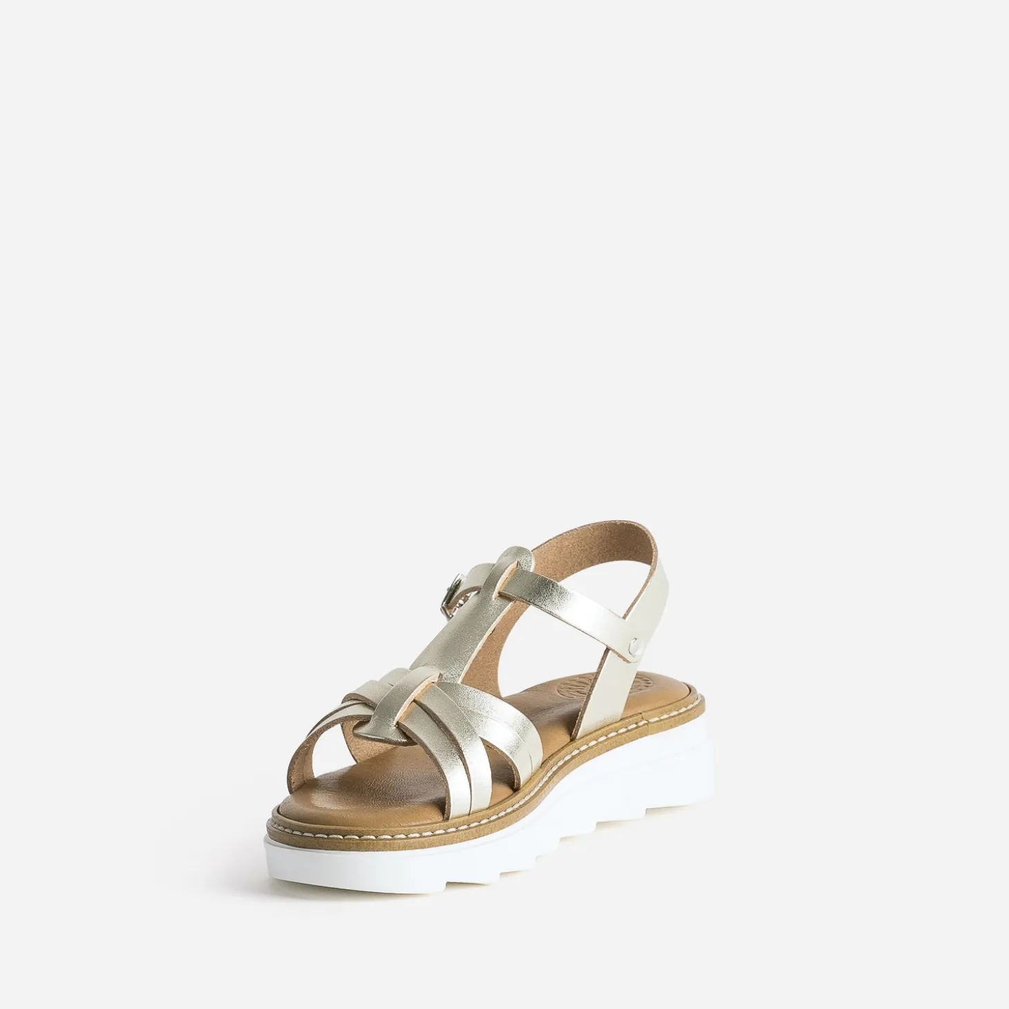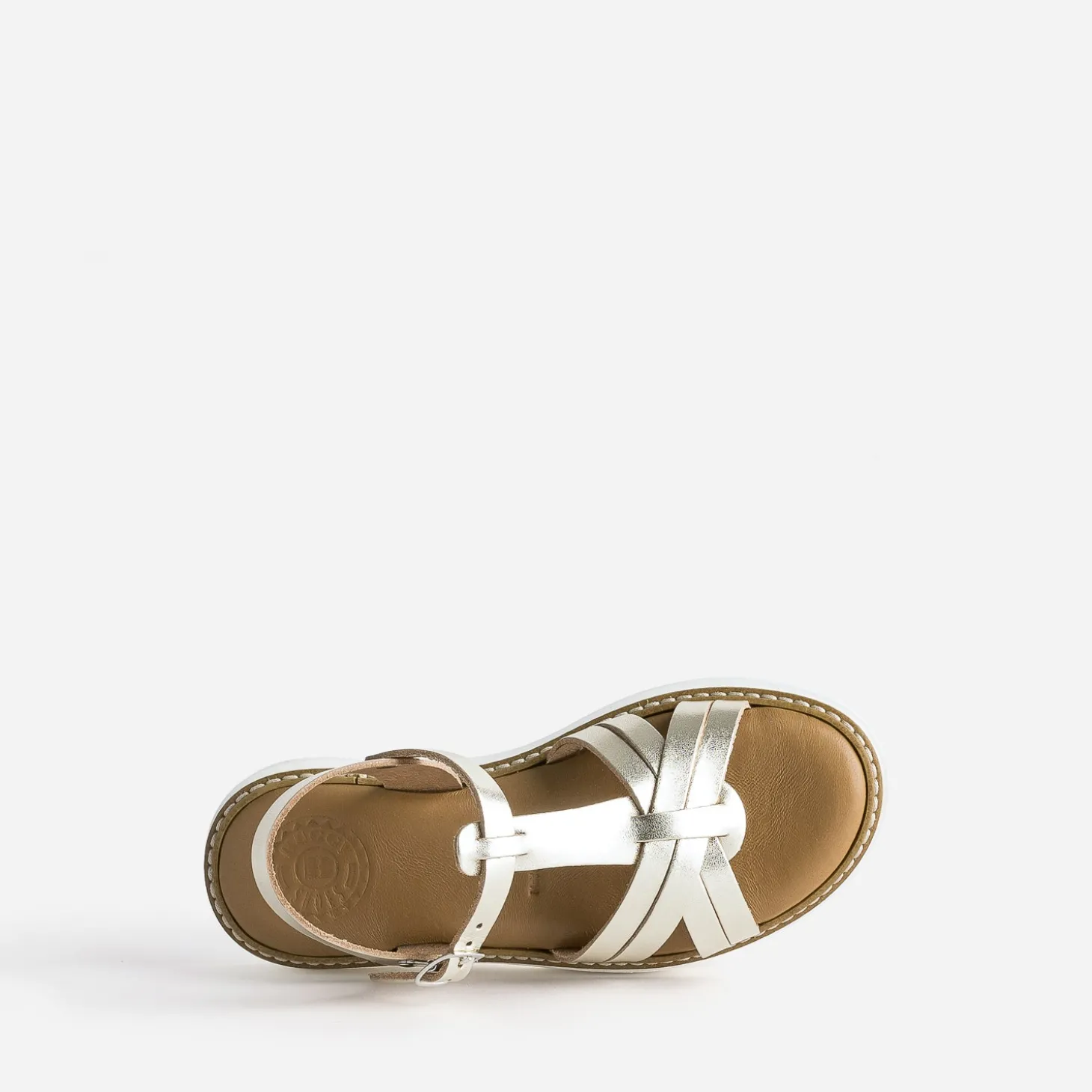 Compensée juste comme il faut (3 cm), cette sandale va séduire les petites filles. En cuir lisse, elle opte pour un coloris doré sur les brides et la semelle extérieure ; une semelle crantée pour une meilleure adhérence. A l’intérieur, la semelle première est moussée pour un confort inégalé. Un modèle à associer avec un combi-short en jean bleu ou bien un look graphique en duo de noir et blanc.