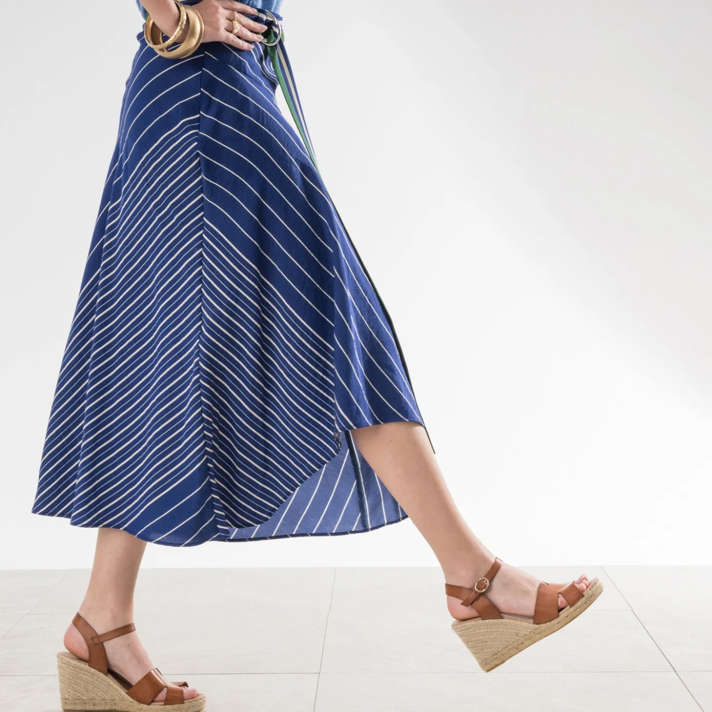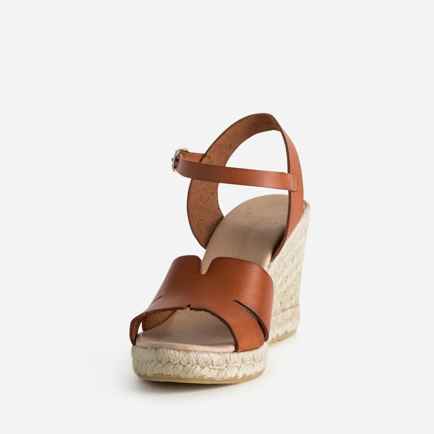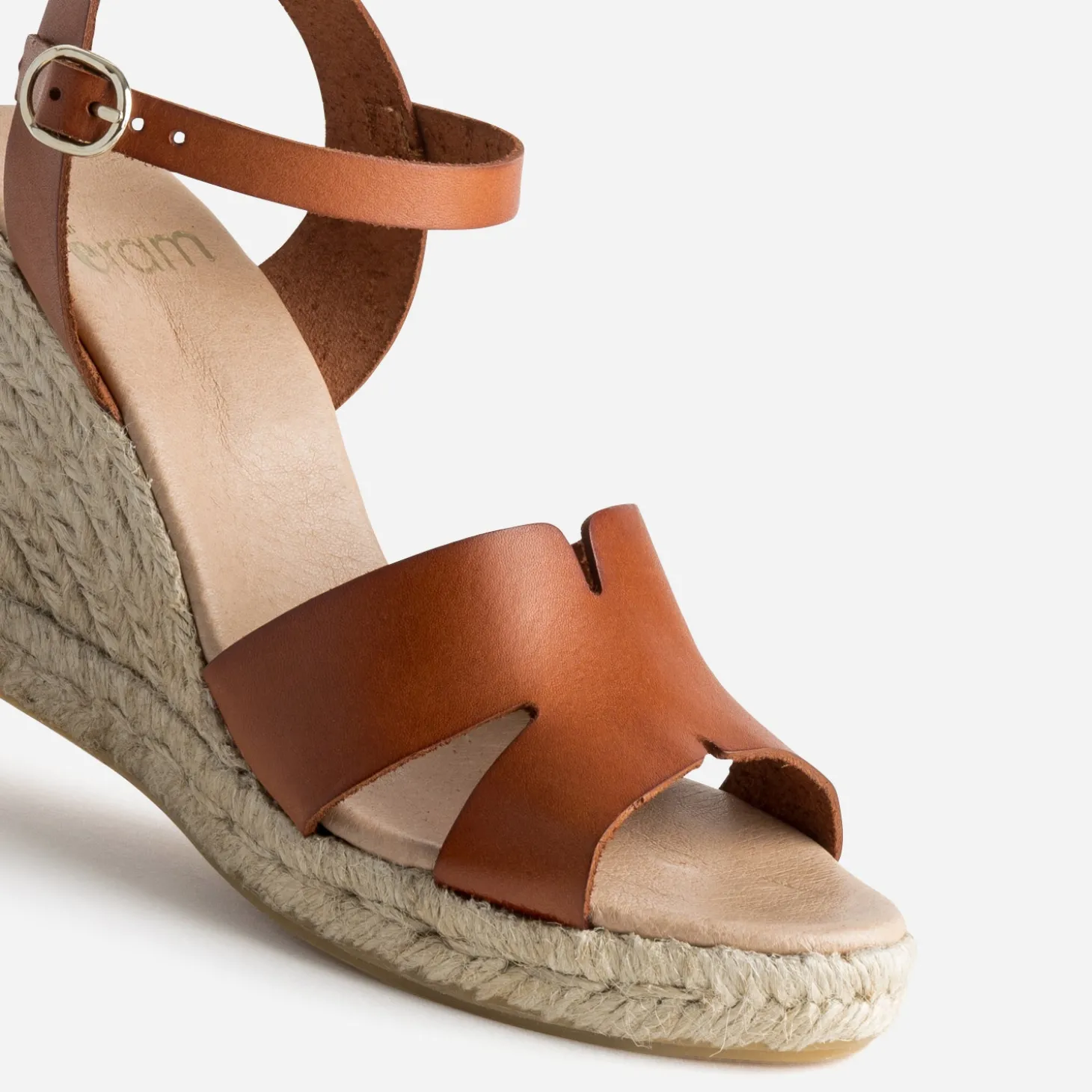 Redécouvrez le confort et l’élégance d’une sandale compensée pour femme. Avec un talon de 9 cm et un patin avant de 2 cm, elle offre un maintien parfait et une démarche agréable. Elle présente, sur le dessus, une large bride à découpes placées en cuir lisse cognac et une semelle en corde naturelle. Un modèle idéal pour le printemps et l’été, complété d’un débardeur marinière sur un short en jean beige, une ceinture cognac et un panier en guise de sac.