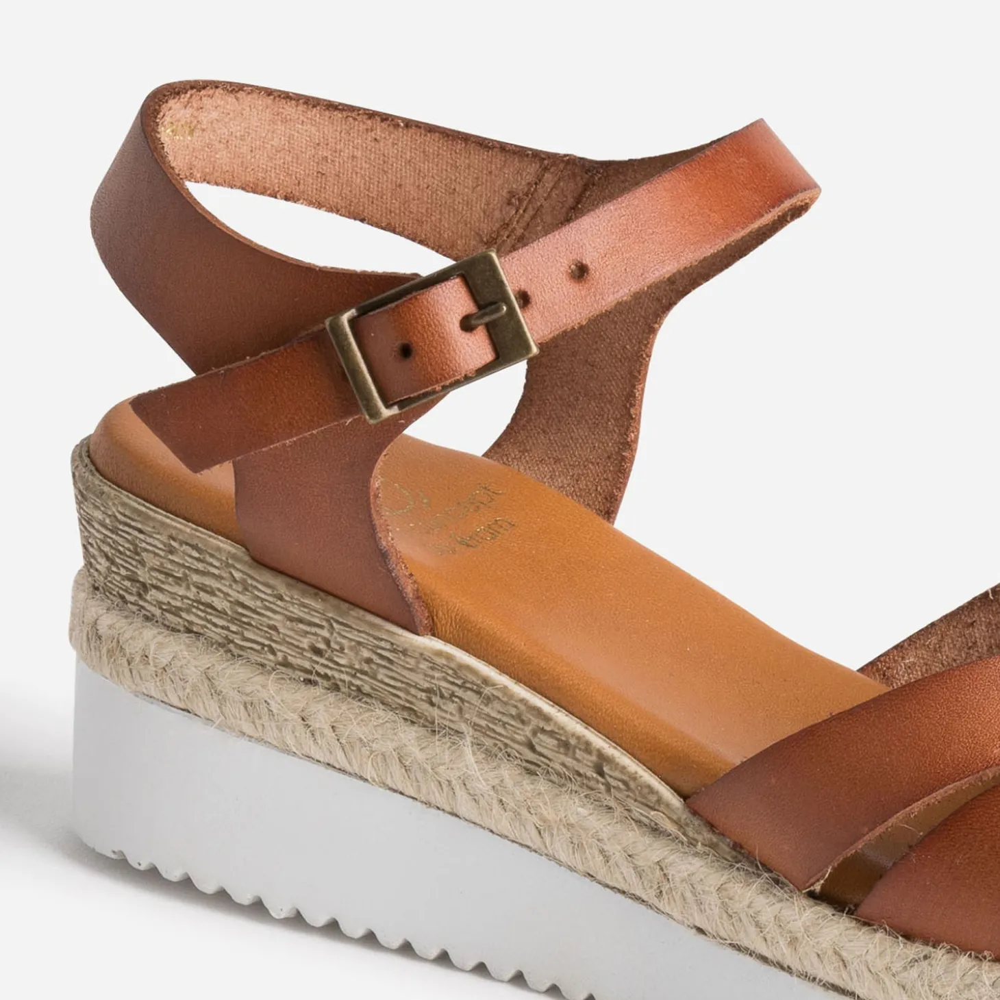 Modèle iconique des collections estivales, la sandale compensée n’a pas dit son dernier mot. Confectionnée avec des brides croisées en cuir cognac, elle est montée sur un talon qui mixe matière synthétique et tresse en corde sur semelle crantée. Idéale au quotidien, avec une tenue décontractée.