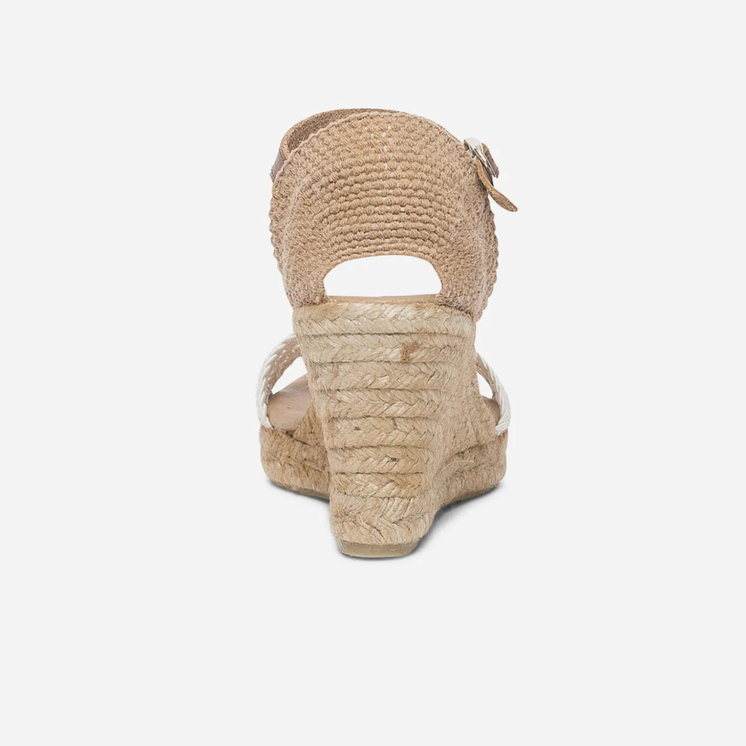 L’esprit croisière anime cette sandale compensée pour femme. Montée sur un talon en corde de 9 cm, avec patin avant de 2 cm, elle maintient le pied, à l’avant par une large bride écrue tressée, à l’arrière par une tige souple en coton biologique certifié GOTS marron, à la cheville par une bride synthétique camel. Un modèle à porter avec un tailleur-short ou bermuda, en lin, dans des teintes naturelles ou pastel.