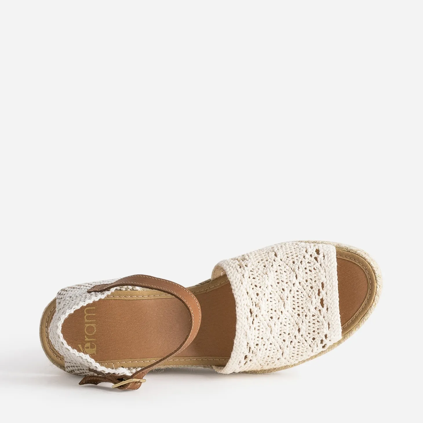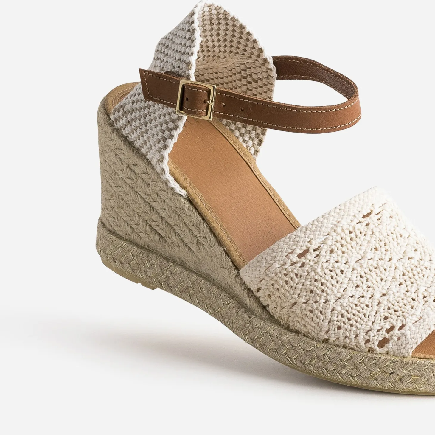 Assumez votre envie de style bohème chic avec une sandale compensée en corde. La large bride du dessus est confectionnée en textile écru façon macramé. Un modèle idéal avec un caraco à fines bretelles et un jupon long, dans les tons naturels, blanc cassé ou beige.