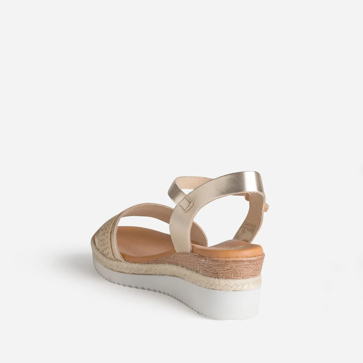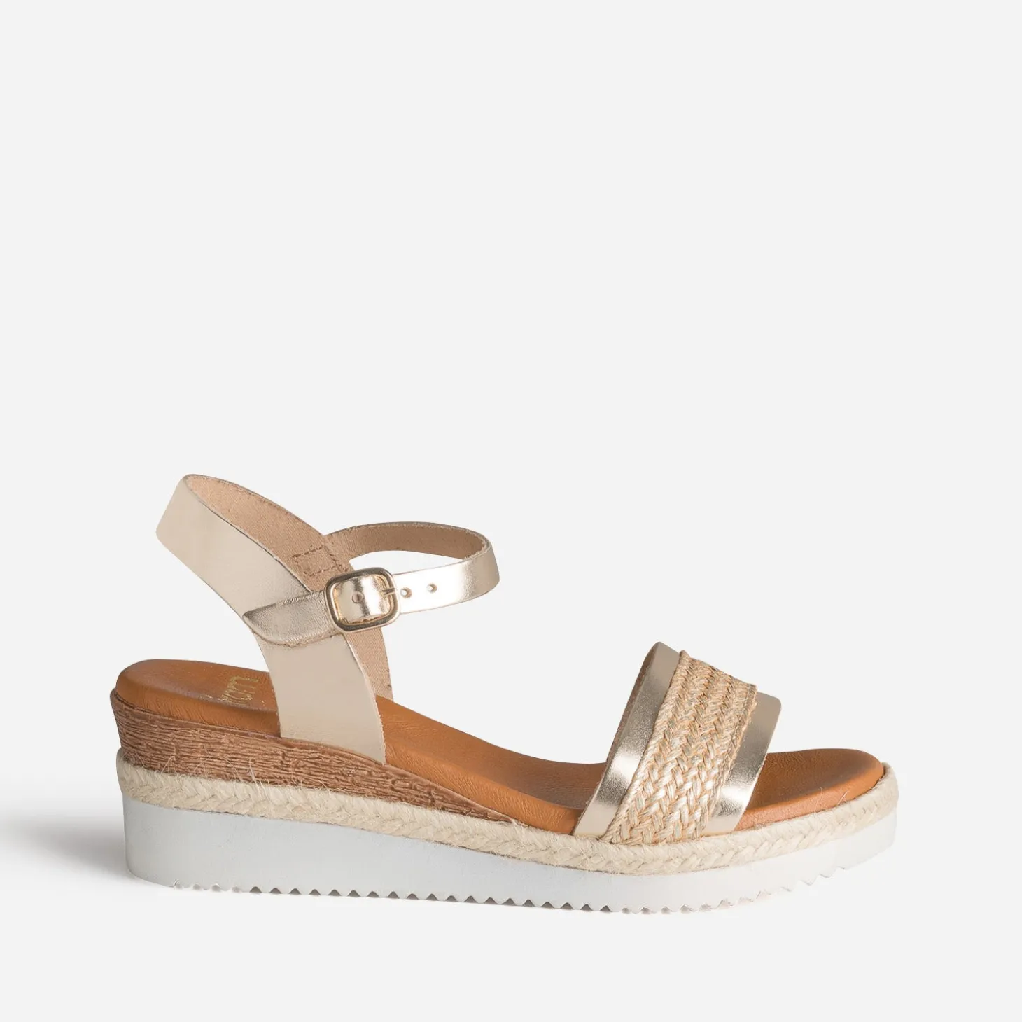 Mix de matières étudié pour cette sandale femme. Cuir doré et tressage effet raphia s’associent sur la large bride qui maintient l’avant du pied. Semelle première moussée et semelle compensée avec apport de corde se conjuguent pour un maximum de confort. Un modèle à porter avec un combi-short en lin kaki, des bijoux en bois et un panier en paille en guise de sac à main.