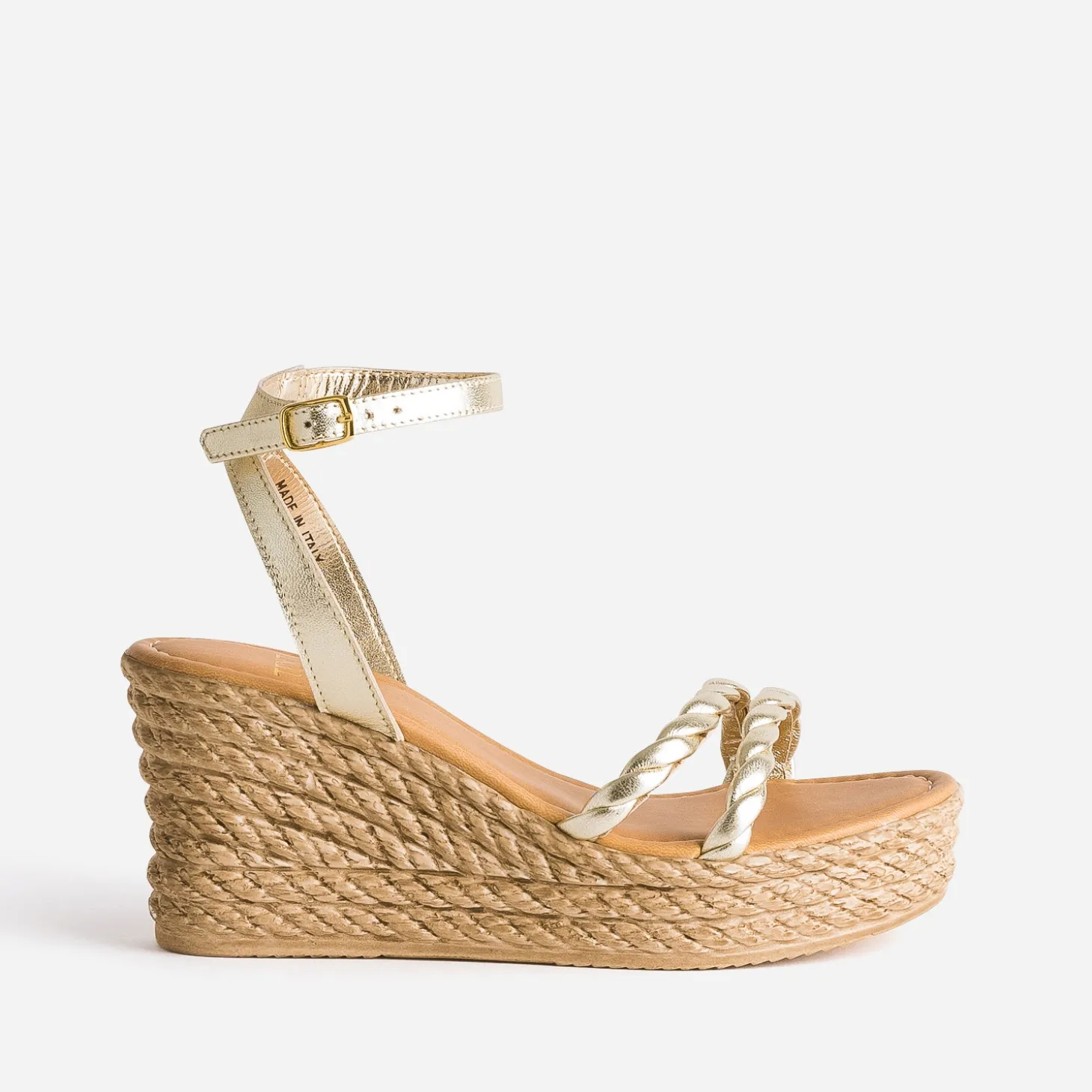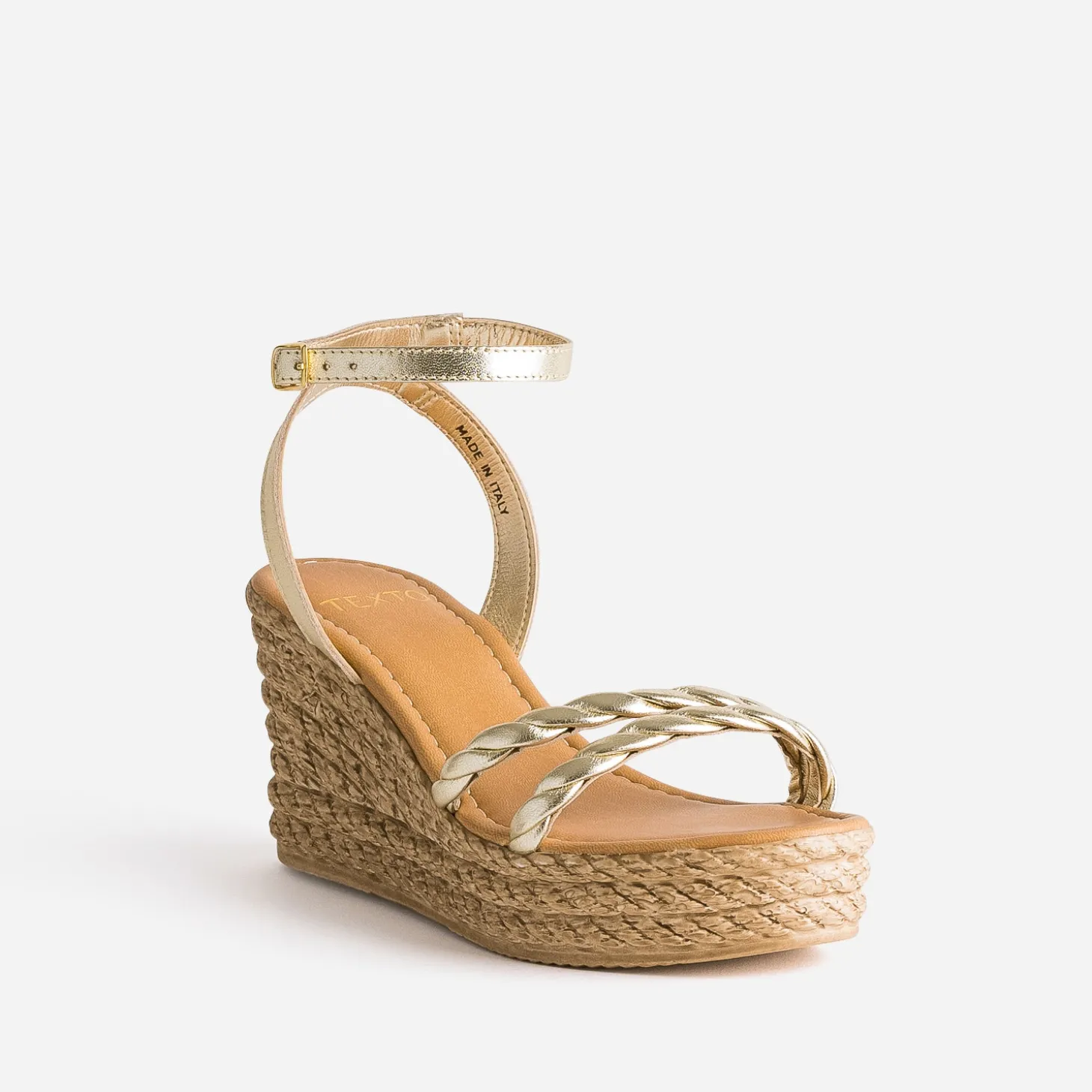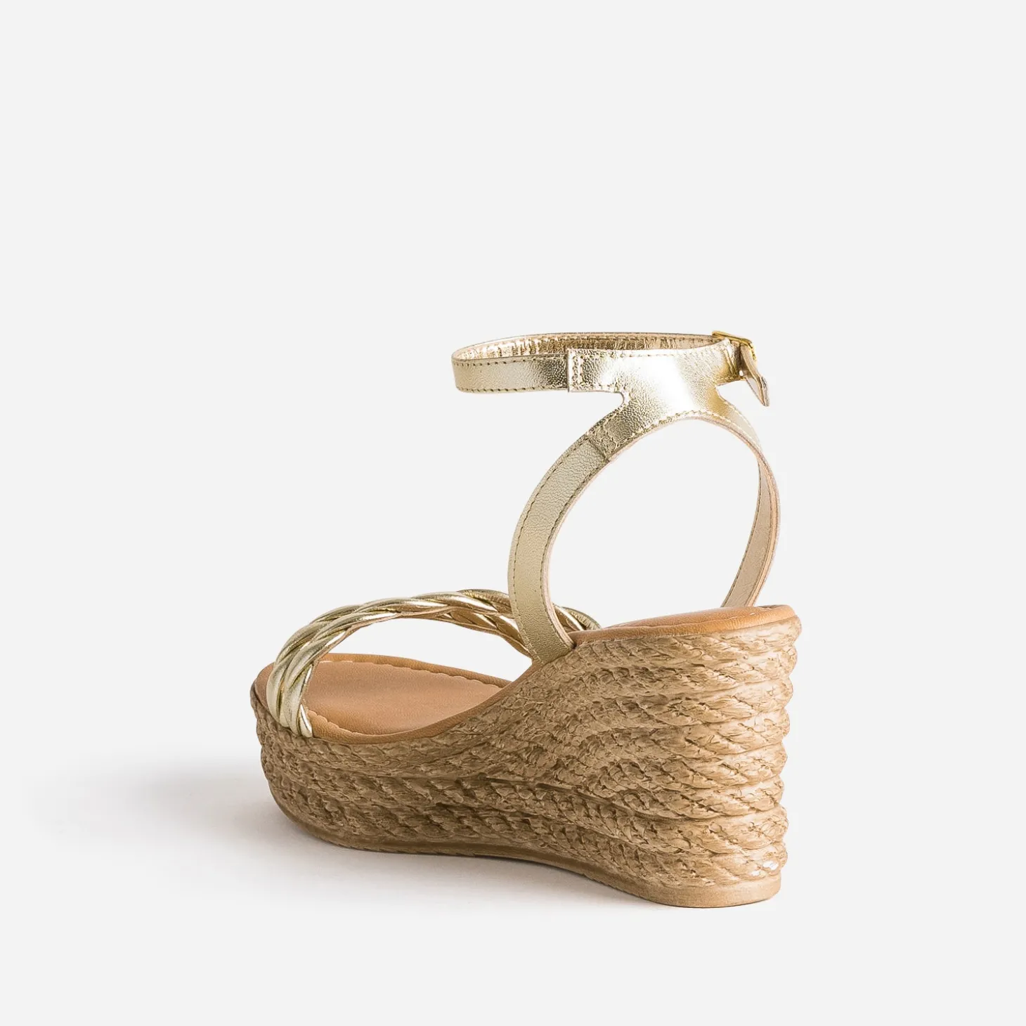 Cette sandale pour femme apporte du chic à toutes les tenues d’été. D’abord par son coloris doré, ensuite par ses brides en cuir, tressées ou lisses, et enfin par son talon compensé imitation corde. Un modèle qui s’adapte très facilement aux cérémonies comme au quotidien.