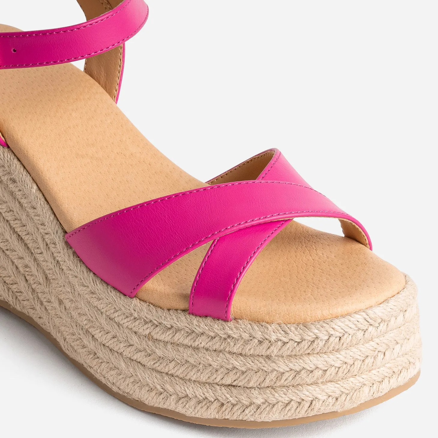 L’invention parfaite pour gagner des centimètres sans risques ? C’est la sandale compensée, avec plateforme. Ici, la semelle de 9 cm à l’arrière et de 4 cm à l’avant est entièrement recouverte de corde naturelle. Dessus, les brides en matière synthétique se déclinent en coloris rose fuchsia avec finition mate. A vous les jolies robes dans les nuances de bleu, de vert ou de rose.