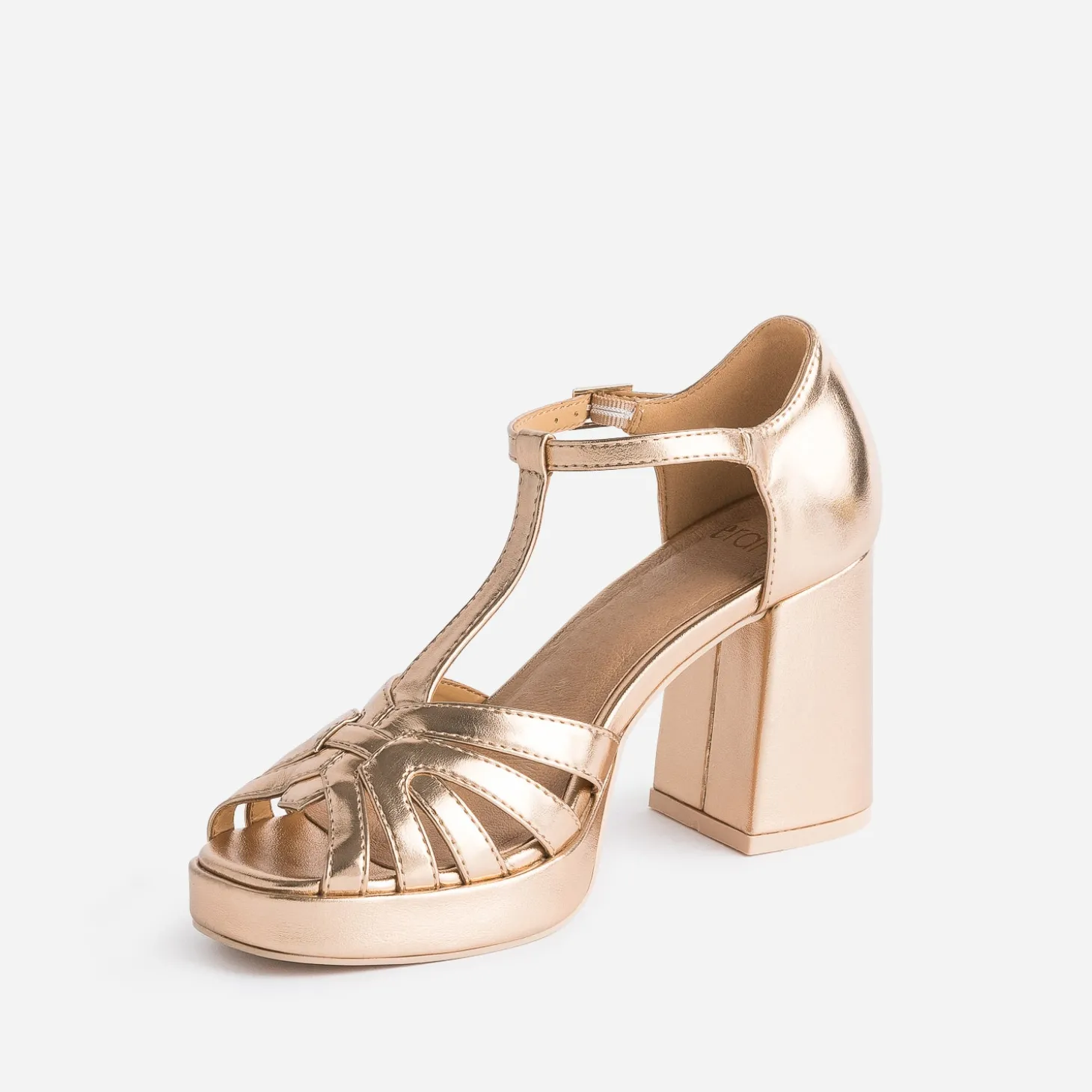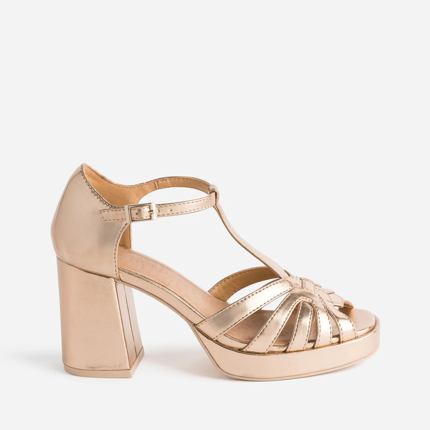 Esprit salomé par sa bride en T, esprit disco par son talon large et sa plateforme à l’avant, esprit rétro par ses brides entrelacées : 10/10 pour cette sandale noire, qui prône la féminité. En matière synthétique rose cuivré, elle présente une finition légèrement glacée. Allégez le look pour équilibrer les volumes : préférez les fines bretelles ou le décolleté en V, le pantalon large cropped ou la jupe midi.
