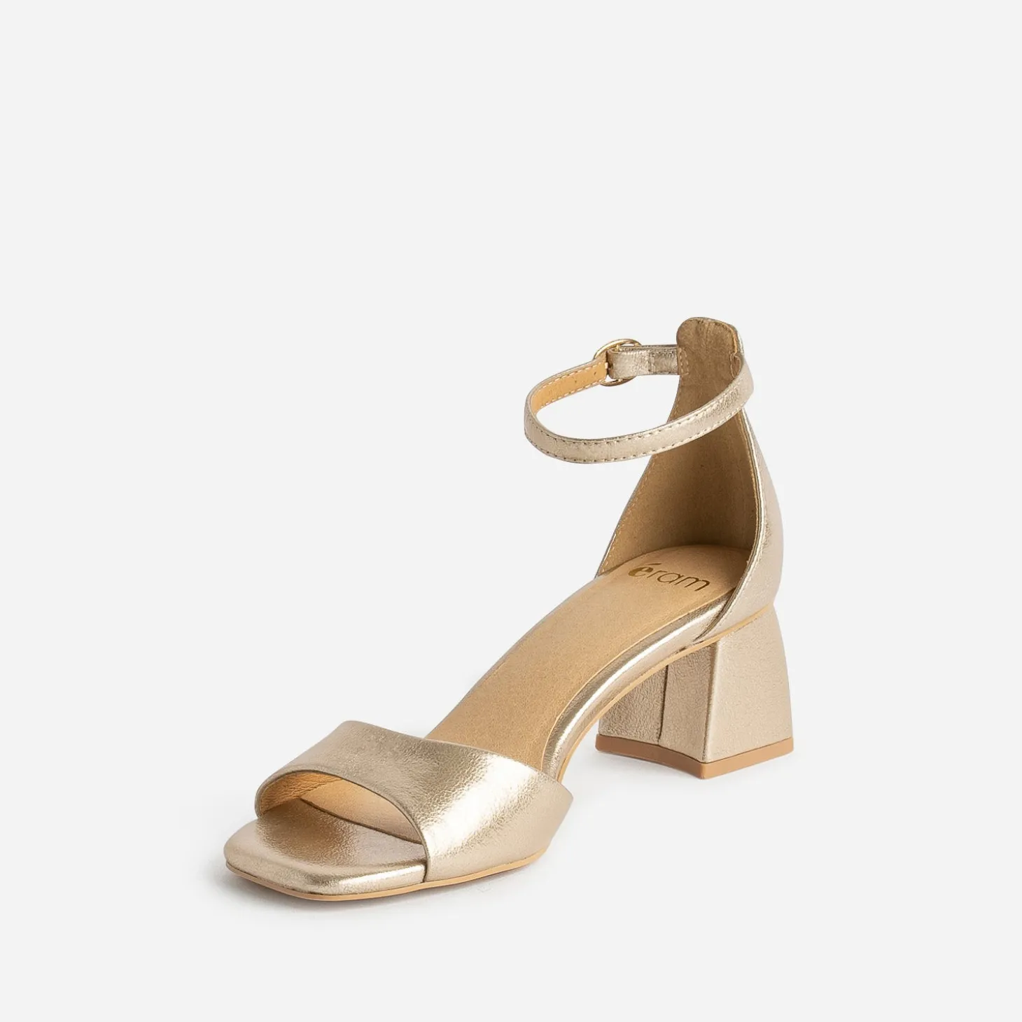 Une sandale dorée, et c’est toute la tenue qui gagne en chic ! Ce modèle femme mise aussi sur le confort : semelle première moussée, talon flare de 5,5 cm et tige montante pour maintenir l’arrière du pied. Le bout carré lui fait gagner en modernité. Avec une robe longue bleu roi ou vert foncé, et vous êtes ready pour la prochaine garden party.n