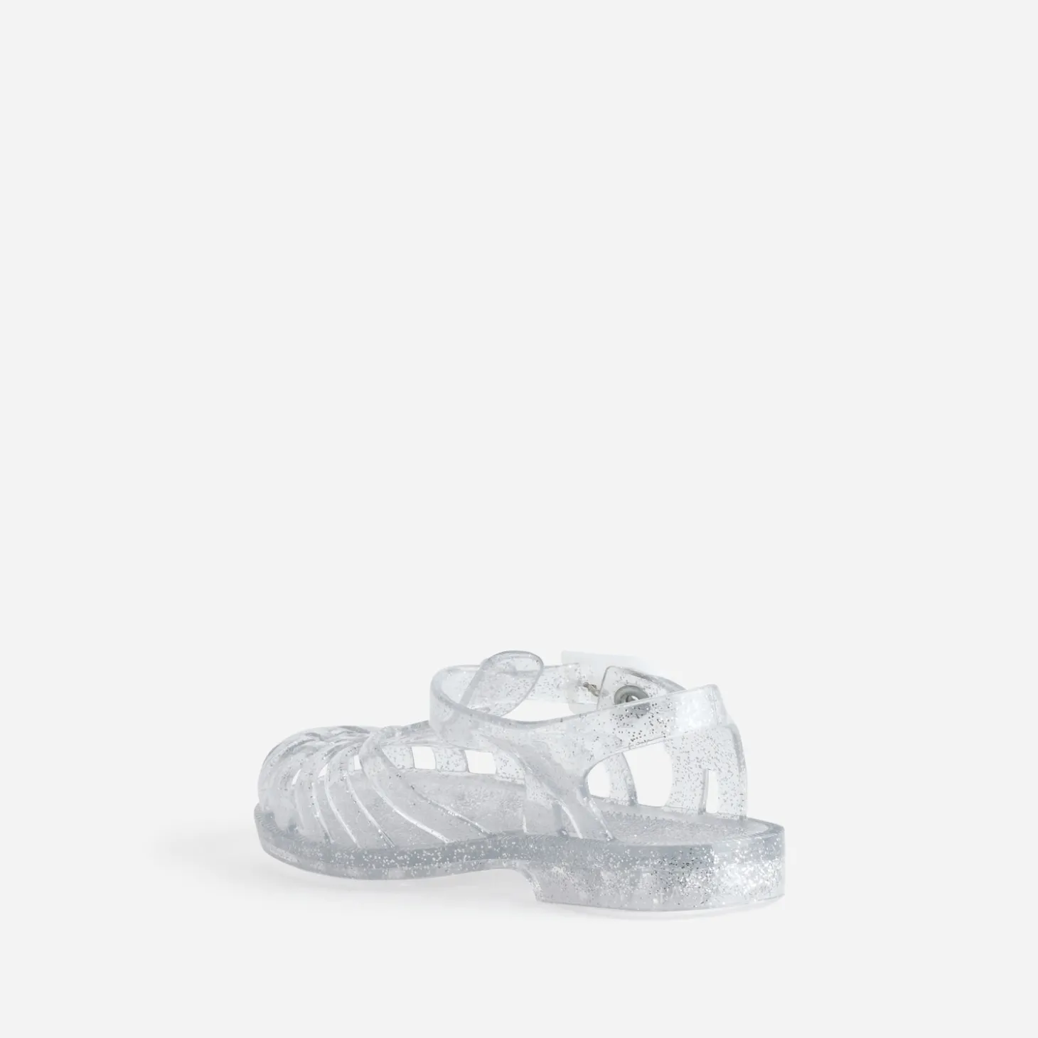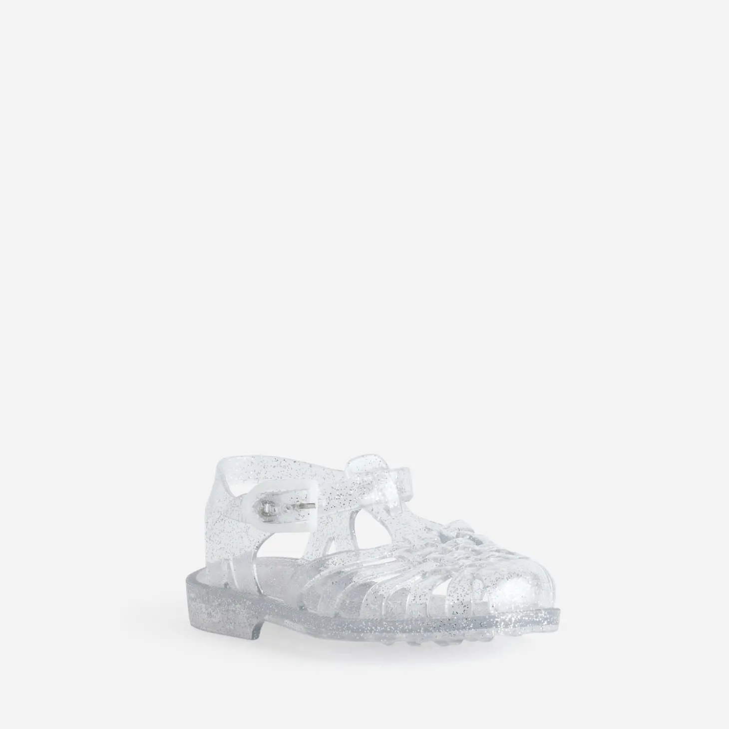 100% fabriquée en France, elle joue l’audace d’une matière transparente, rythmée de paillettes argentées, et se ferme par une bride à boucle. Un modèle enfant qui matche avec toutes les tenues d’été, du bitume jusqu’aux cocotiers !
