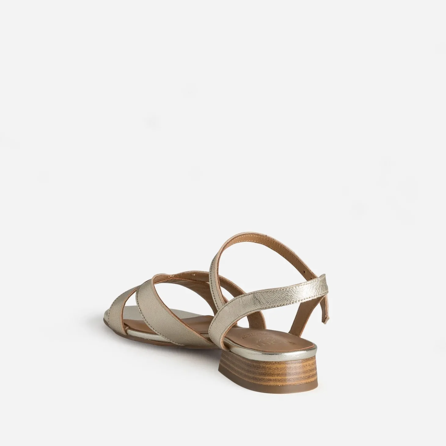 Nouvelle hauteur de talon de 2,5 cm pour la sandale femme. Elle est confectionnée en cuir métallisé doré et le pied est maintenu par des brides ajustées. Un modèle qui gagne en désirabilité, avec un look monochrome écru et des accessoires dorés.