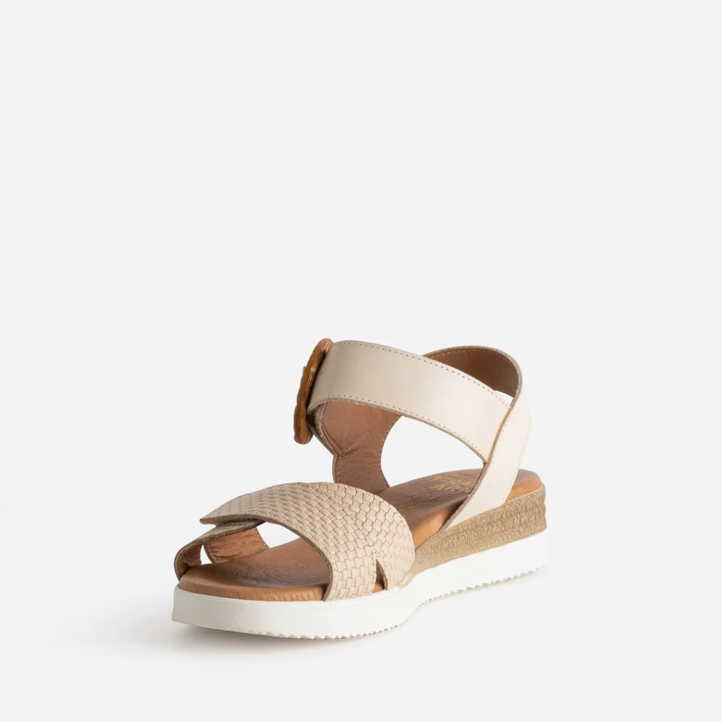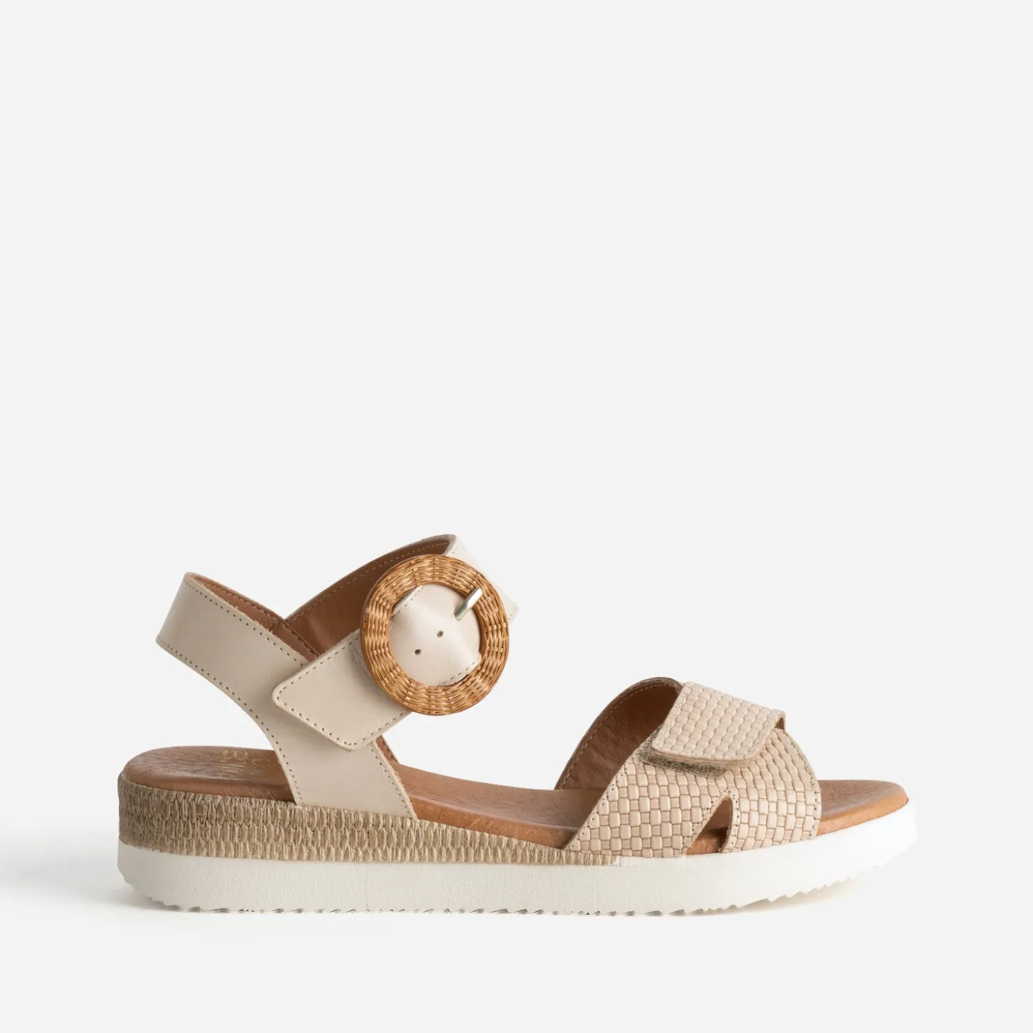 Les jeux de matières s’invitent sur cette sandale pour femme, en clin d’œil évident à l’artisanat : cuir embossé avec effet tressé, boucle façon rotin, semelle extérieure bi-matière légèrement compensée. Afin de ne pas négliger votre confort, elle est montée sur une semelle première moussée, avec bride ajustable par scratch. Un modèle en cuir beige, facile à accorder avec des nuances de marron.