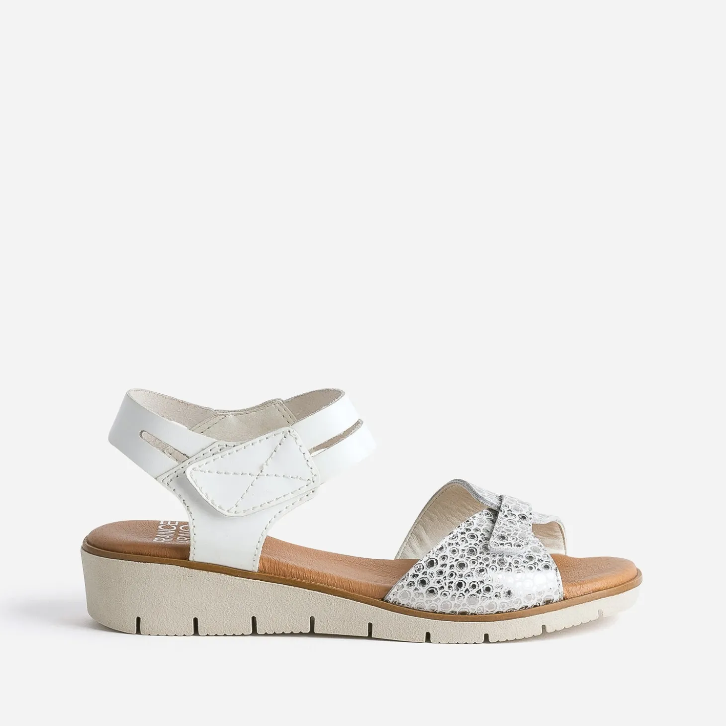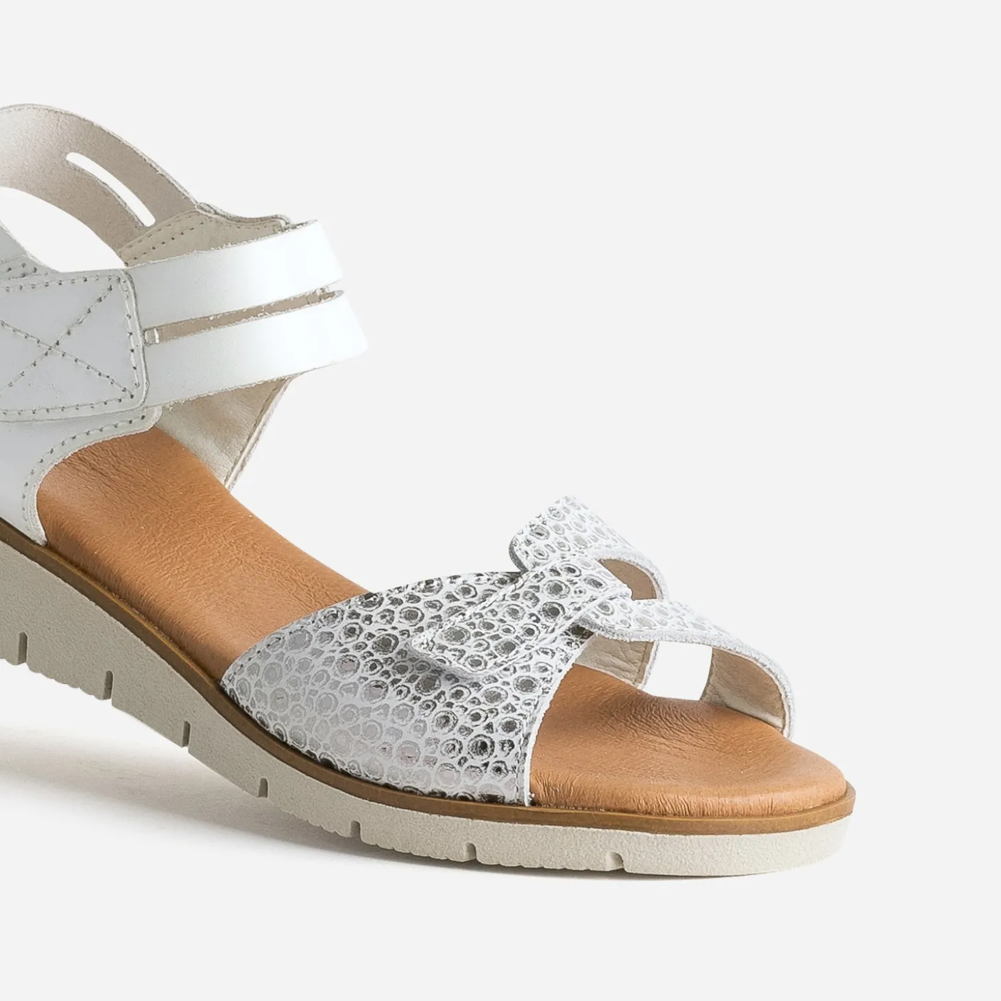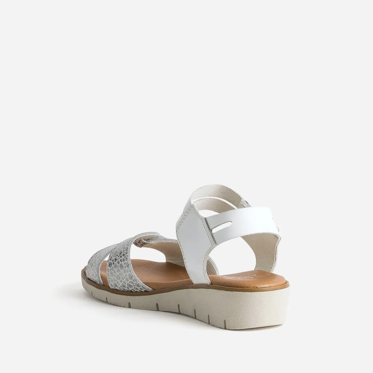 La sandale est indiscutablement LE modèle-phare de la saison estivale. Laissez-vous surprendre par le confort de ce modèle pour femme, qu’elle doit à sa semelle intérieure moussée, montée sur une semelle légèrement compensée. Confectionnée en cuir lisse, elle se décline en coloris blanc et se laisse twister par un motif fantaisie métallisé argenté sur la bride avant ; brides facilement ajustables, grâce au système de scratchs. Ses alliées ? Une tenue casual chic, dans les tons blanc, gris ou pastel.