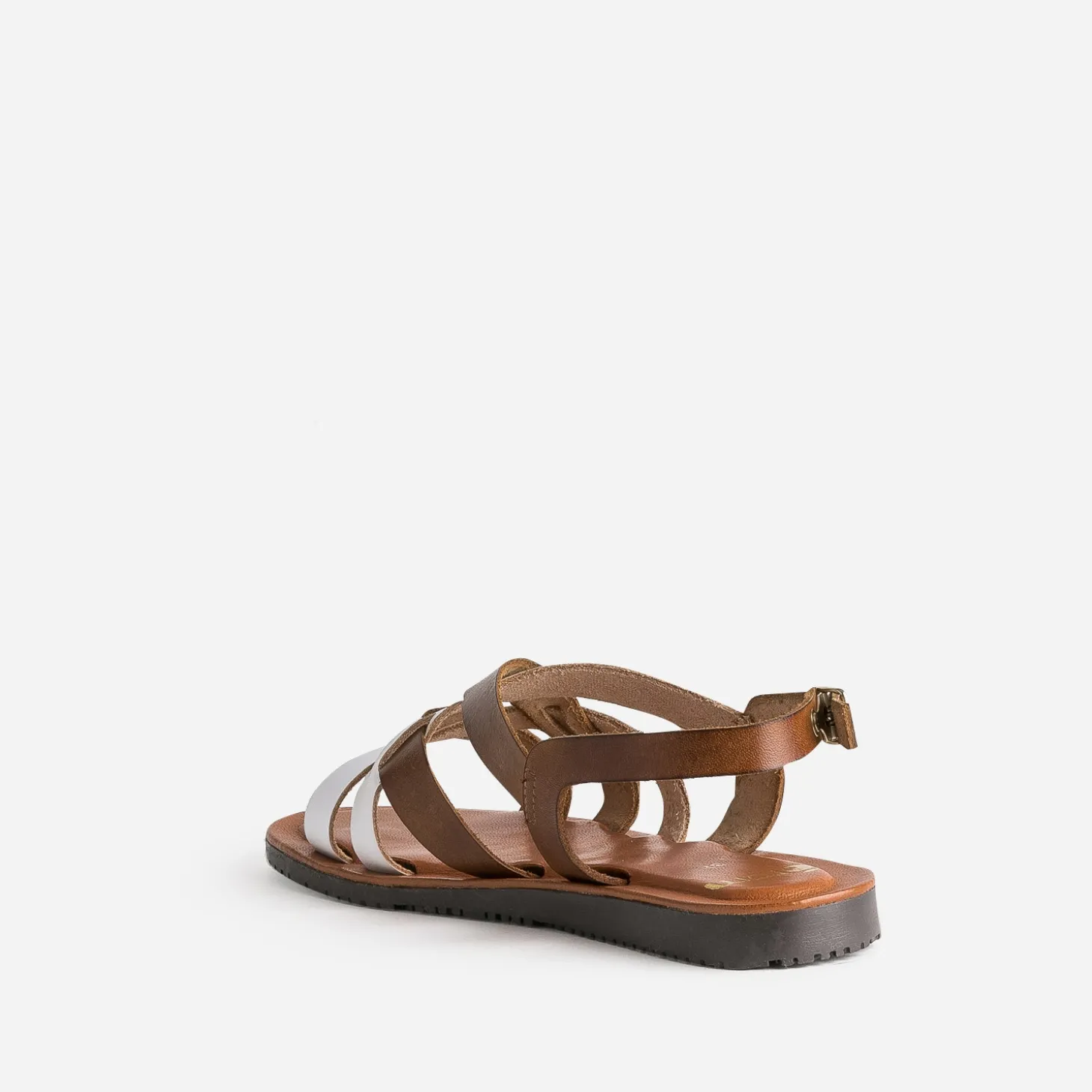 Oui au style, sans jamais oublier l’aspect pratique. C’est la promesse de cette sandale pour femme, inspirée de la spartiate. Plate, elle s’habille de brides en cuir marron et blanc, qui se croisent pour mieux maintenir le pied. A essayer sur un top et une minijupe ou un pantalon large et fluide.