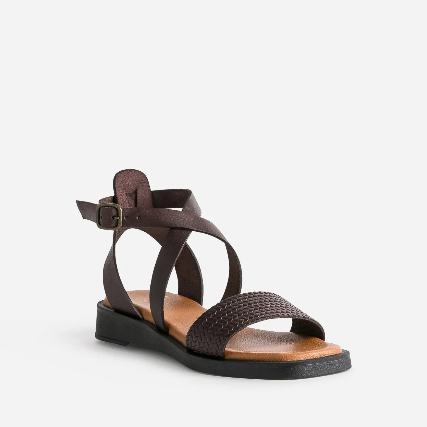 Chocolat : c’est le nom gourmand de ce coloris marron très foncé, revenu à la pointe des tendances cette saison. Il sublime cette sandale plate pour femme, par une large bride à tressage embossé et des brides croisées autour de la cheville. Craquez pour son style ethnique, avec une robe midi à motif wax, ou plus sobre, avec un tailleur-pantalon noir fluide avec une veste kimono et de gros bijous dorés.