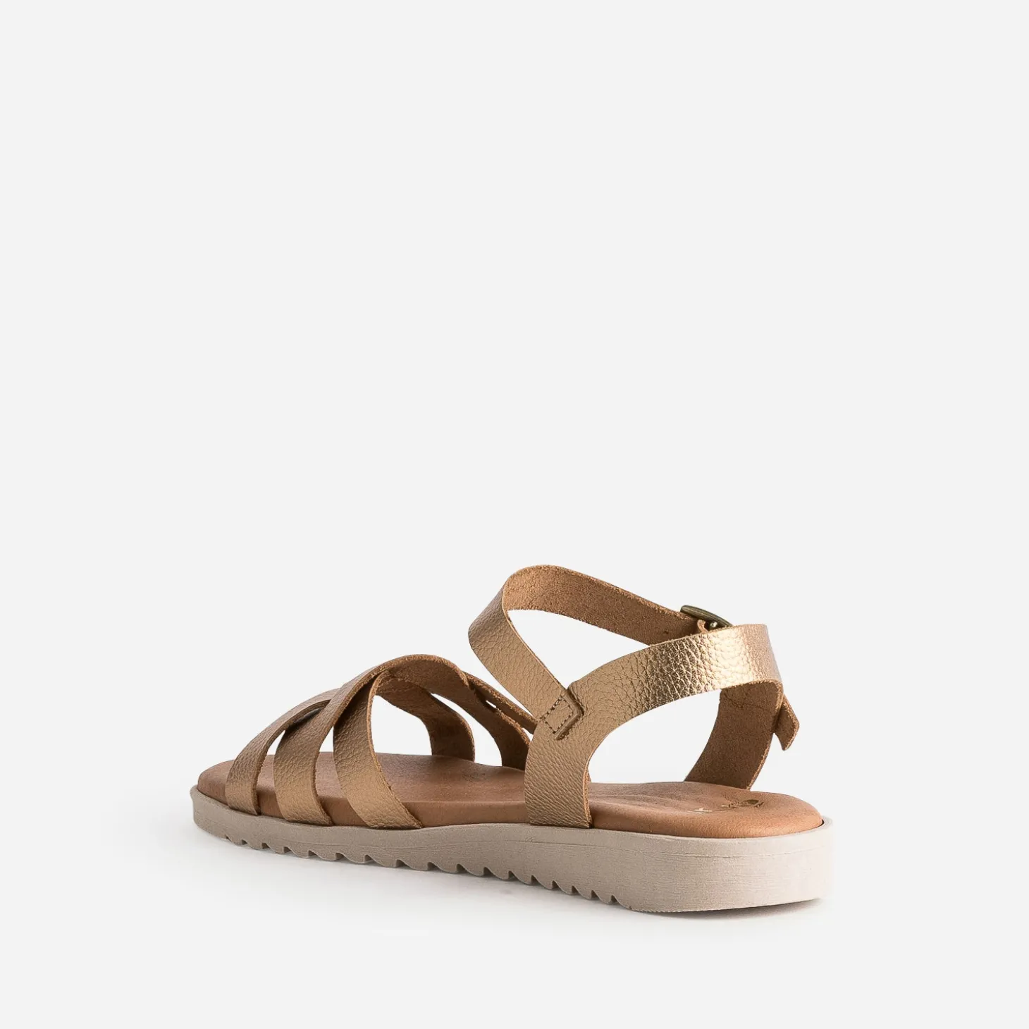 L’idée d’une sandale, qui s’accorde avec tout, est une perspective réjouissante. En cuir marron, avec finition métallisée, celle-ci marque sa singularité par des brides croisées sur le dessus du pied et montées sur une semelle crantée, légèrement compensée. Un modèle idéal, dès l’arrivée des beaux jours, avec des looks plutôt casual.