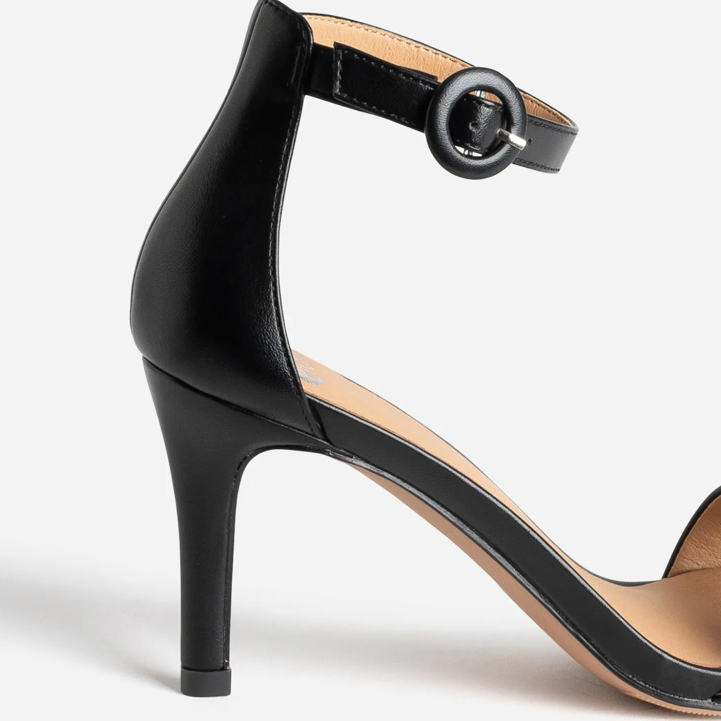 Il n’existe rien de plus féminin que la sandale à talon fin. En matière synthétique, elle habille le pied d’une bride sur le dessus du pied et d’une tige montante sur l’arrière. Montée sur un talon fin de 8 cm, elle se décline en coloris noir pour finaliser toutes les tenues d’été, en journée comme en soirée, avec une élégance évidente.