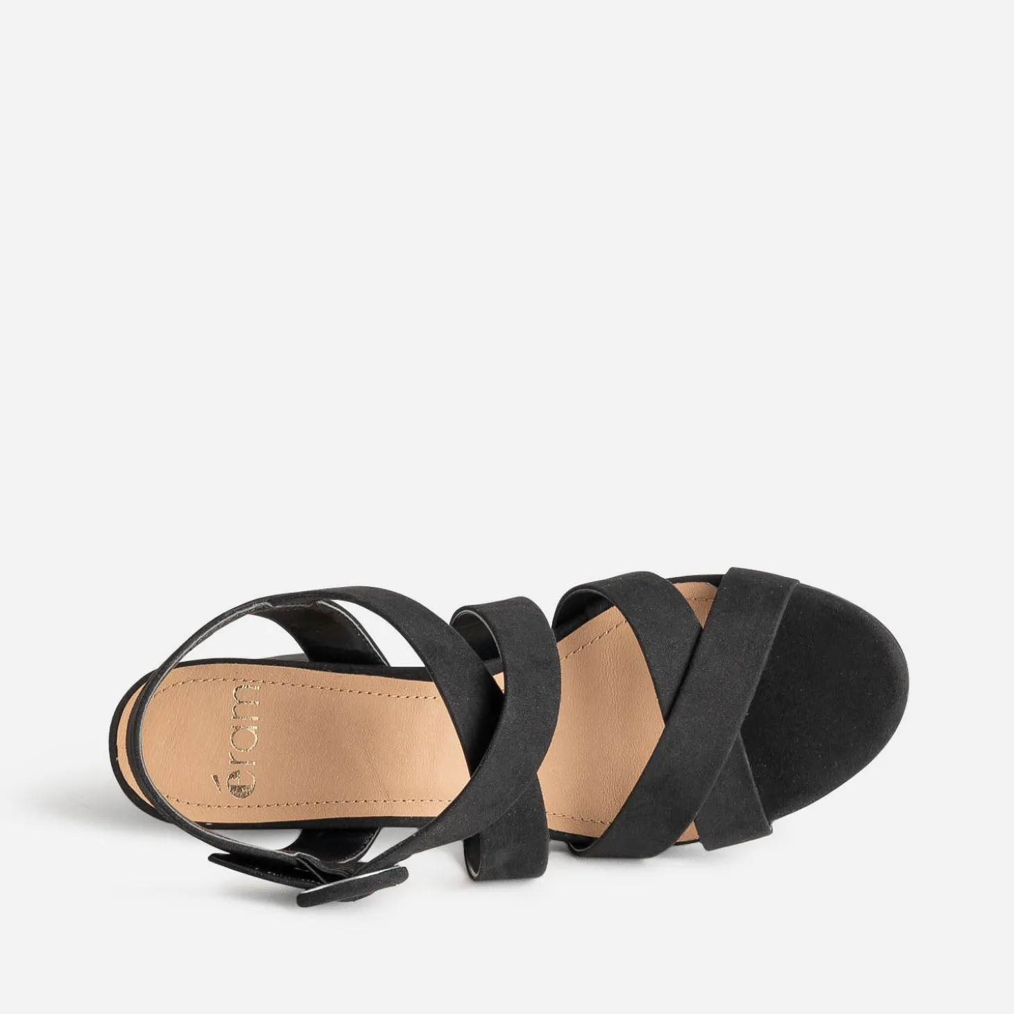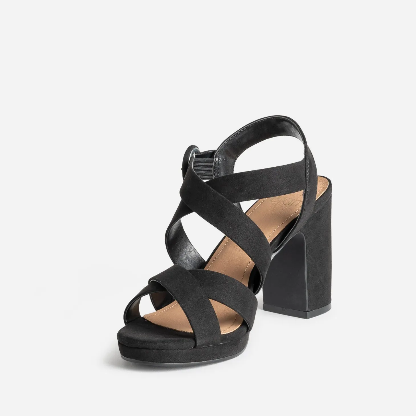Modèle intemporel et indémodable du shoesing estival féminin, la sandale prend de la hauteur. En textile suédé noir, elle multiplie les brides pour maintenir le pied sur un talon de 9,5 cm, soulagé par un patin avant de 1 cm. Elle s’adapte facilement à toutes vos envies de style du moment, pour un look rock, avec une blouse léopard et un pantalon en cuir noir, ou une version plus preppy, avec une robe à pois.