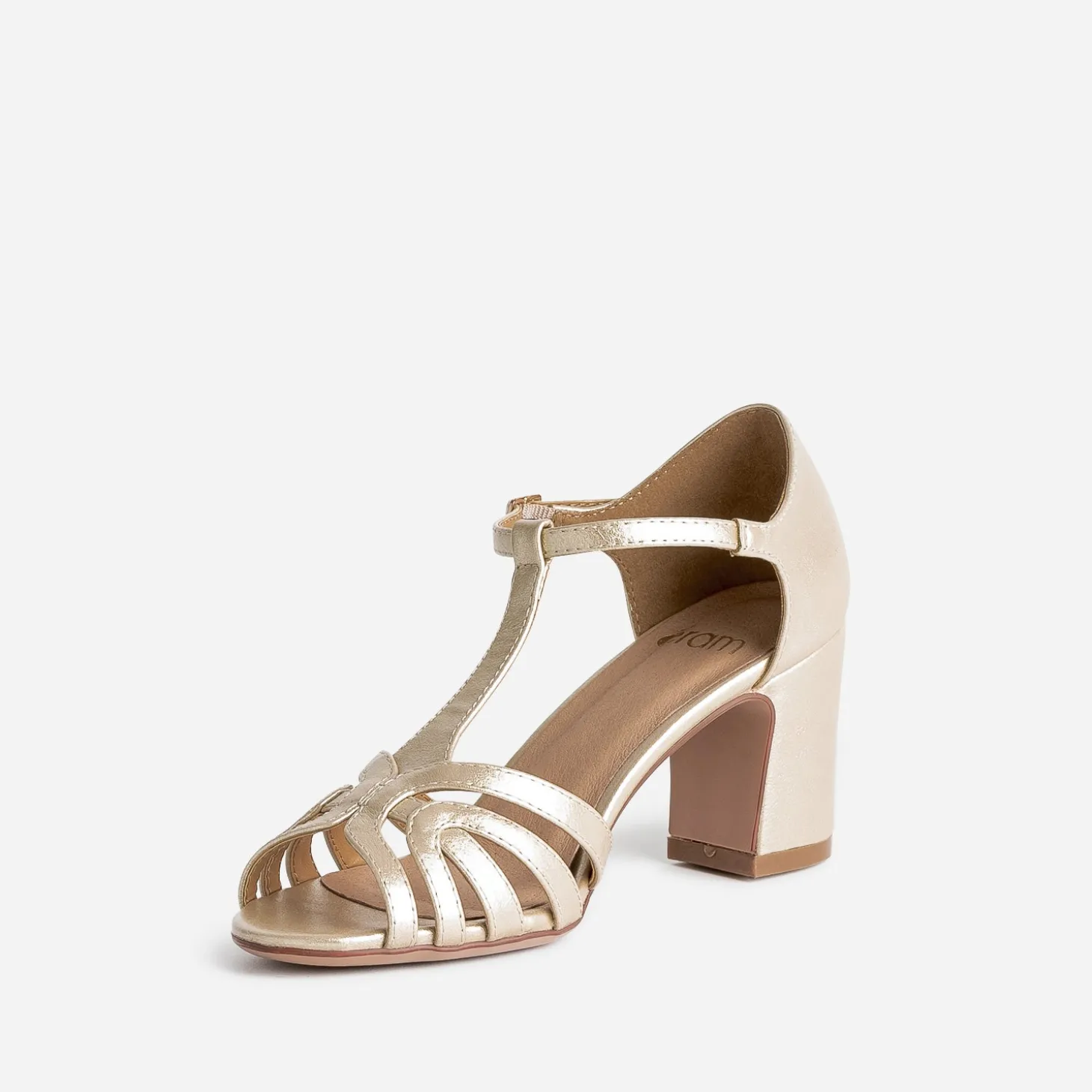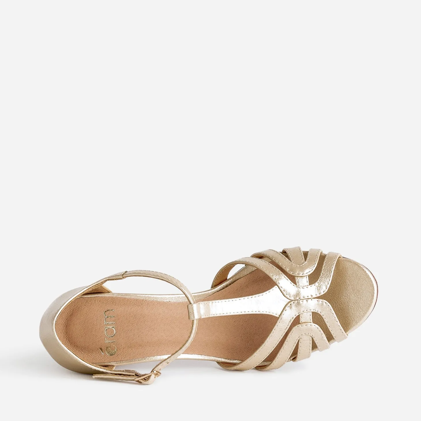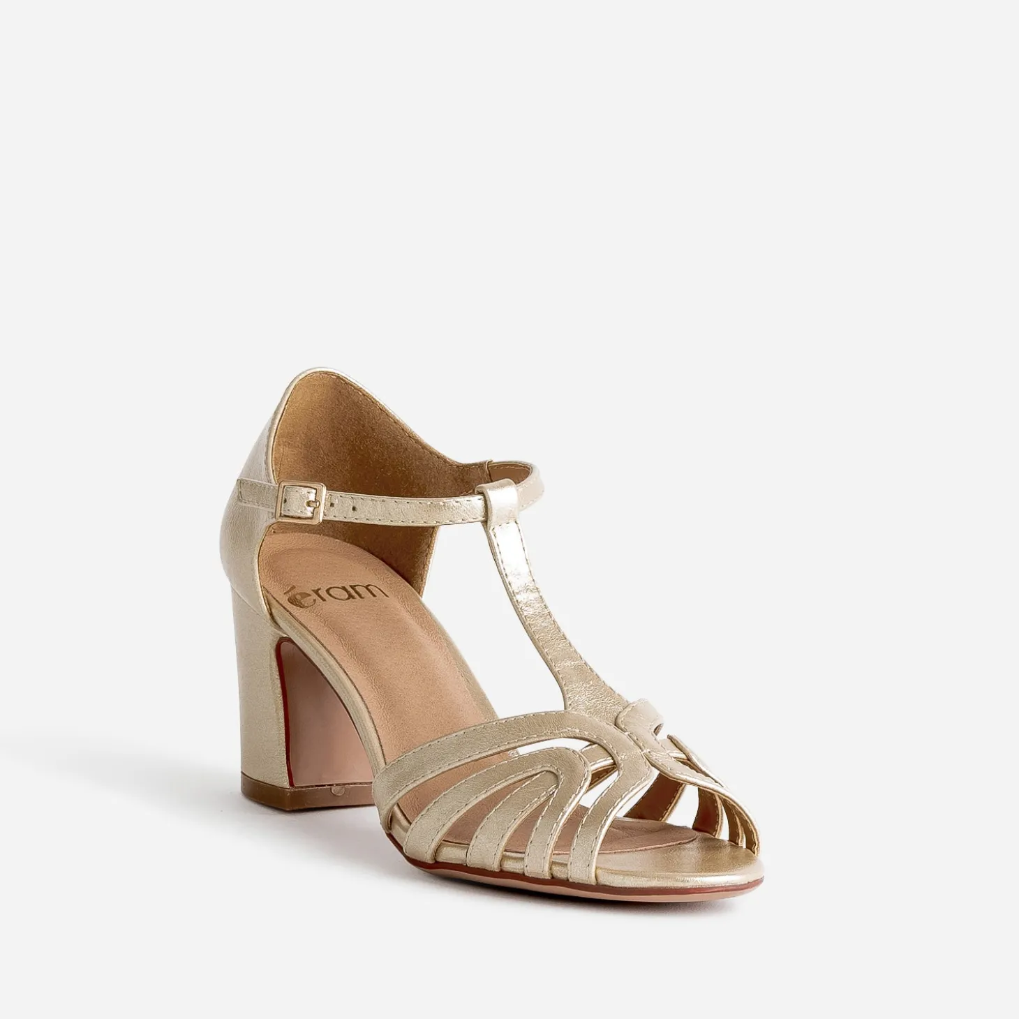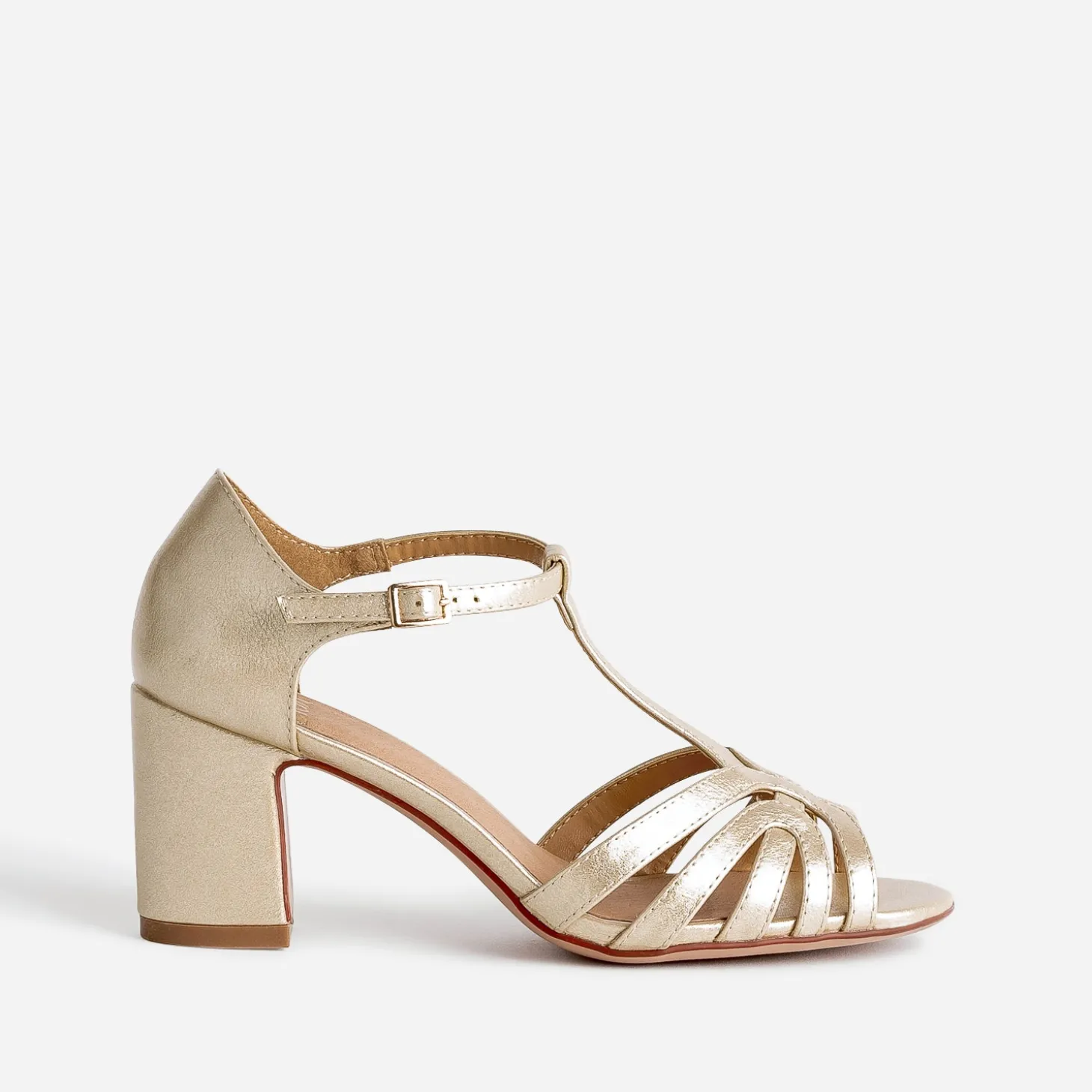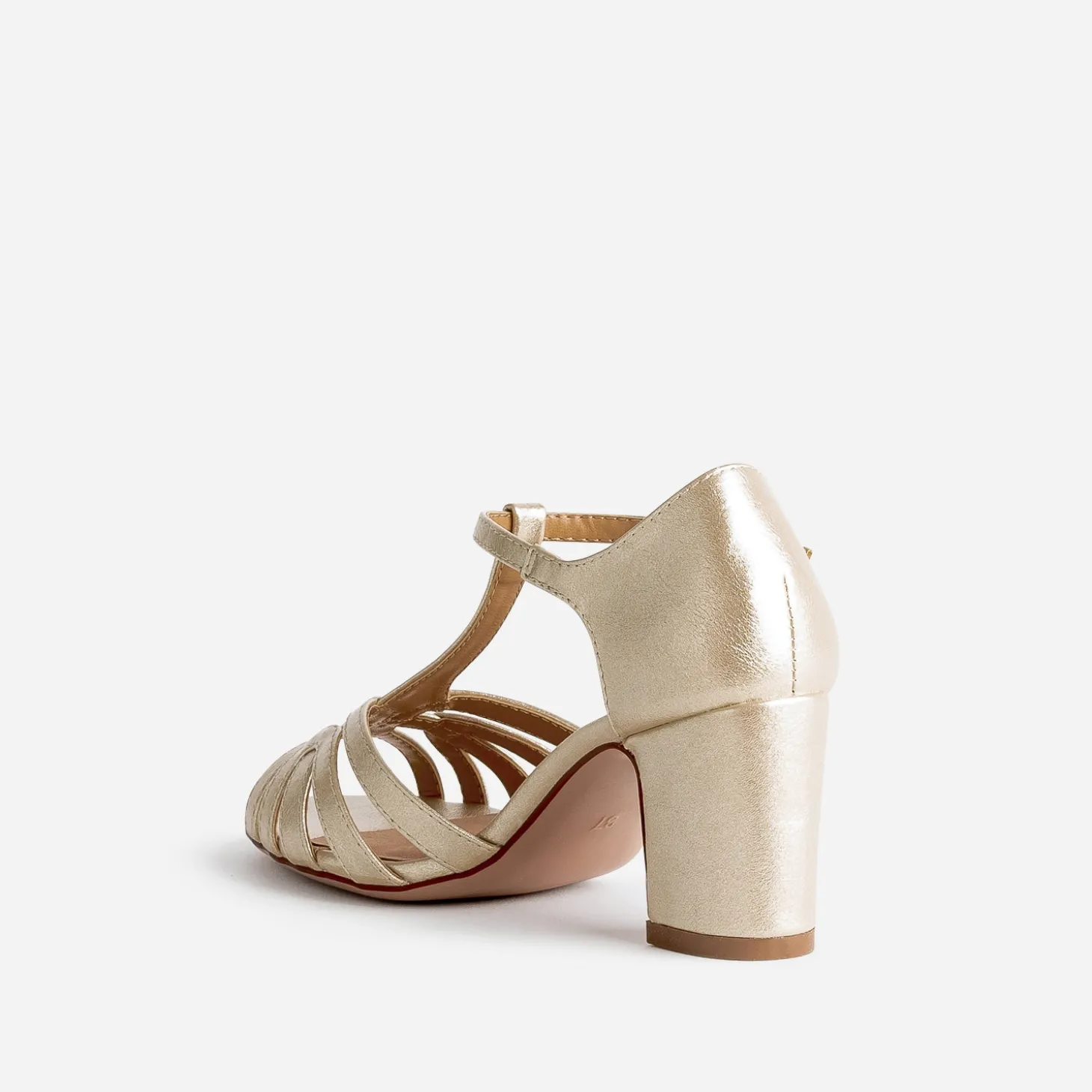 Inspirée par l’univers de la salsa, la sandale femme lui emprunte de multiples brides, retenues par un contrefort arrière. Elle se modernise par un talon carré de 7 cm et une matière synthétique lisse de couleur dorée. Profitez-en pour sortir vos pièces les plus aériennes et vaporeuses, comme une robe à bretelles de couleur prune ou fuchsia, avec une ceinture pailletée.