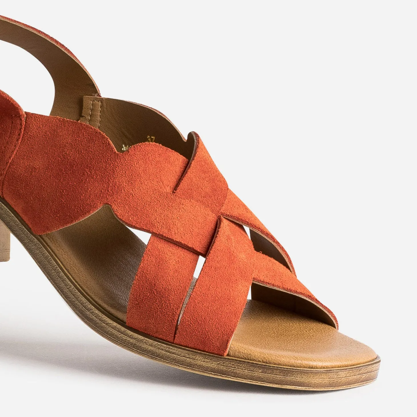 Dessus, 100% cuir velours. Doublure, 100% matière synthétique. Semelle première, 100% cuir lisse. Cette sandale pour femme est une véritable pépite, un modèle incontournable. Un coloris orange, un talon flare imitation bois ni trop plat ni trop haut, des brides croisées avec subtilité, elle séduit sans effort. Imaginez-la avec une robe chemise en lin beige et un panier en raphia.