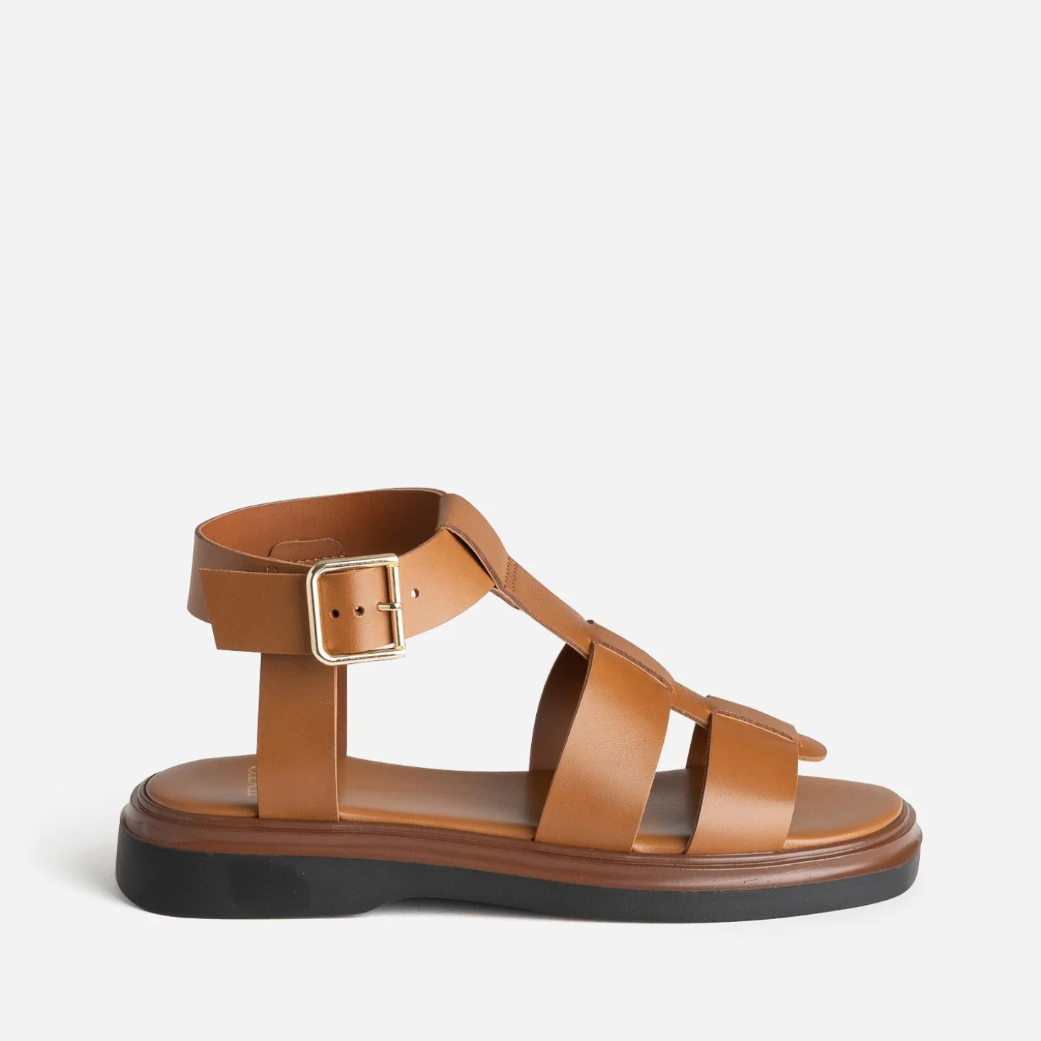 L’héritage grec se réinvente avec cette sandale pour femme. Les larges brides en cuir évoquent les spartiates d’origine, tandis que la semelle plate et légèrement compensée s’adapte aux tendances estivales. Déclinée en coloris cognac, elle décore la cheville d’une boucle carrée en métal jaune. Un modèle qui ne cache pas son élégance, avec un débardeur écru, un pantalon large en lin beige et un long sautoir en guise de bijou.
