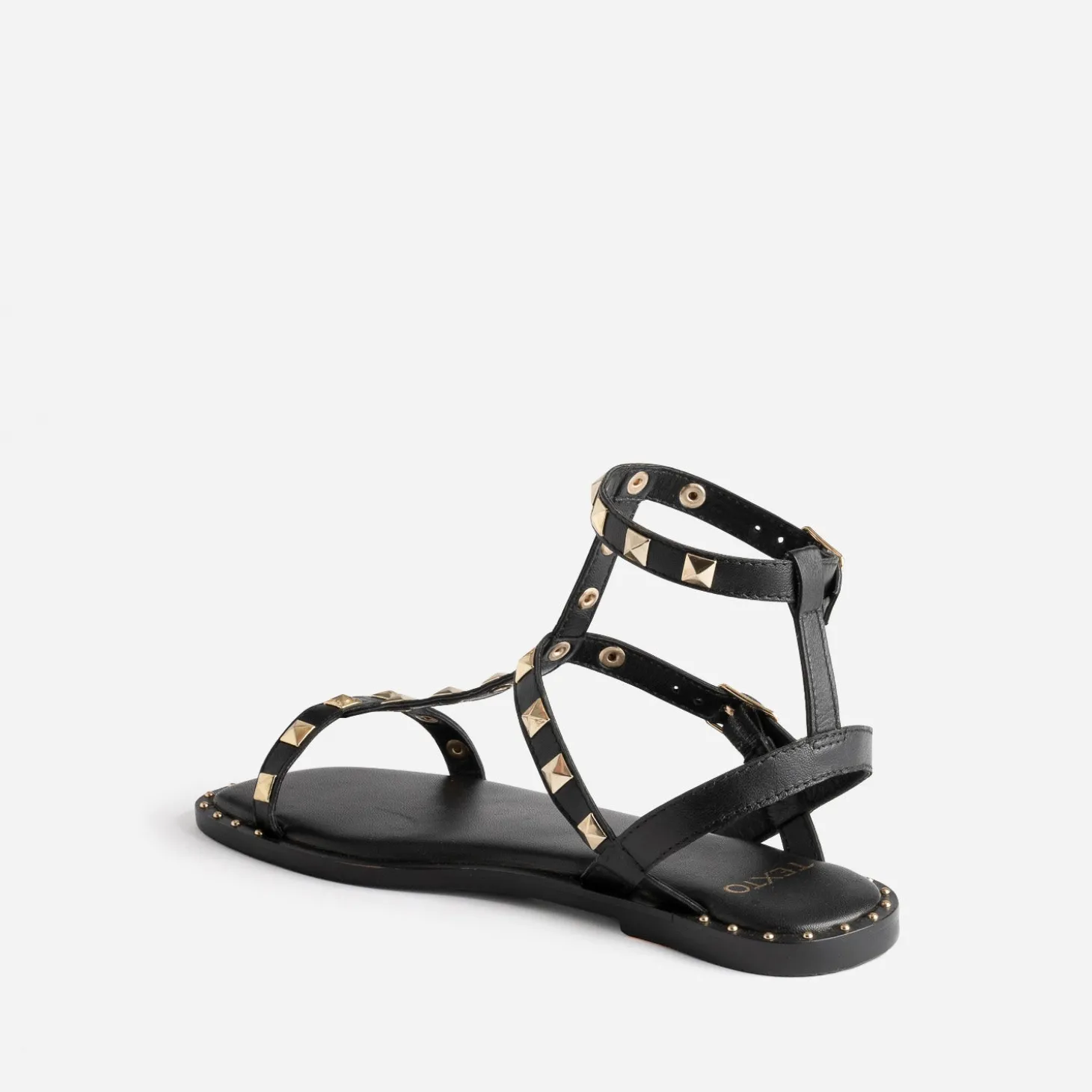 Revisitée par une tige montante, composée de 3 brides, cette sandale femme s’approprie le style spartiate. En cuir lisse noir, elle est décorée de clous de forme carrée facettée, en métal doré. La trépointe est rehaussée de micro clous, à l’avant et à l’arrière du pied. Associez son esprit rock n’ chic avec une robe longue noire plissée.