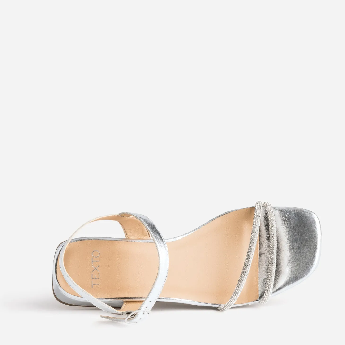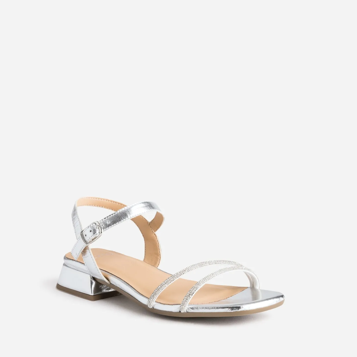 De la brillance, en toutes circonstances, et la tenue se fait chic, chic, chic ! Prenez cette sandale argentée. Elle est montée sur un petit talon, et séduit par sa double bride croisée sur le dessus du pied et recouverte de strass. Réservez-la avec une tenue dans les tons froids, bleu marine ou bleu ciel, vert anis ou vert foncé, prune ou parme.