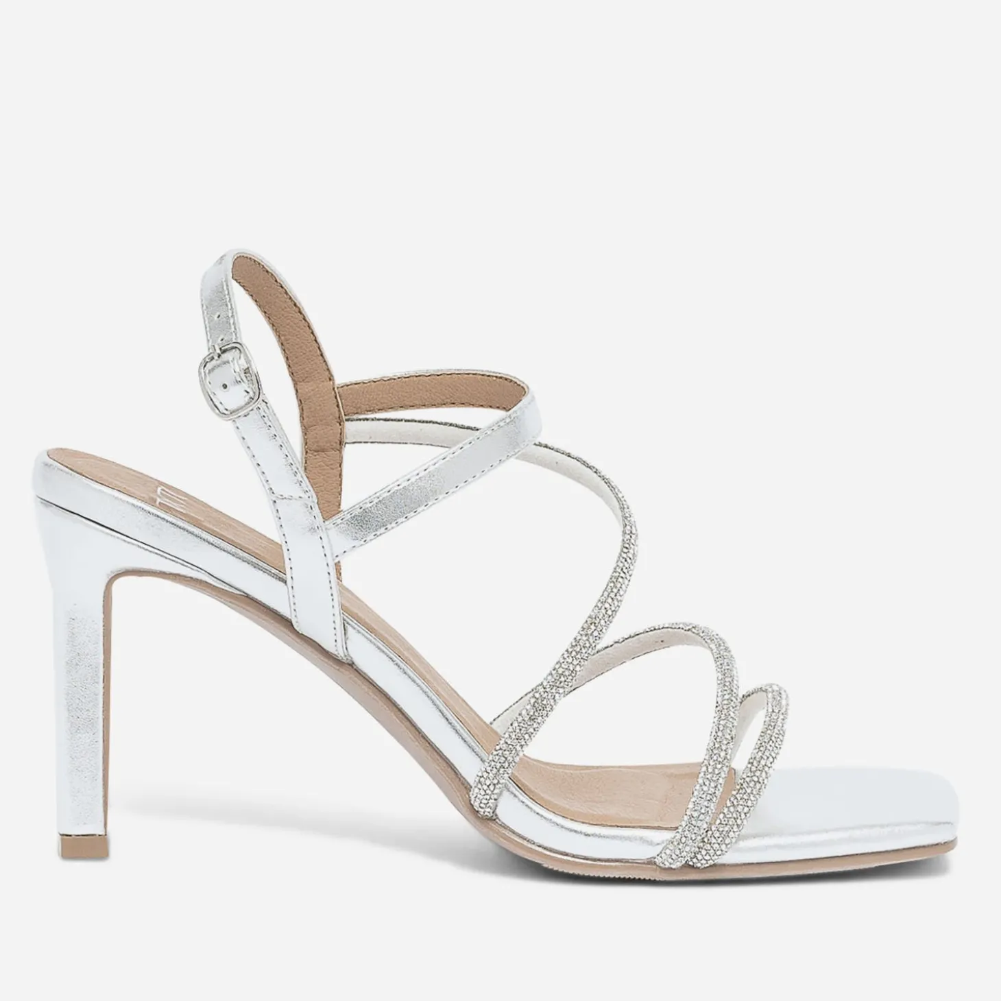 Tenue glam’ chic recommandée avec cette sandale pour femme. Montée sur un haut talon fin et rectangulaire, elle est confectionnée en matière synthétique couleur argent, et féminisée par des fines brides rehaussées de micro-strass. Le bout carré s’inscrit dans la tendance du moment. Un modèle à réserver avec une robe bustier ou longue, esprit fourreau.