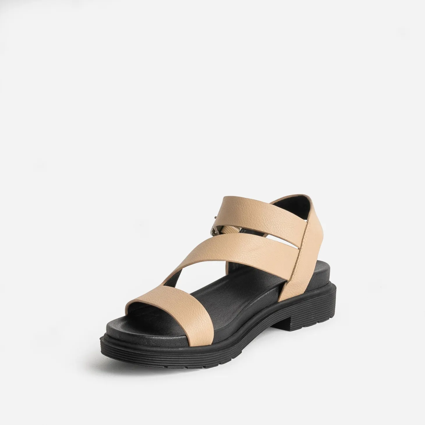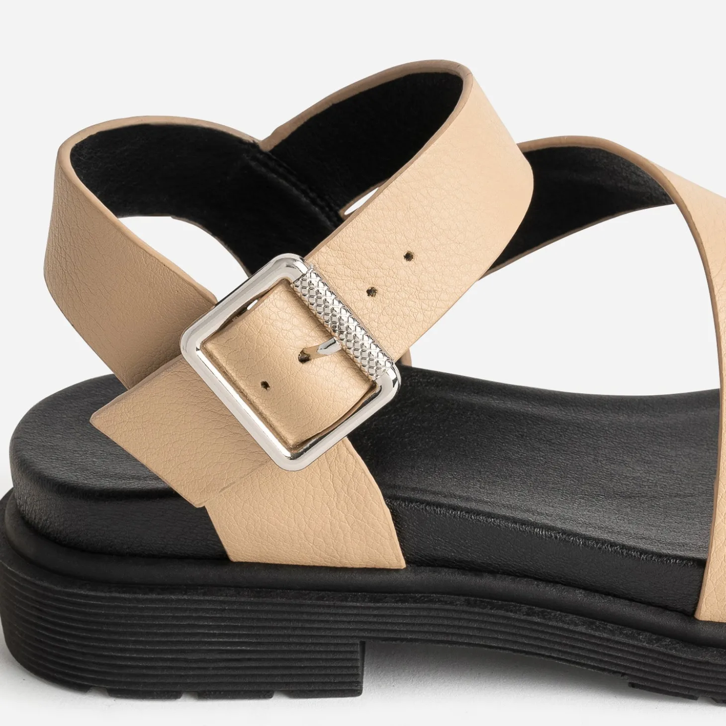 La première singularité de cette sandale femme, ce sont ces brides asymétriques. La deuxième, sa couleur beige, intemporelle. La troisième, sa semelle noire et légèrement crantée. Essayez ce modèle avec un tee-shirt blanc et un pantalon noir, large et plissé.