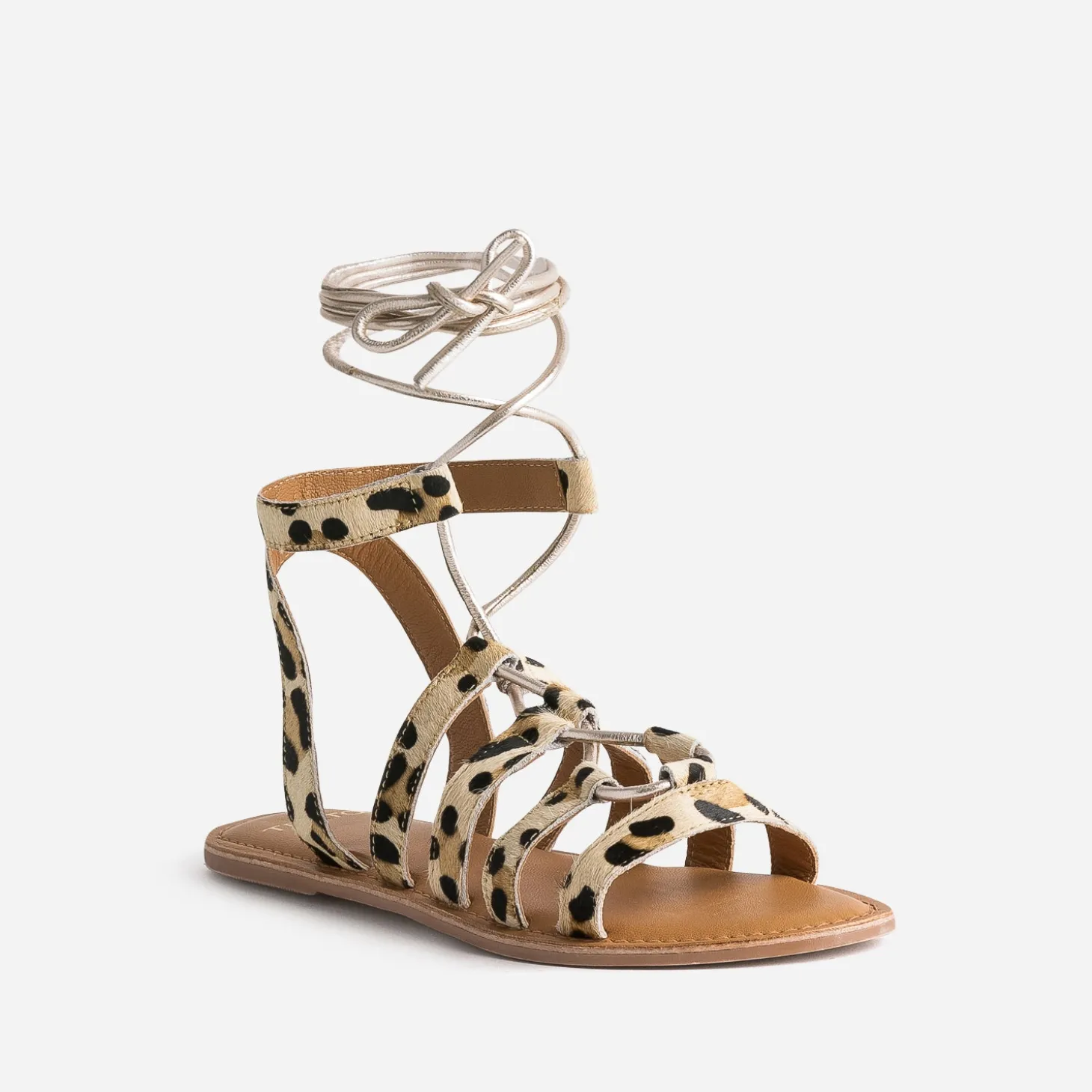 L’été appelle le pied à se dévoiler… Cette sandale femme opte pour le plat et un jeu de multiples brides prolongées par 2 liens à nouer, autour de la cheville. En cuir beige façon poulain, à motif léopard, elle apporte, à la blouse blanche brodée, à la robe taille empire, une touche bohème, pile dans l’air du temps.
