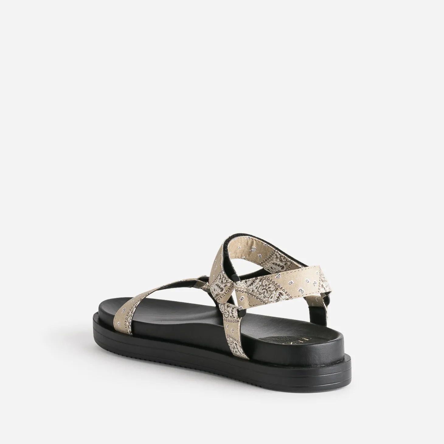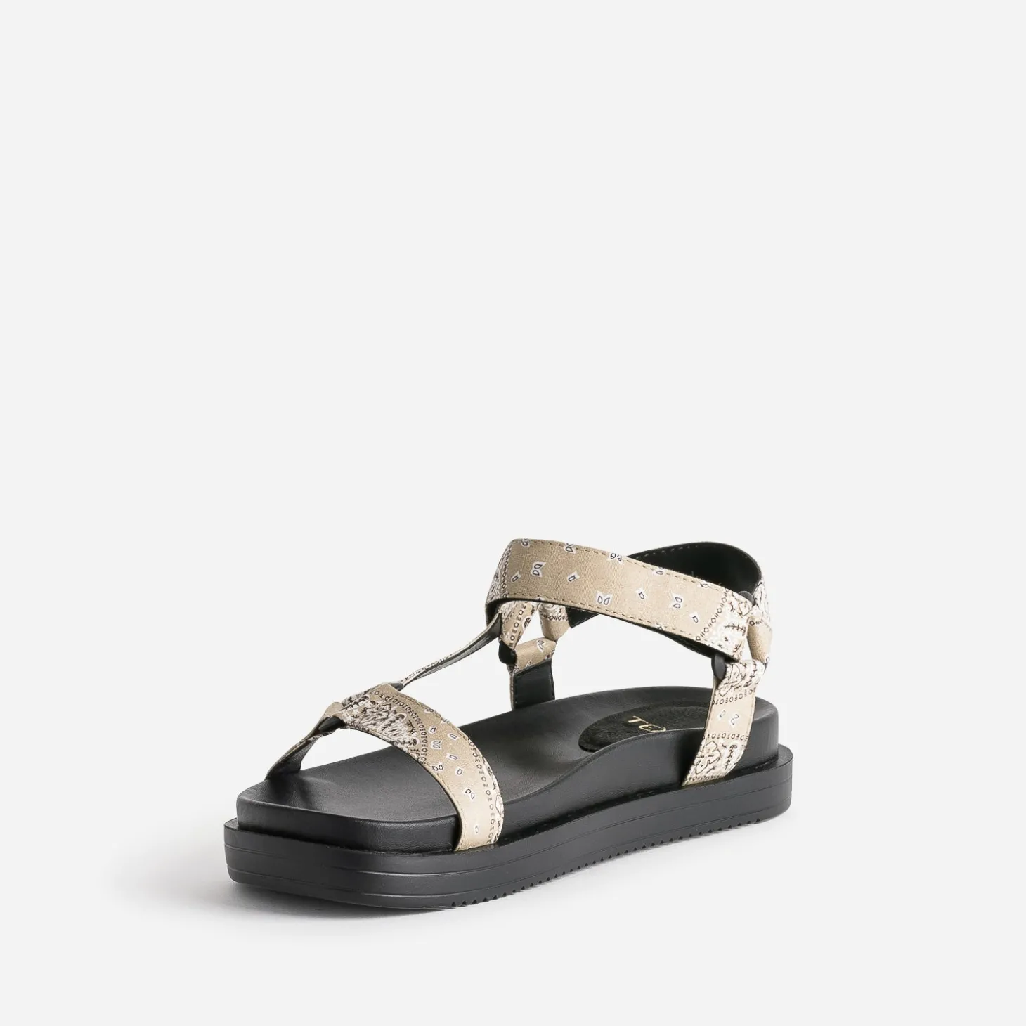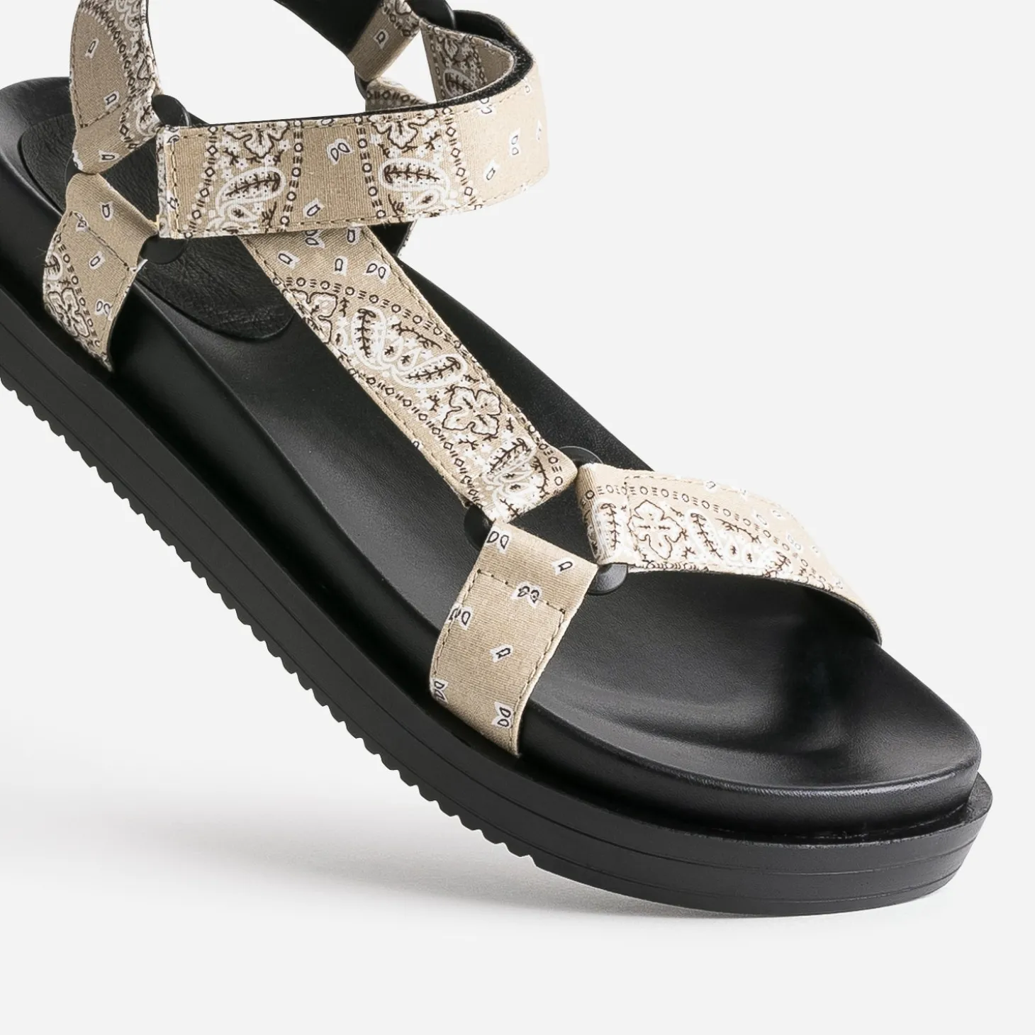 Inspiré par la sandale de trekking, ce modèle de Dad Sandals pour femme séduit d’abord par son confort. Ses brides spécifiques, fermées par scratch, sont recouvertes d’un tissu bandana vintage de couleur beige. Ultra stylée depuis plusieurs saisons, elle appelle un look décontracté, comme un tee-shirt blanc à col rond et manches courtes sur un pantalon large noir plissé.