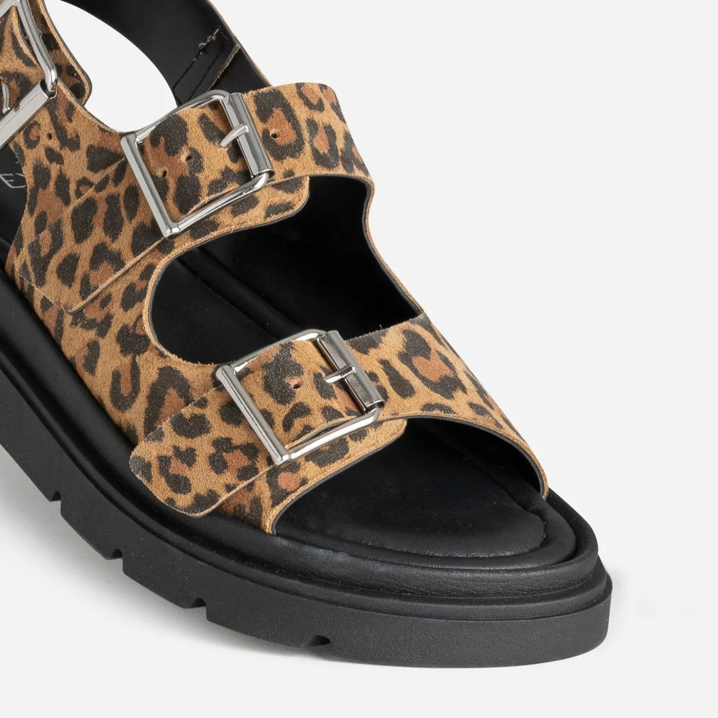 Cette sandale pour femme conjugue deux grandes tendances de la saison : l’imprimé léopard et la semelle crantée. Confectionnée en cuir velours camel, elle se distingue par trois larges brides ajustables par maxi boucles. Le confort est optimal grâce à la semelle première moussée. Un modèle facile à harmoniser au quotidien, avec un tee-shirt et un jean brut.