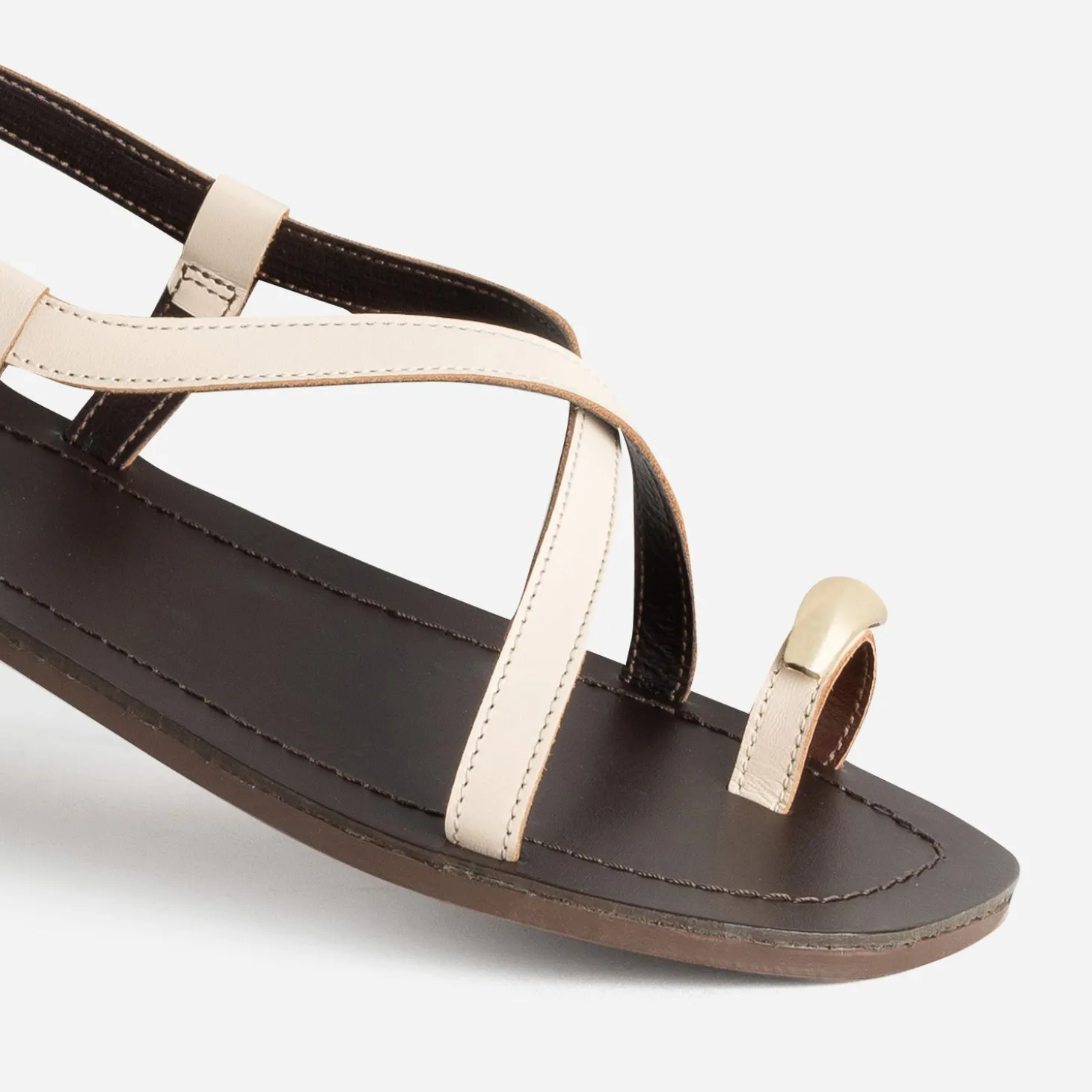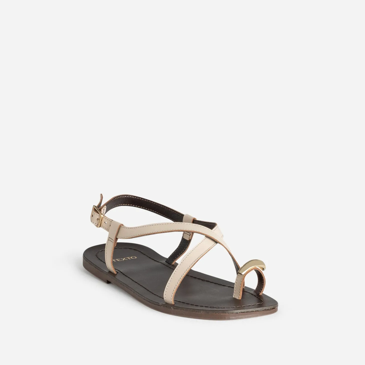 Optez pour un style estival et contemporain avec cette sandale plate pour femme. Appréciez sa ligne épurée associant fines brides croisées en cuir lisse beige et passe-orteil décalé, rehaussé d’un bijou doré en signature. Un modèle qui fait preuve d’originalité sans compromettre son élégance, à oser avec un top uni et un pantalon fluide à imprimé léopard.