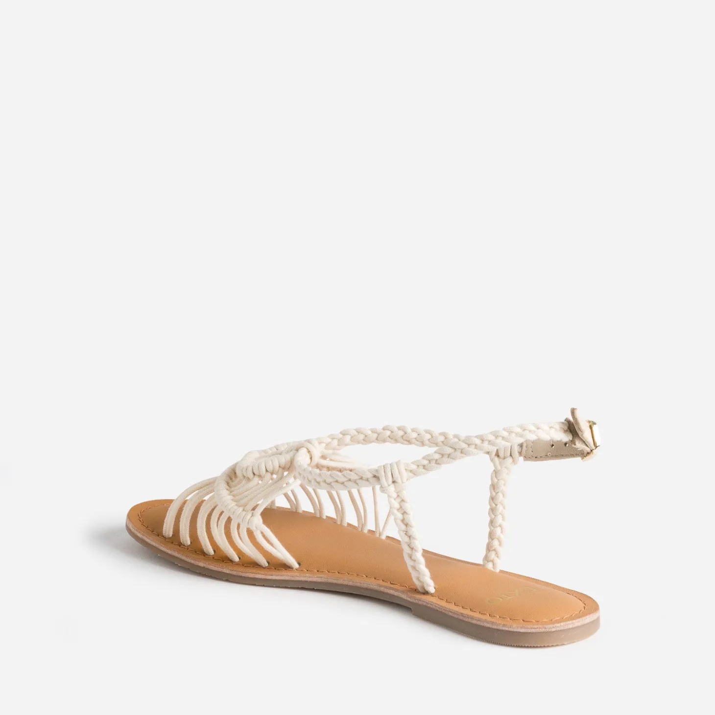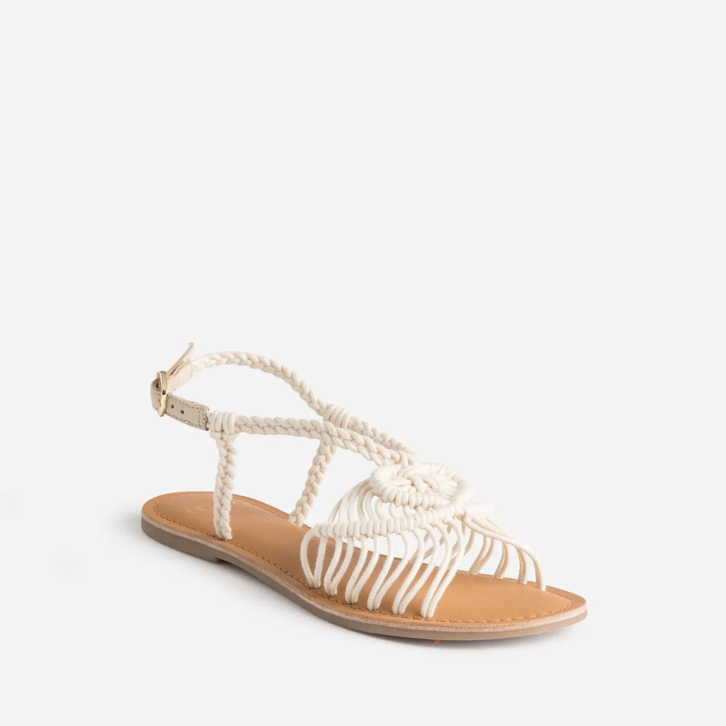 Style bohème est une tendance intemporelle, qui marque la saison estivale. Sur cette sandale plate pour femme, la bride principale est revisitée par un tissage en textile écru façon macramé, prolongé par une tresse autour de la cheville. Idéale avec une robe en broderie anglaise blanche, avec un panier en raphia en guise de sac à main.