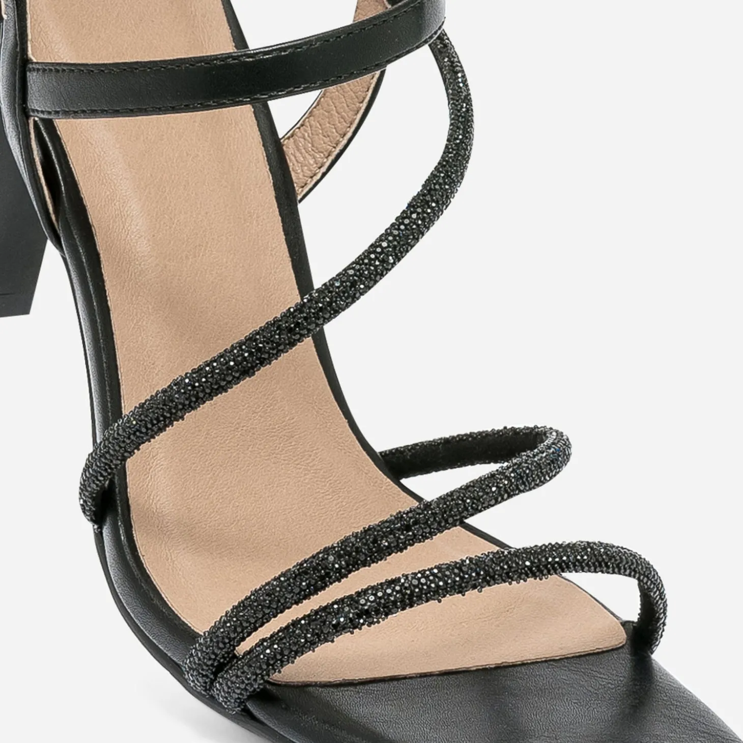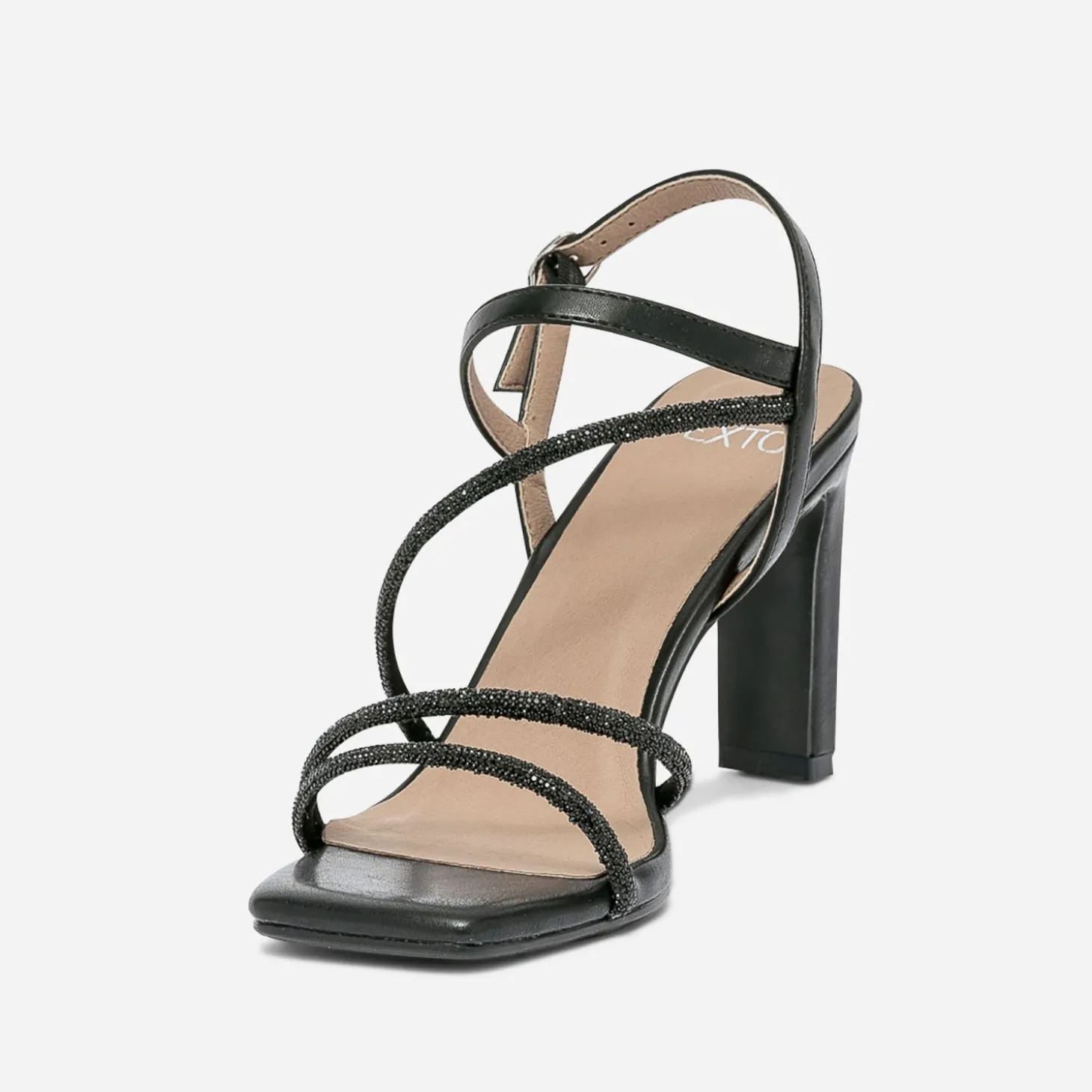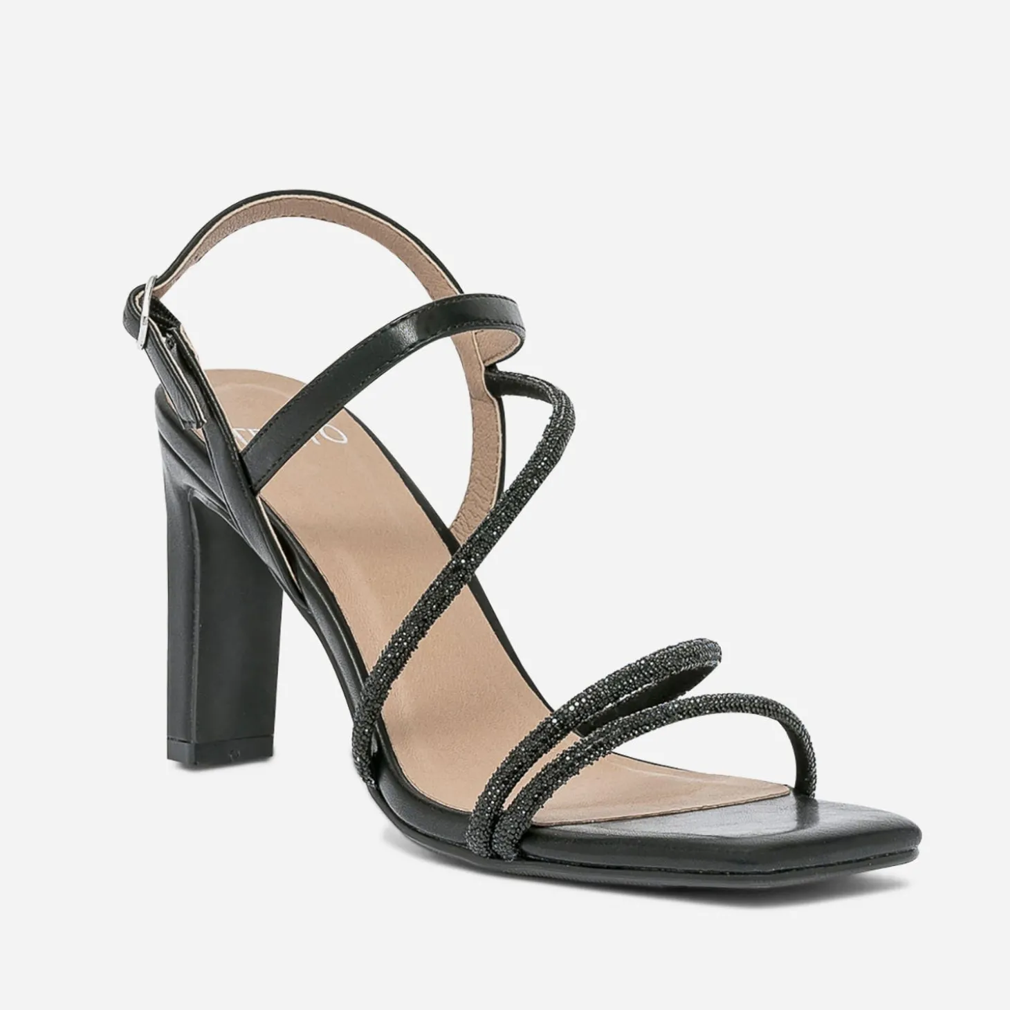 Tenue glam’ chic recommandée avec cette sandale pour femme. Montée sur un haut talon fin et rectangulaire, elle est confectionnée en matière synthétique couleur noire, et féminisée par des fines brides rehaussées de micro-strass ton sur ton. Le bout carré s’inscrit dans la tendance du moment. Un modèle à réserver avec une robe bustier ou longue, esprit fourreau.