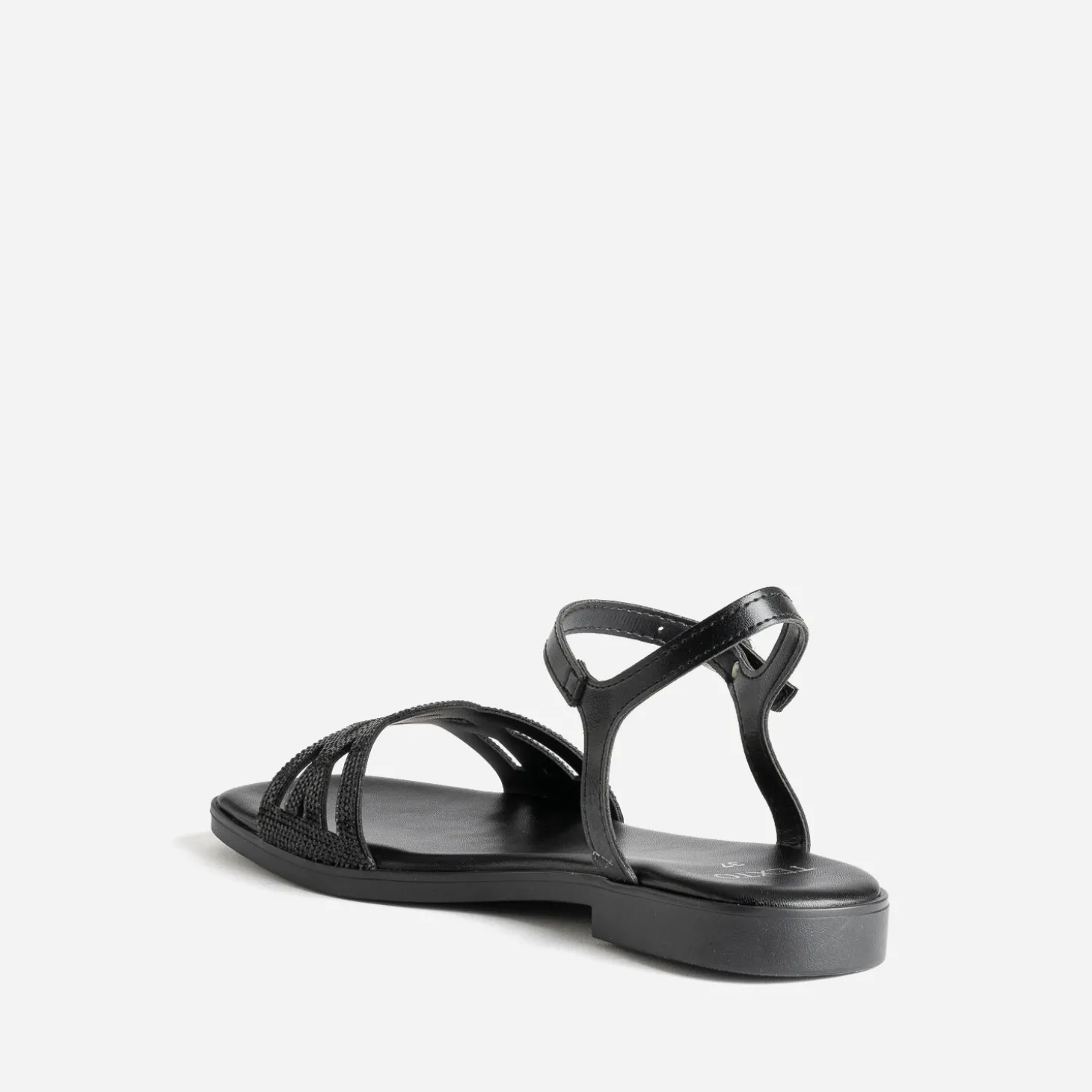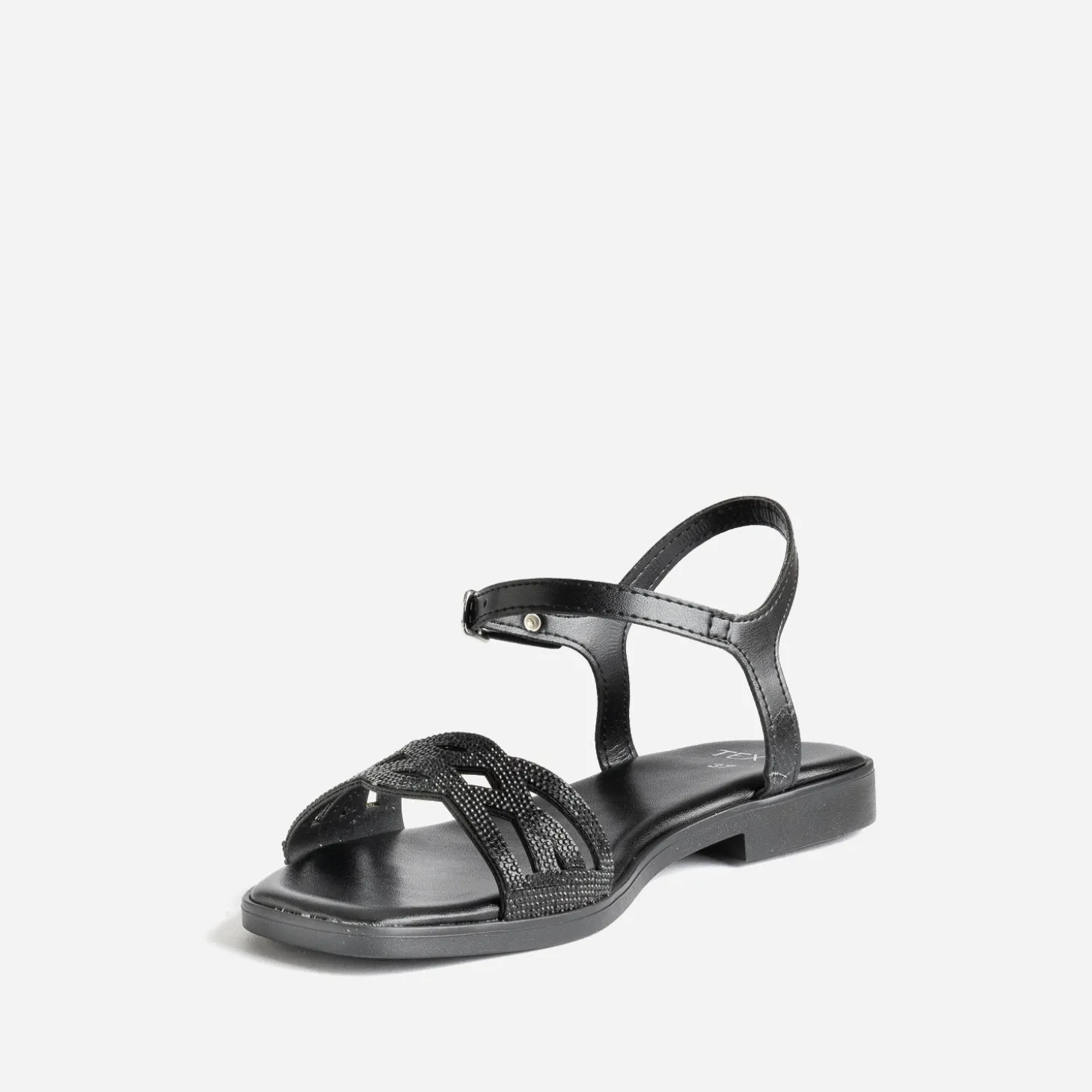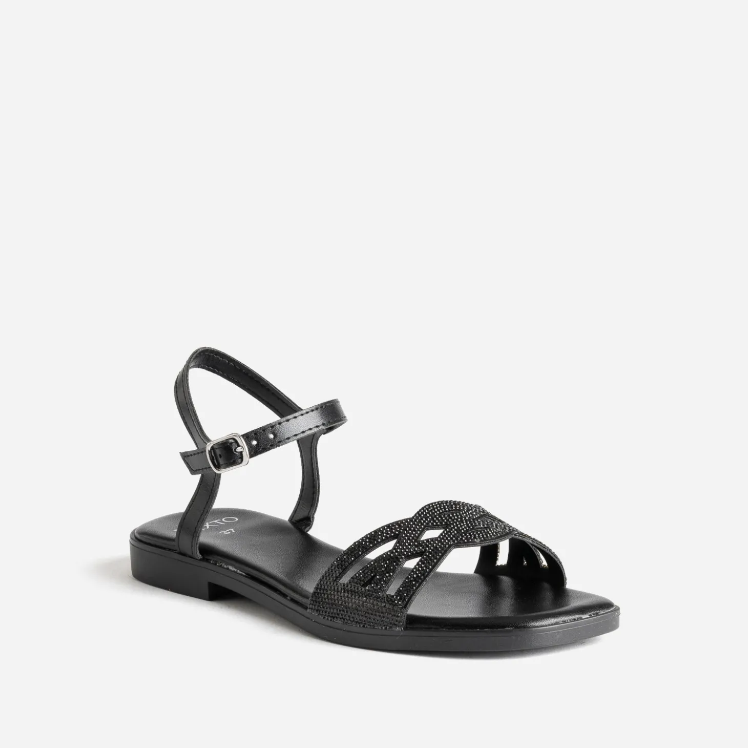 Une jolie sandale aux détails raffinés, et c’est toute la tenue qui gagne en chic. Plate, ce modèle noir présente une bride faite d’entrelacs et rehaussée de strass ton sur ton. Misez sur un total look black, costume-pantalon ou combi.