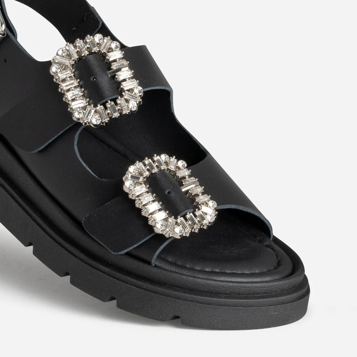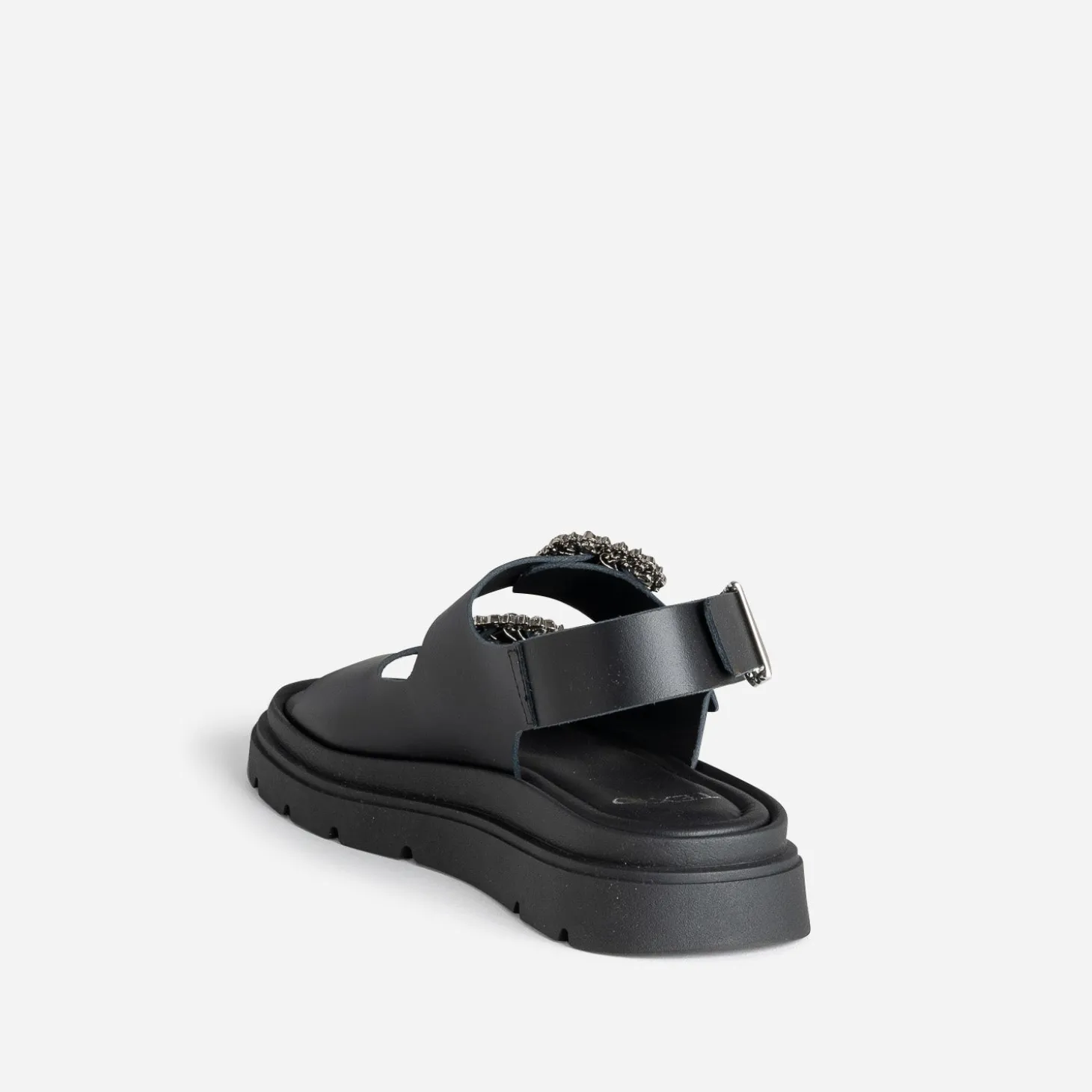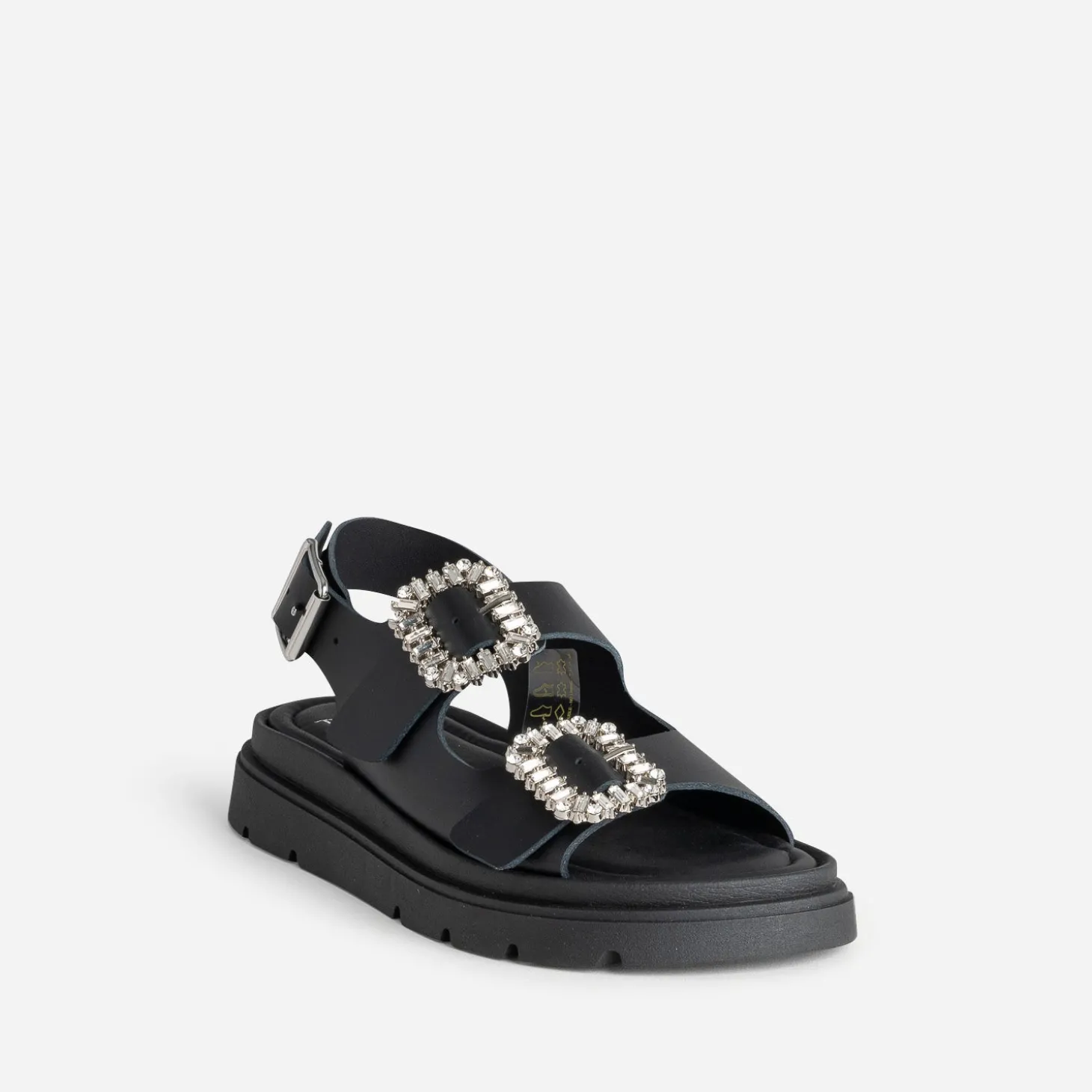 La tendance monochrome se confirme. La preuve avec cette sandale noire pour femme. Confectionnée en cuir, elle présente trois larges brides, ajustables par maxi boucles, dont deux rehaussées de strass, pour un confort optimal. La semelle crantée assure une adhérence parfaite sur tous les sols. Un modèle à décaler avec un costume 2 pièces, petit gilet et pantalon large beige à rayures tennis.