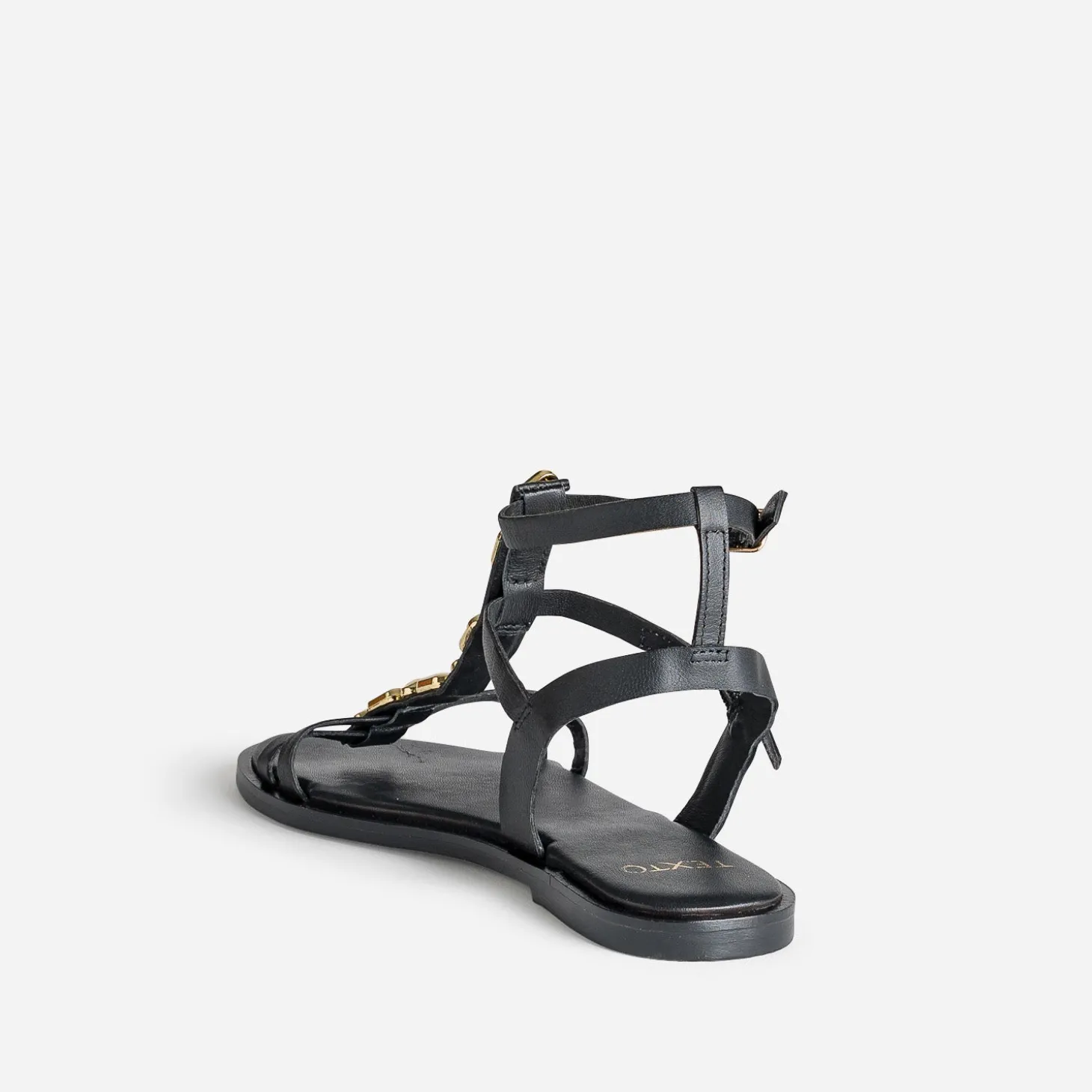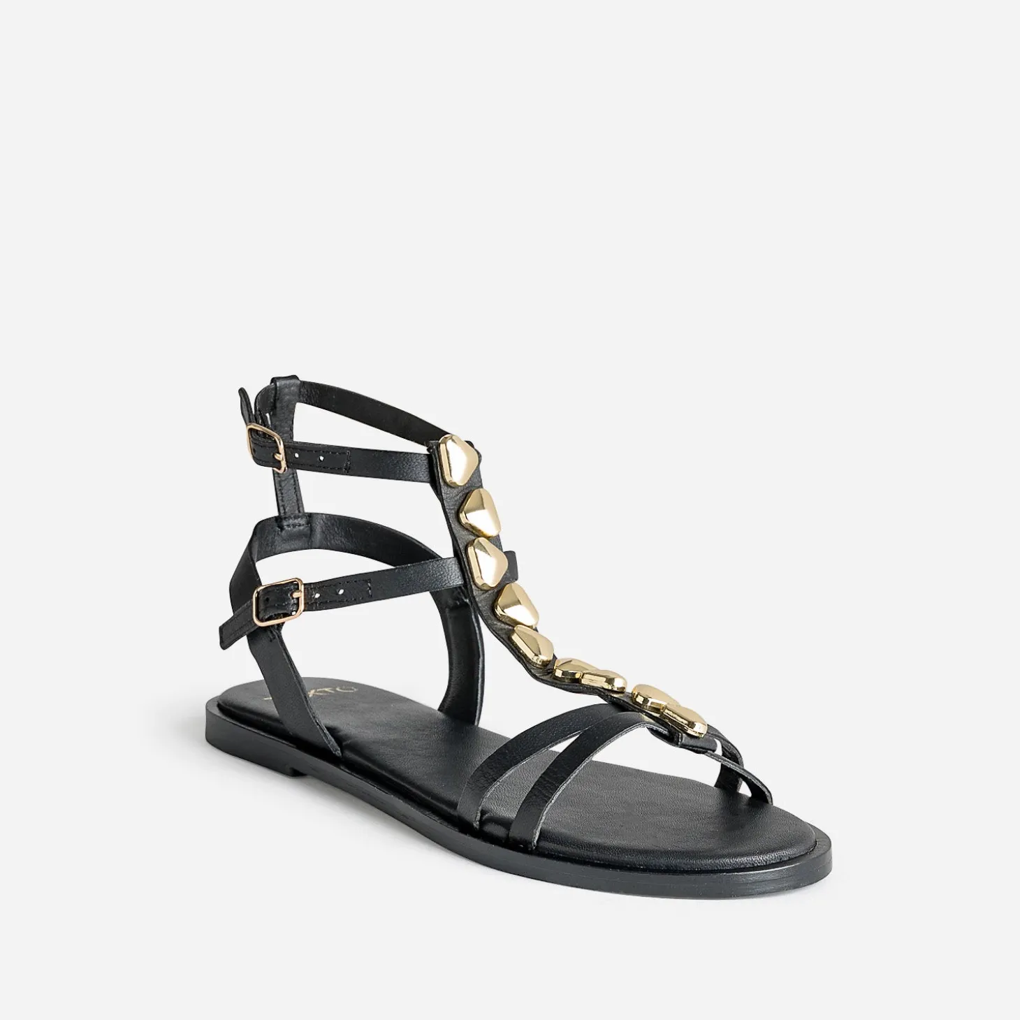 Emboîtez le pas à LA tendance chaussures la plus irrésistible de l’été : la sandale-bijou. La ‘toe ring sandal’ se caractérise par une bride en T, décorée ici de clous fantaisie dorés sur cuir noir. Son grand avantage, c’est son confort lié à la semelle plate. Un modèle avec double bride autour de la cheville et sur le dessus du pied, à mettre en valeur avec une robe midi et un collier ras-de-cou façon maxi gourmette en métal doré.