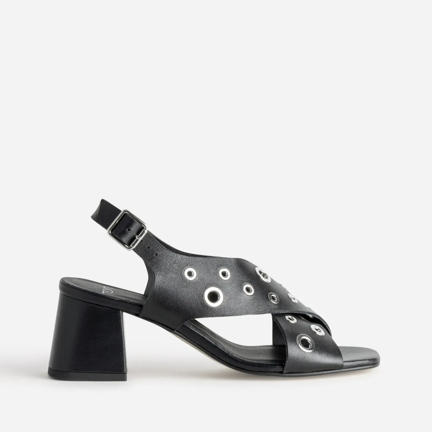 Cette sandale pour femme revendique un style rock très tendance. Elle se distingue par deux larges brides en cuir lisse noir, croisées sur le dessus du pied et ornées d’œillets en métal gris. Elle est montée sur un talon flare de 6 cm et s’ajuste par une bride à boucle. Un modèle à associer à une robe vaporeuse noire, réchauffée par un blouson en cuir esprit motard.