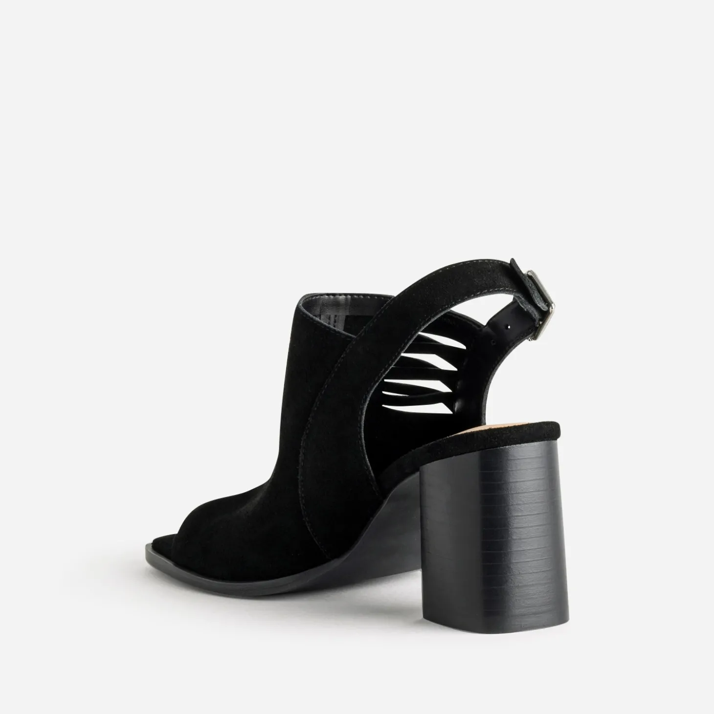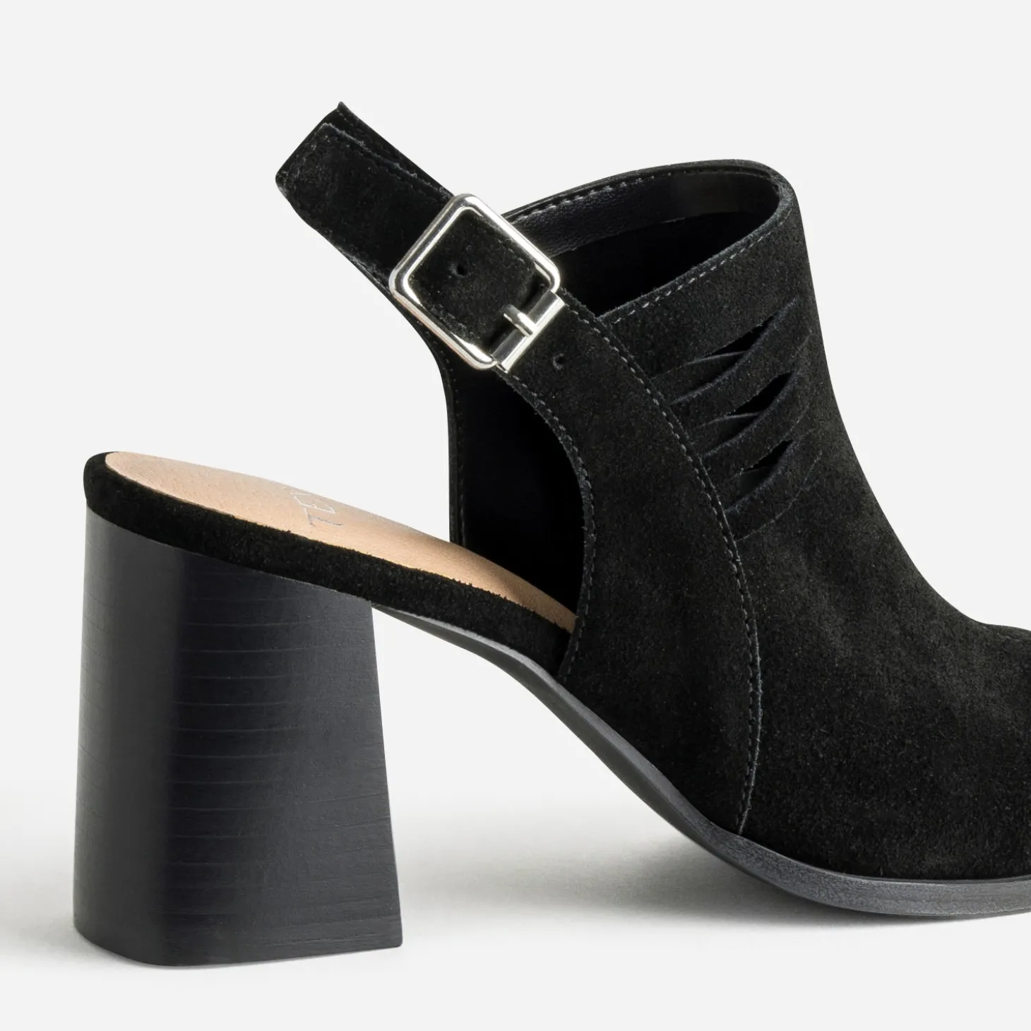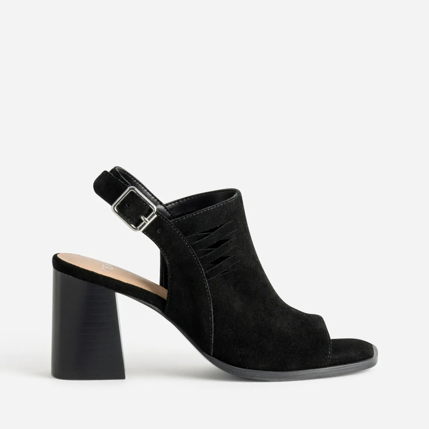 A toutes les impatientes qui rêvent de troquer leurs boots pour des chaussures plus légères, plus aérées, laissez-vous tenter par ce modèle qui couvre le dessus du pied, tout en dévoilant l’avant par une découpe open-toe et l’arrière. En cuir velours noir, cette sandale pour femme défend un style rock affirmé. Elle est montée sur un talon flare de 8 cm et se ferme par une bride côté ; côté rythmé de découpes façon tressage. Un modèle qui fait sens, avec un tee-shirt rock, un jean court sur la cheville et un blouson esprit motard.