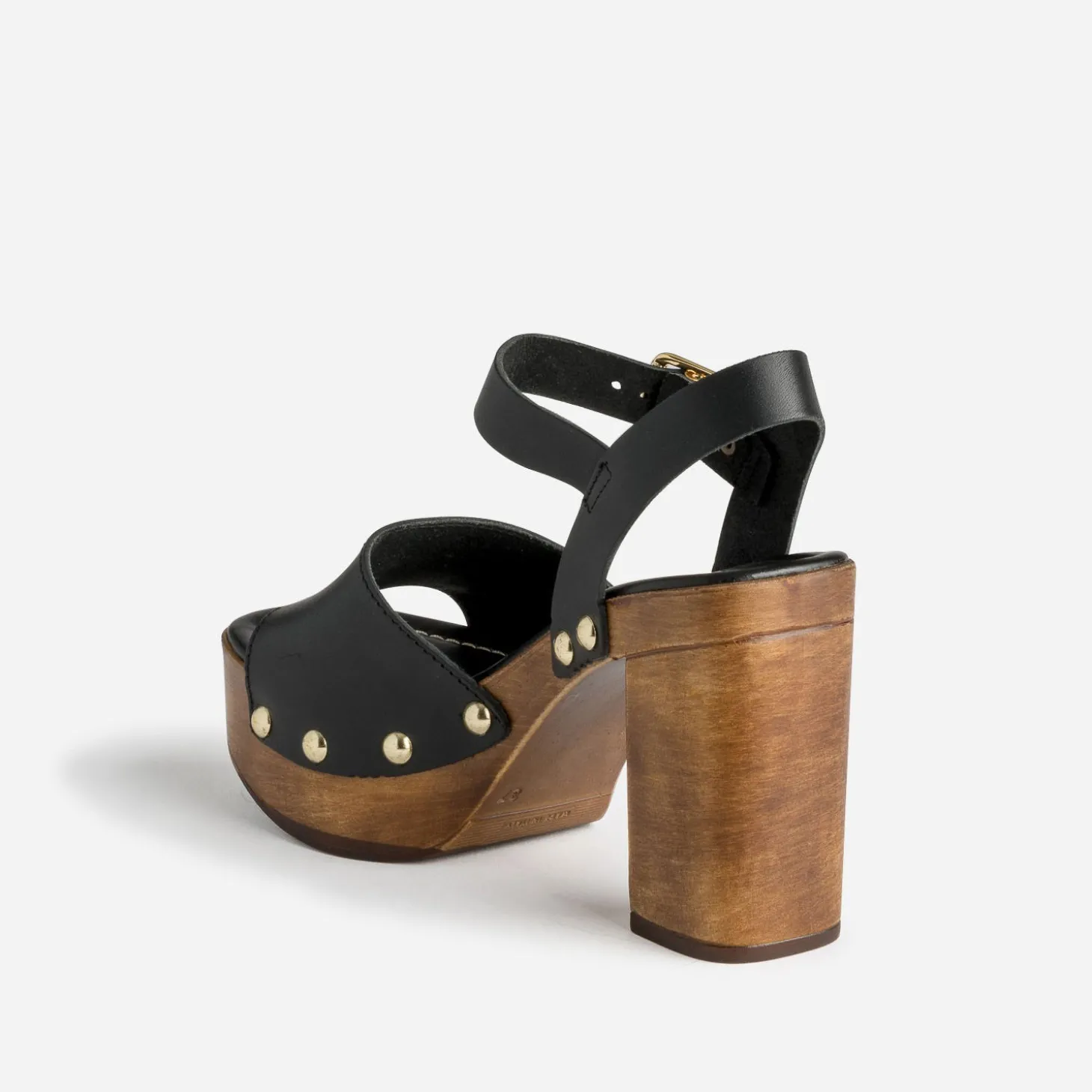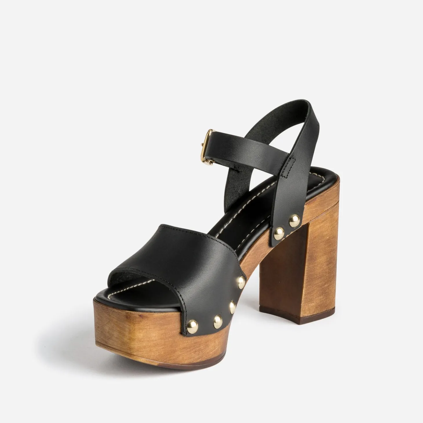 10,5 cm de talon à l’arrière. 3,5 cm de patin à l’avant. Cette sandale pour femme adopte toute l’audace des seventies, par une semelle imitation bois foncé. En cuir noir, la large bride à l’avant et la bride cheville sont maintenues par des clous en métal doré sur les côtés. Allongez encore votre silhouette, avec un top fluide à lavallière, un pantalon flare et une belle capeline.
