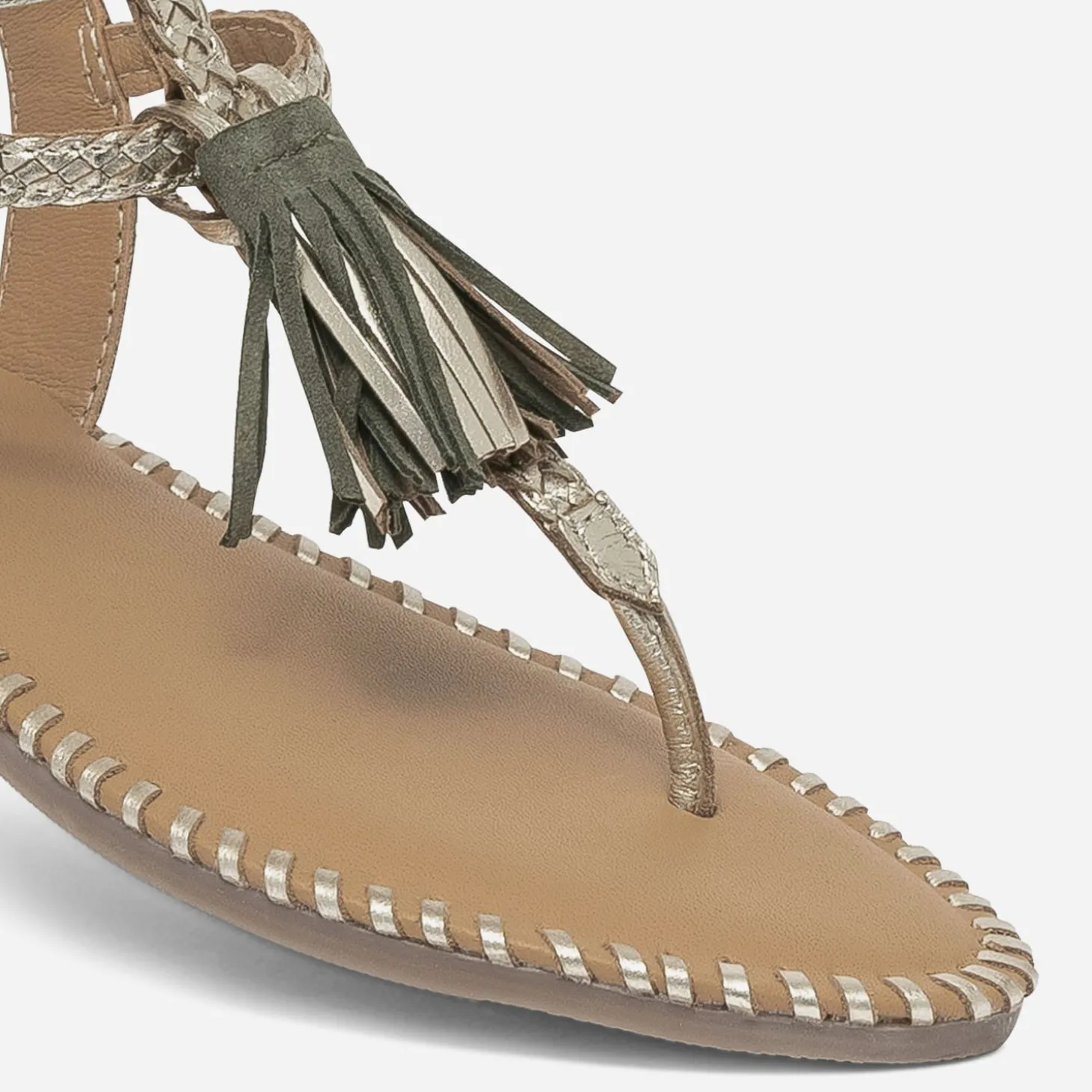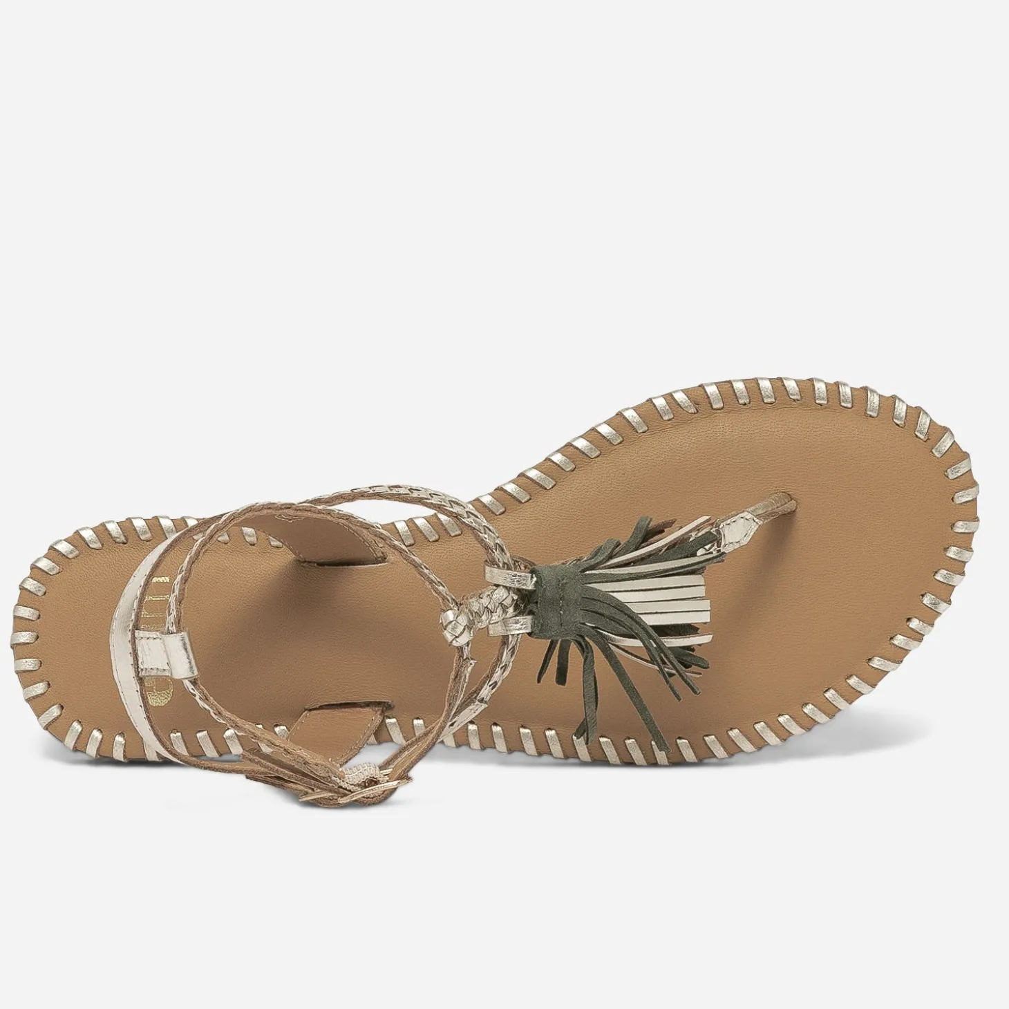 Une allure décontractée parfaitement étudiée. Un chic subtil et raffiné. Un savant mélange de matières maîtrisé. Le style bohème vous séduit ? Apprivoisez-le avec cette sandale-tong pour femme. En cuir doré, elle se démarque par de fines brides délicatement tressées, qui se doublent autour de la cheville. La trépointe est mise en valeur par des coutures régulières et deux pampilles, or et kaki, viennent décorer le dessus du pied. Un modèle à imaginer avec une robe-chemise en lin kaki ou une longue robe beige.