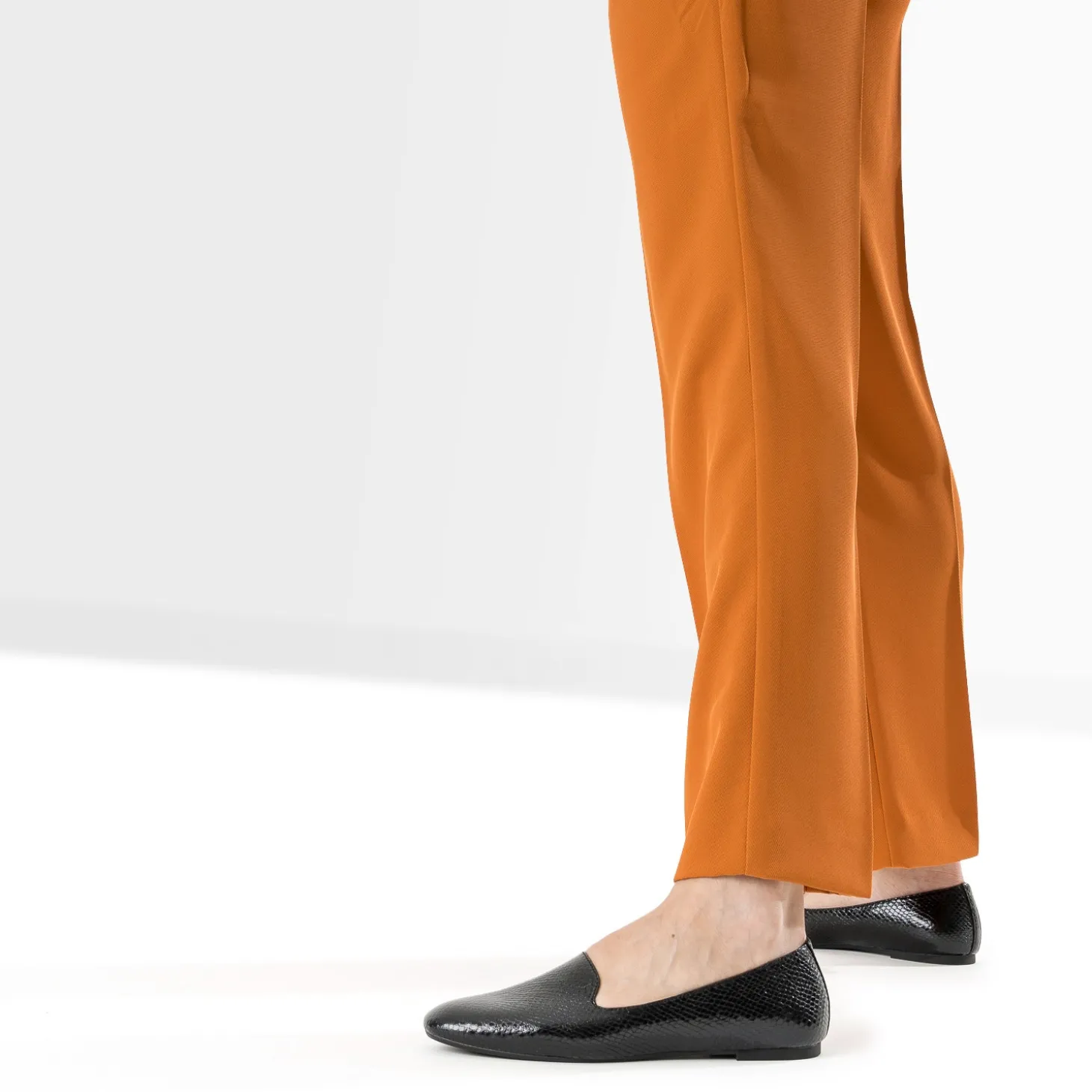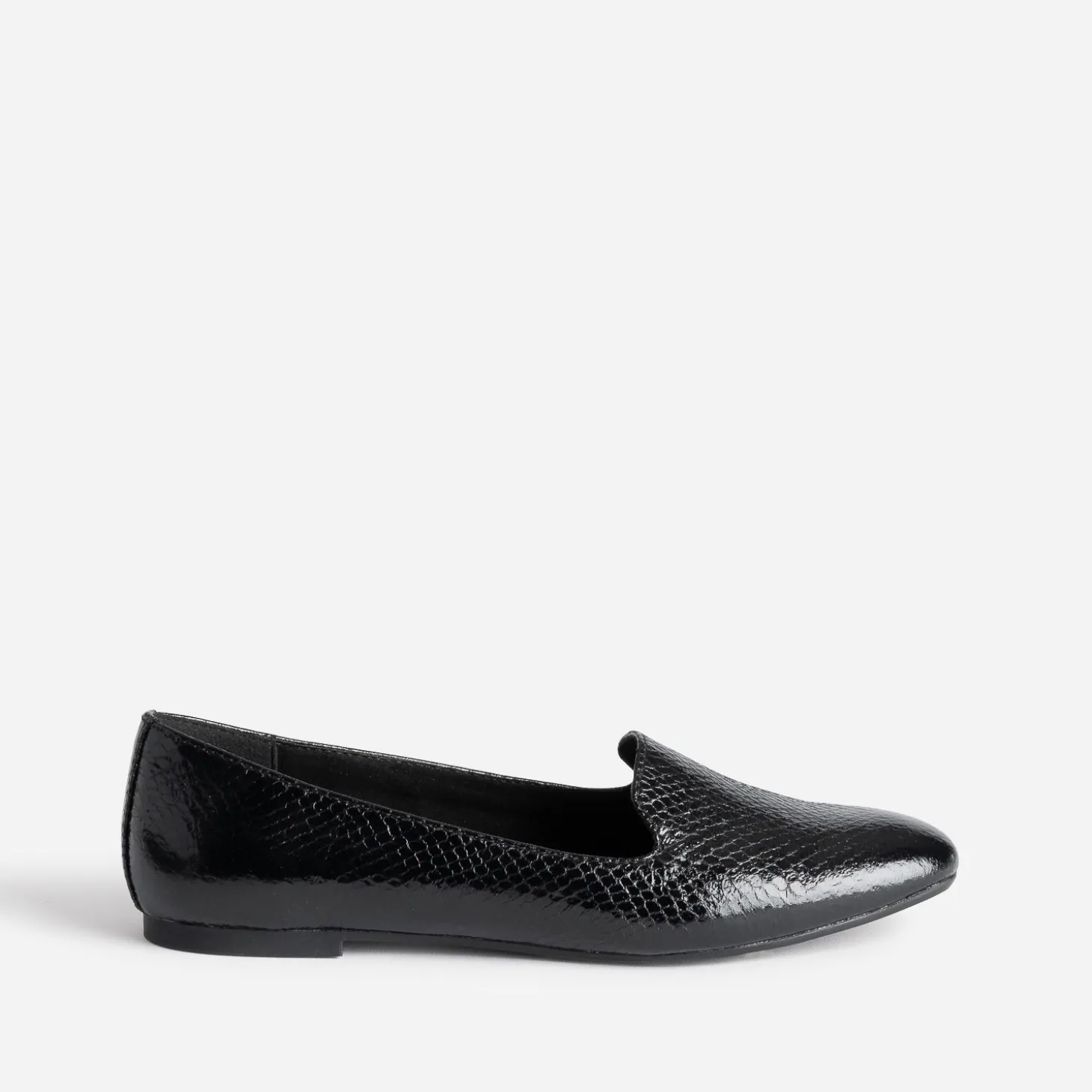 Avec son motif effet python sur finition vernie, ce slipper femme s’invite sur le podium des tendances du moment. En cuir synthétique noir et aussi confortable que des chaussons, il s’enfile en un clin d’œil, de préférence nu-pieds. Renforcez son style preppy, avec un costume noir ou gris.