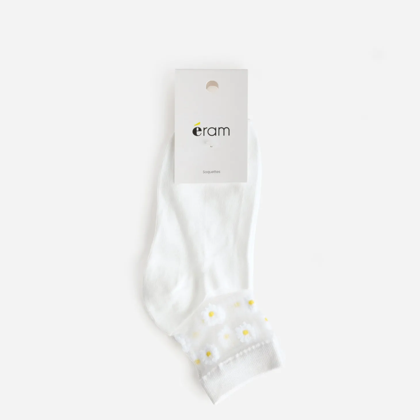 Annoncez l’arrivée du printemps avec une touche de… fun ! A vos pieds, des socquettes blanches, rehaussées d’une partie en voile avec broderies fleurs. Une paire idéale avec des sneakers blanches.