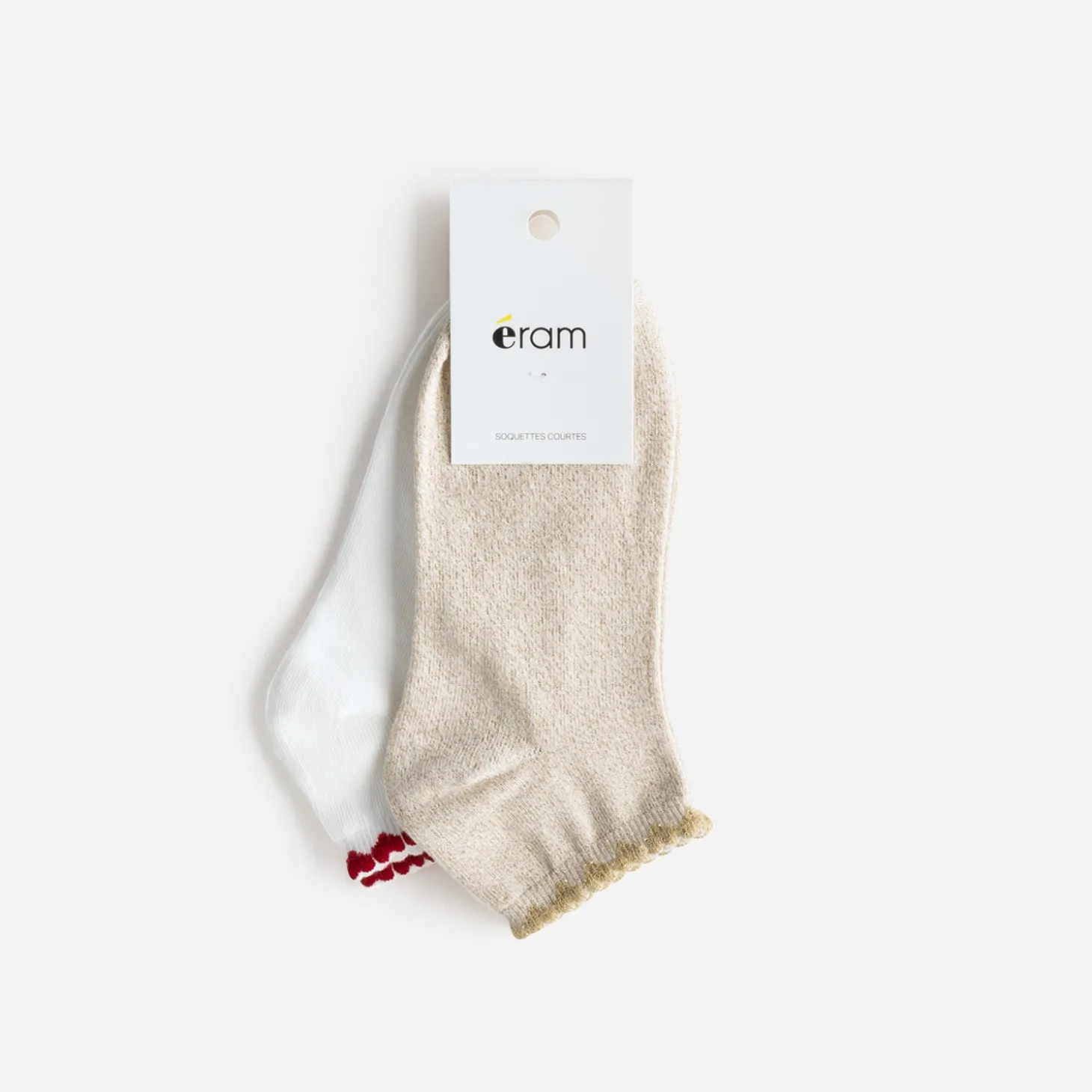 La première est en maille beige avec fils métalliques dorés pour un effet pailleté. La seconde est en maille blanc cassé. Ces deux paires de socquettes sont finalisées par une bordure à motif cœurs, ton sur ton pour l’une et rouge pailleté pour l’autre. Elles méritent d’être montrées, avec une jupe, une robe ou un pantalon avec bas retournés, avec des tennis ou des mocassins.