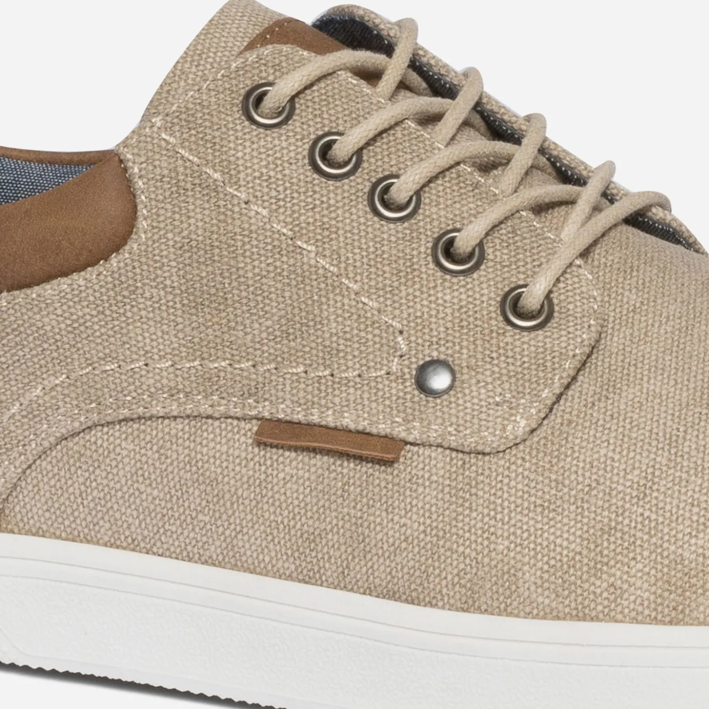La toile de jean fait partie intégrante du dressing masculin. Elle inspire cette tennis pour homme, confectionnée dans un textile beige effet chiné, bordé de synthétique camel sur le bord de la tige. La ligne épurée assure un côté sobre et casual. Un modèle à associer avec une chemise en jean et un pantalon chino beige.