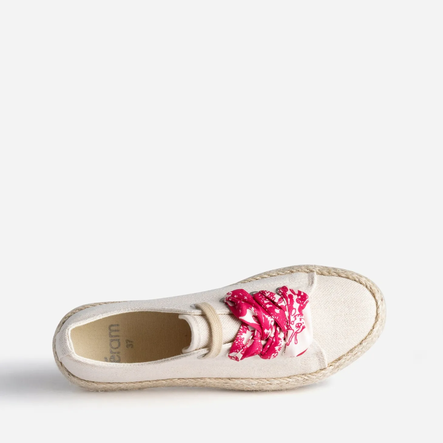 Mi-tennis mi-espadrille, cette sneakers s’invite dans votre shoesing d’été. En toile beige, elle se démarque par un effet pailleté et est montée sur une semelle à plateforme de 3 cm recouverte de corde. Sa particularité : elle est livrée avec deux lacets, l’un plat de couleur beige, et l’autre façon foulard, rythmé d’un imprimé rose façon toile de Jouy. Portez-la au quotidien avec un jean boyfriend de couleur et un sweat à message.