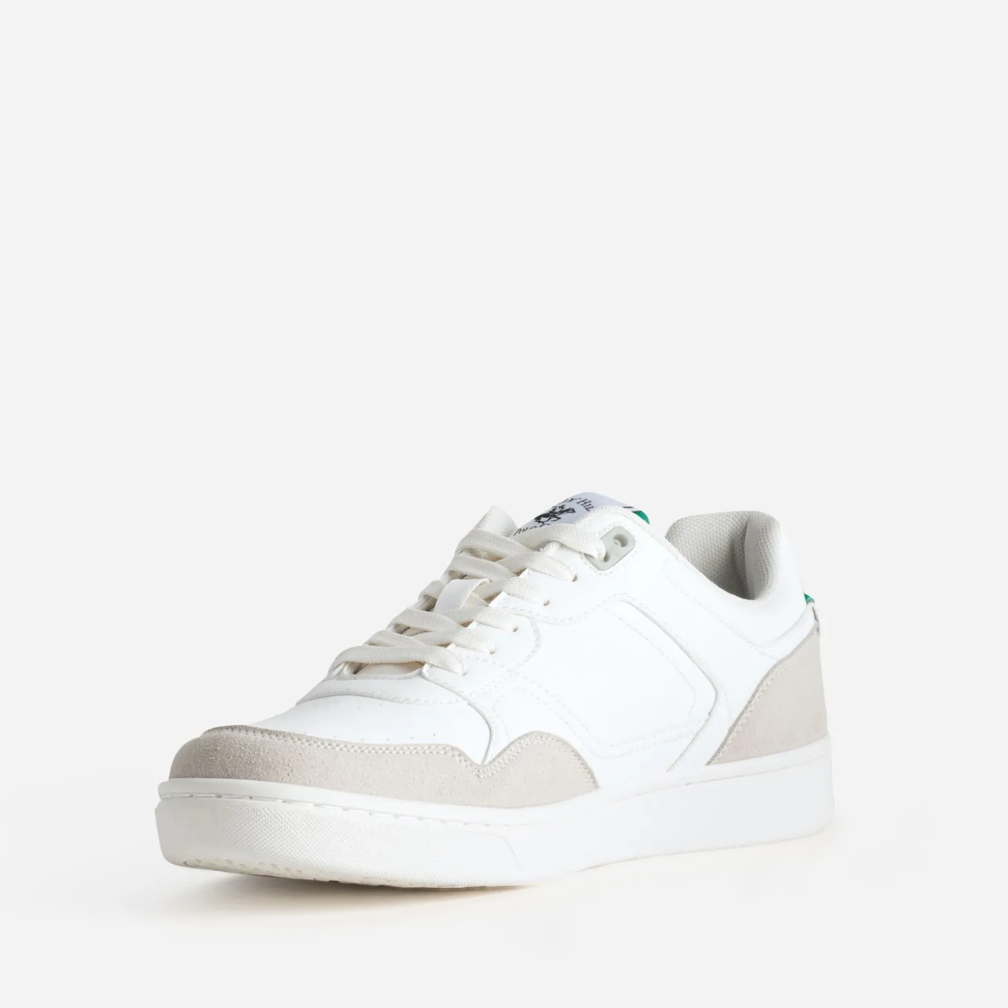 Cette tennis pour homme est une proposition simple, dans l’air du temps. En matière synthétique lisse, elle est soulignée de détails beiges et d’un contrefort vert vif. Les logos rythment la languette par une étiquette tissée, le côté par une broderie, l’arrière par un marquage métallisé. Un modèle à préférer avec une tenue décontractée, polo blanc et pantalon chino beige.