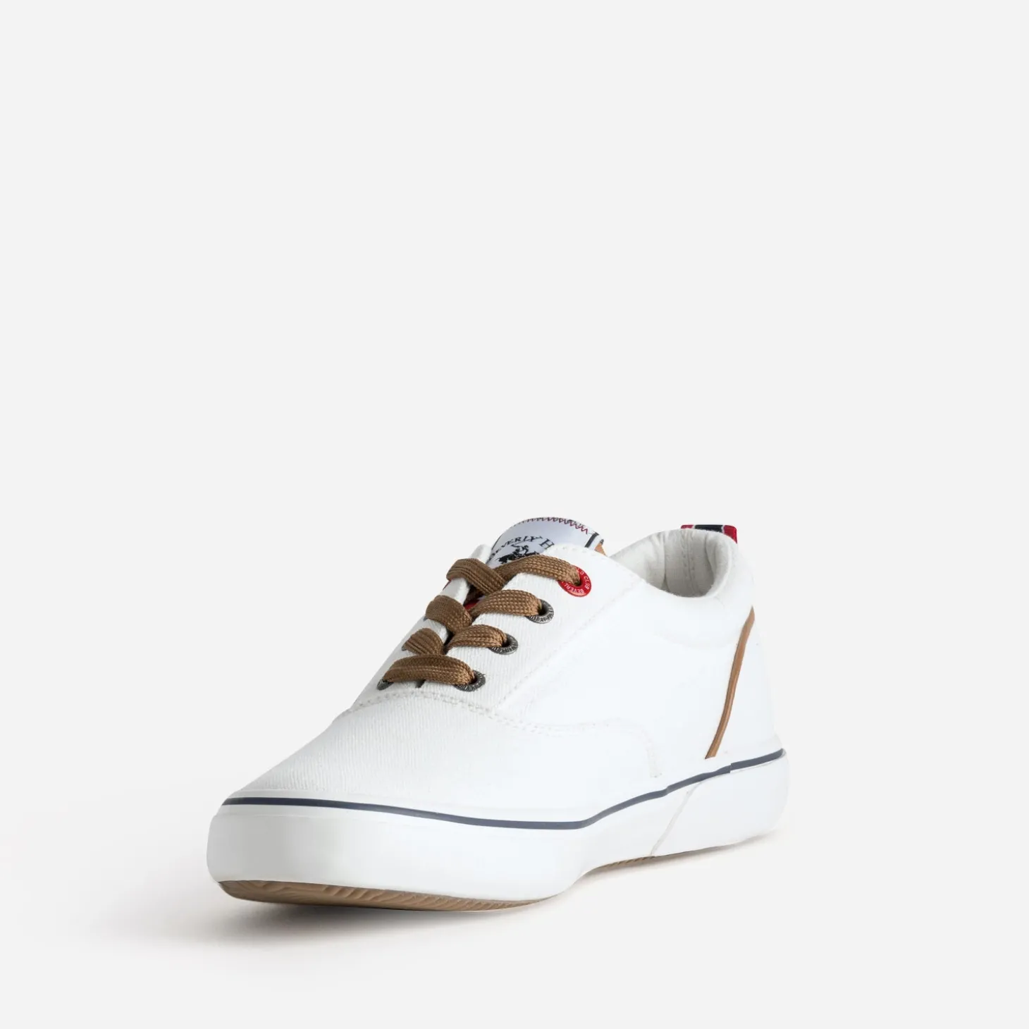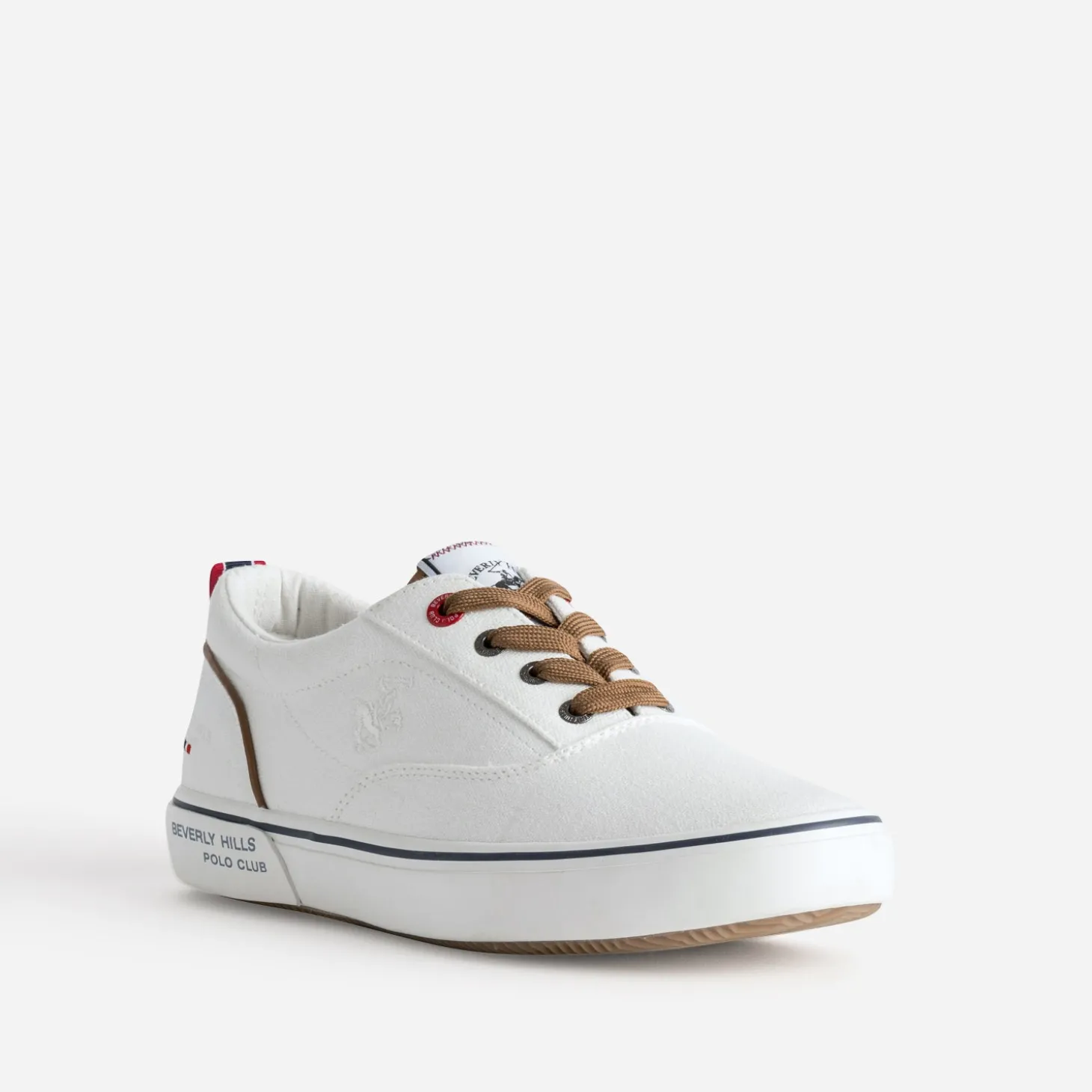 La tennis en toile est un modèle incontournable du shoesing d’été. Ecrue, elle se ferme par un lacet marron, en écho au biais qui souligne le contrefort. Sur la languette, sur le côté, le logo cavalier emblématique s’impose version étiquette tissée ou broderie. Un modèle idéal, en vacances ou en week-end, avec un polo blanc et un bermuda chino beige ou bleu marine.