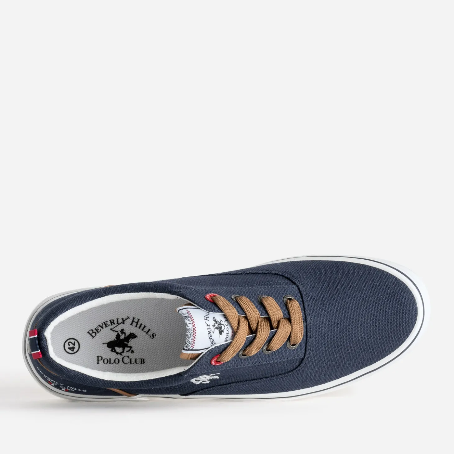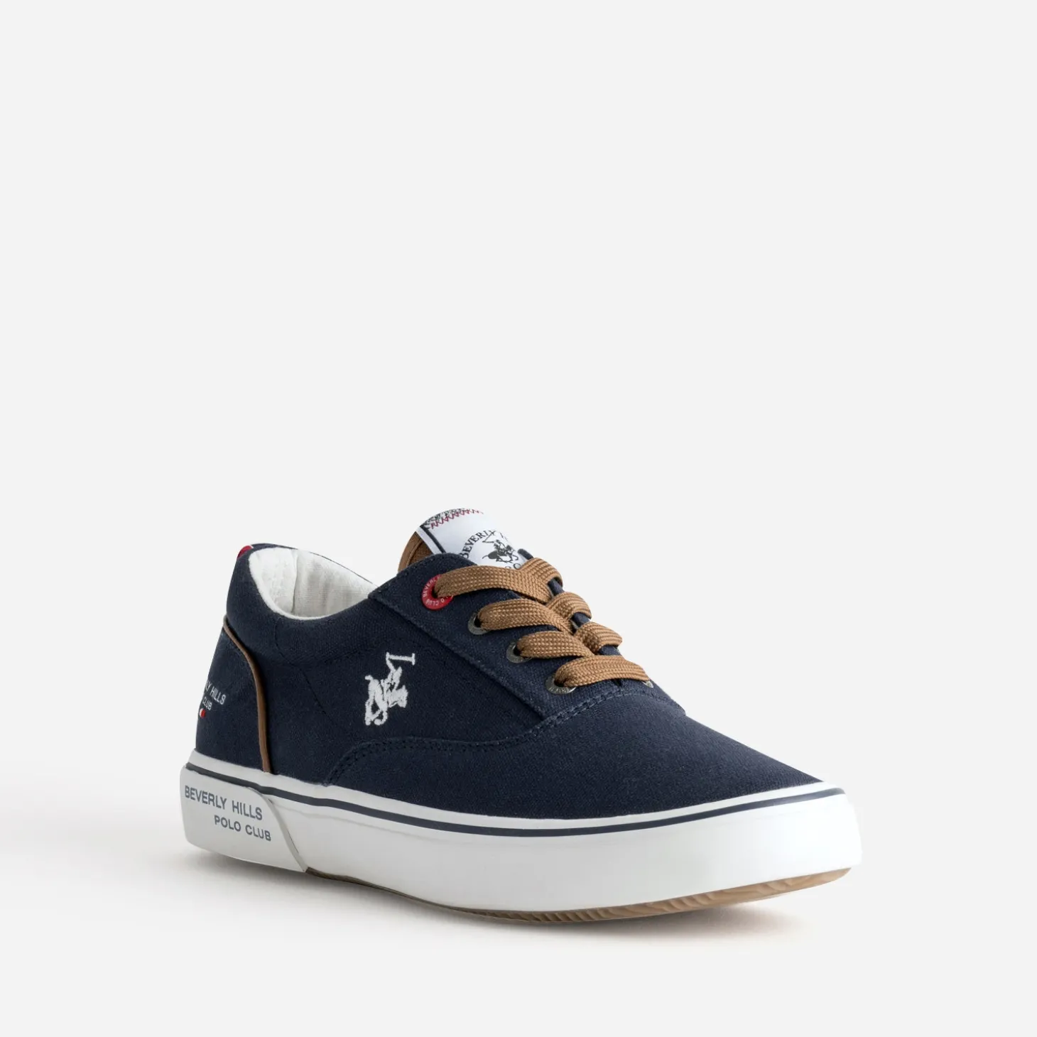 La tennis en toile est un modèle incontournable du shoesing d’été. Bleu marine, elle se ferme par un lacet marron, en écho au biais qui souligne le contrefort. Sur la languette, sur le côté, le logo cavalier emblématique s’impose version étiquette tissée ou broderie. Un modèle idéal, en vacances ou en week-end, avec un polo bleu et un bermuda en jean brut.