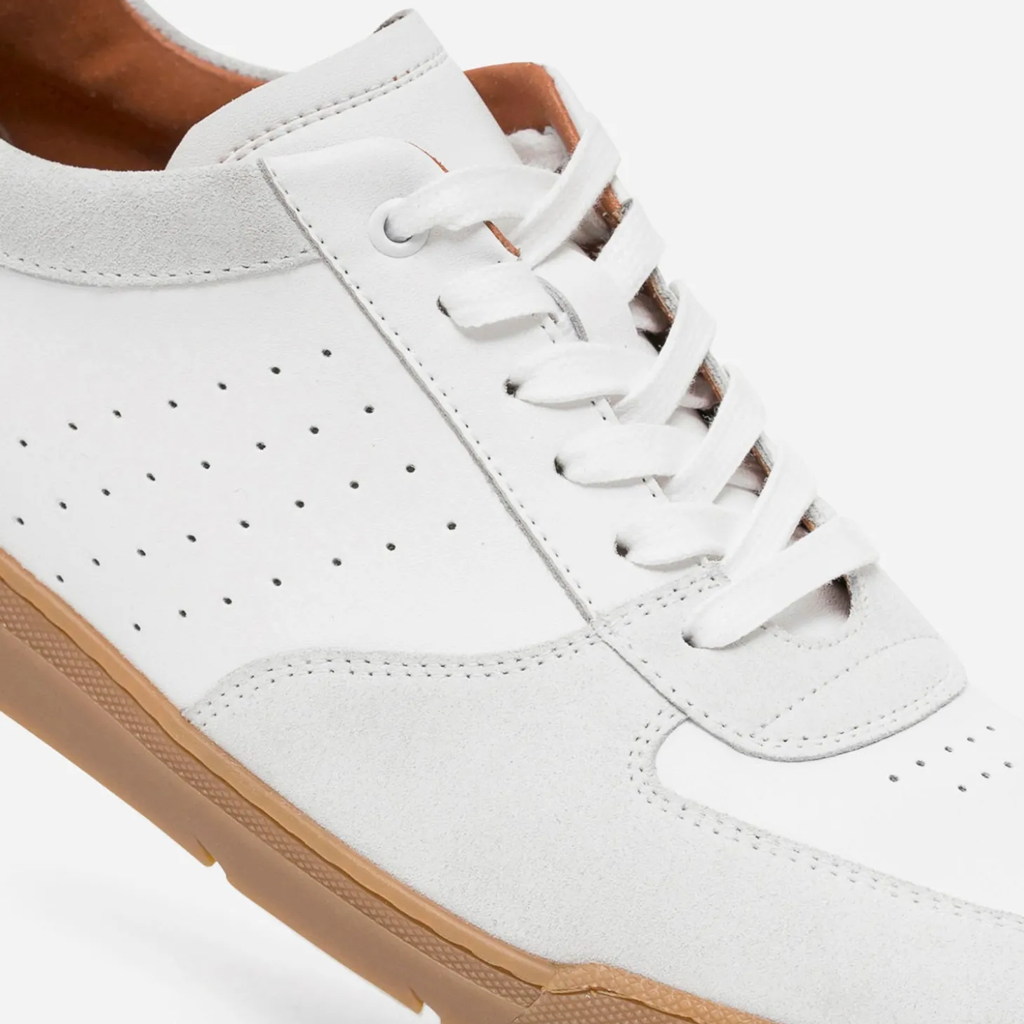 100% cuir blanc, cette tennis pour homme se laisse bousculer par des empiècements en cuir velours gris clair. La doublure et la première en cuir camel font écho à la semelle extérieure contrastée. Un modèle idéal en toutes saisons, avec un look chic comme plus décontracté.
