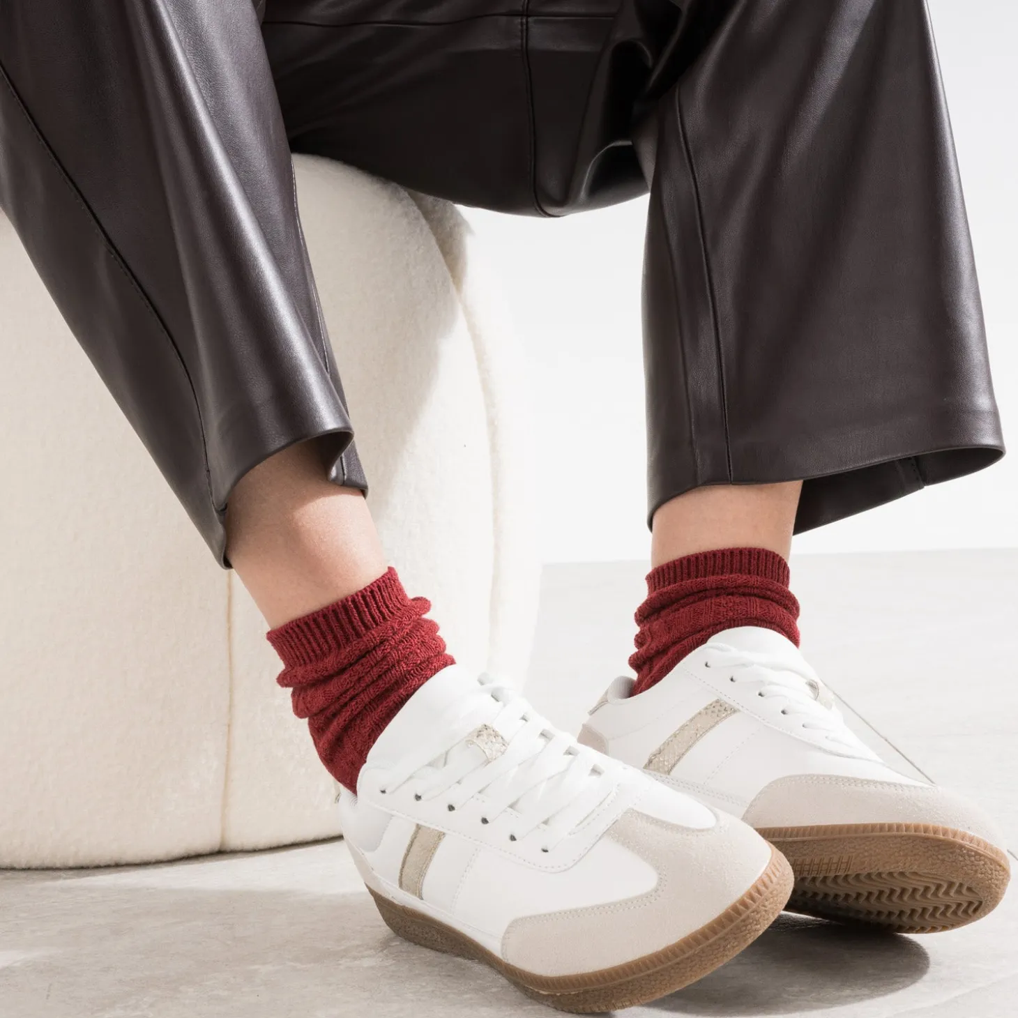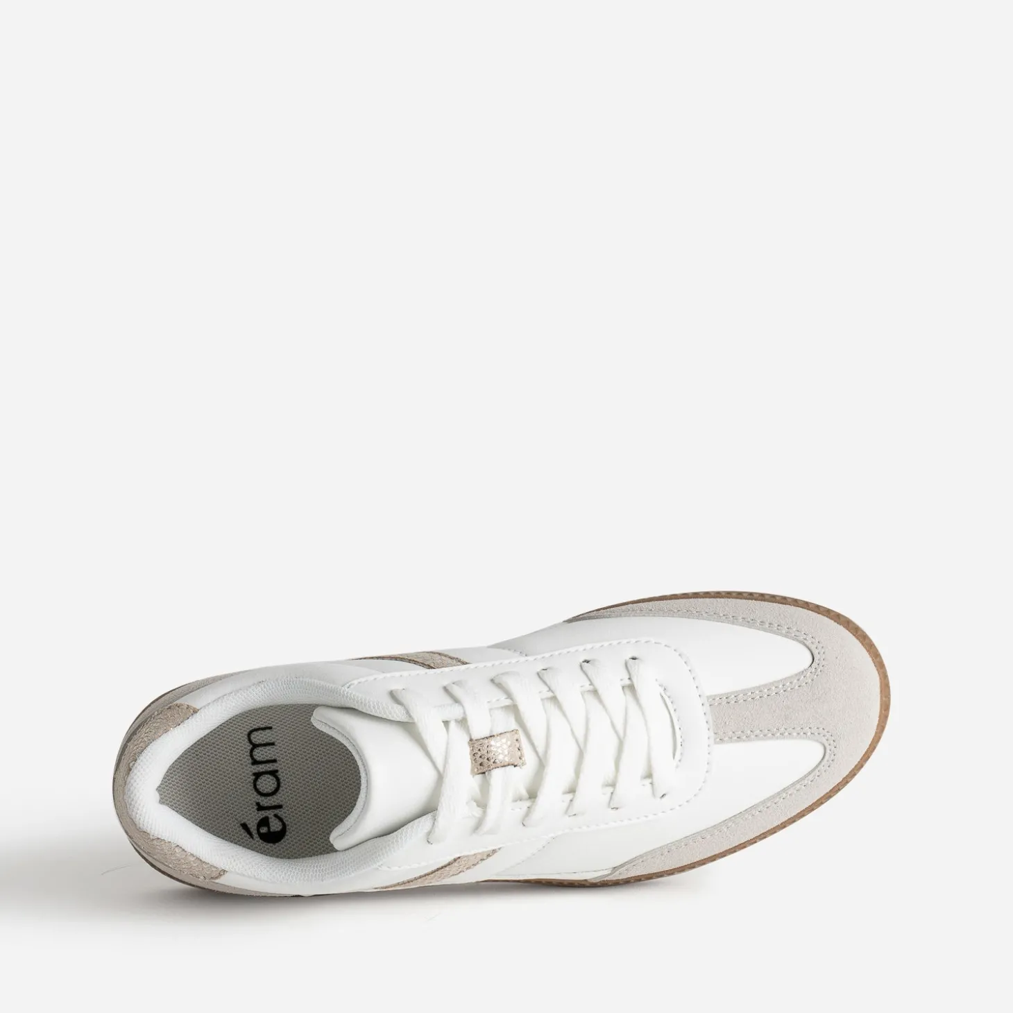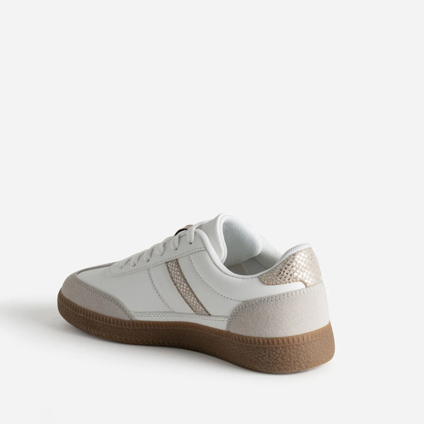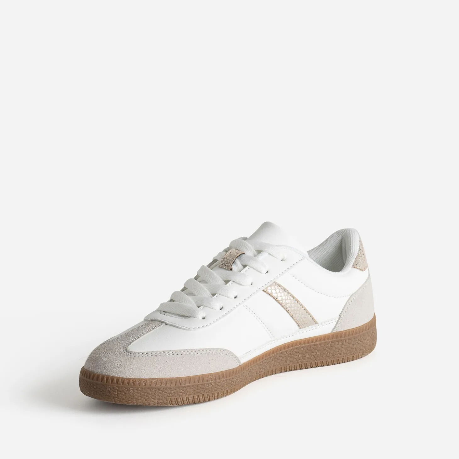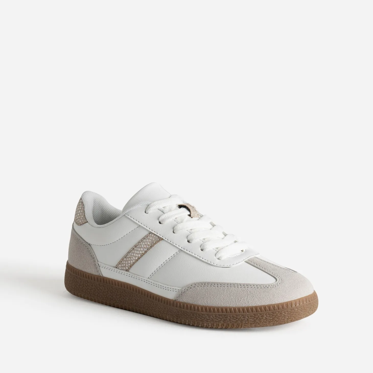 Une chose est sûre : cette tennis femme sera à tous les pieds cette saison. Elle combine le blanc et le gris taupé, dans un accord de matières synthétiques lisses et suédées parfaitement étudié. Des empiècements beige avec effet python argenté subliment les côtés et le contrefort. Elle est montée sur une semelle beige foncé. Un modèle qui s’invite autant avec une robe longue noire à fines bretelles qu’avec un débardeur blanc et un pantalon large noir.